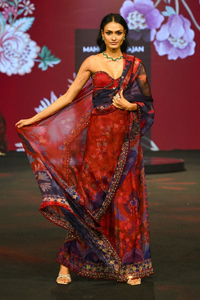 Our signature corset with embellished bust and waist cinching drawstringspaired with an organza Lehenga and heavily embellished dupatta in Aquamarine.