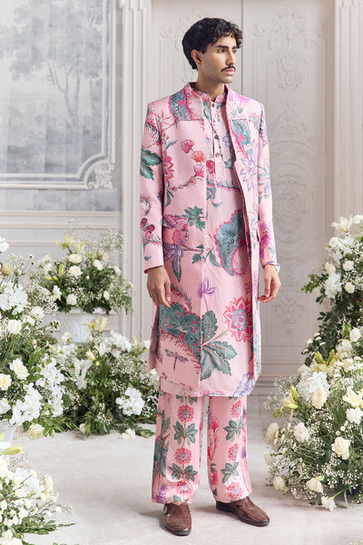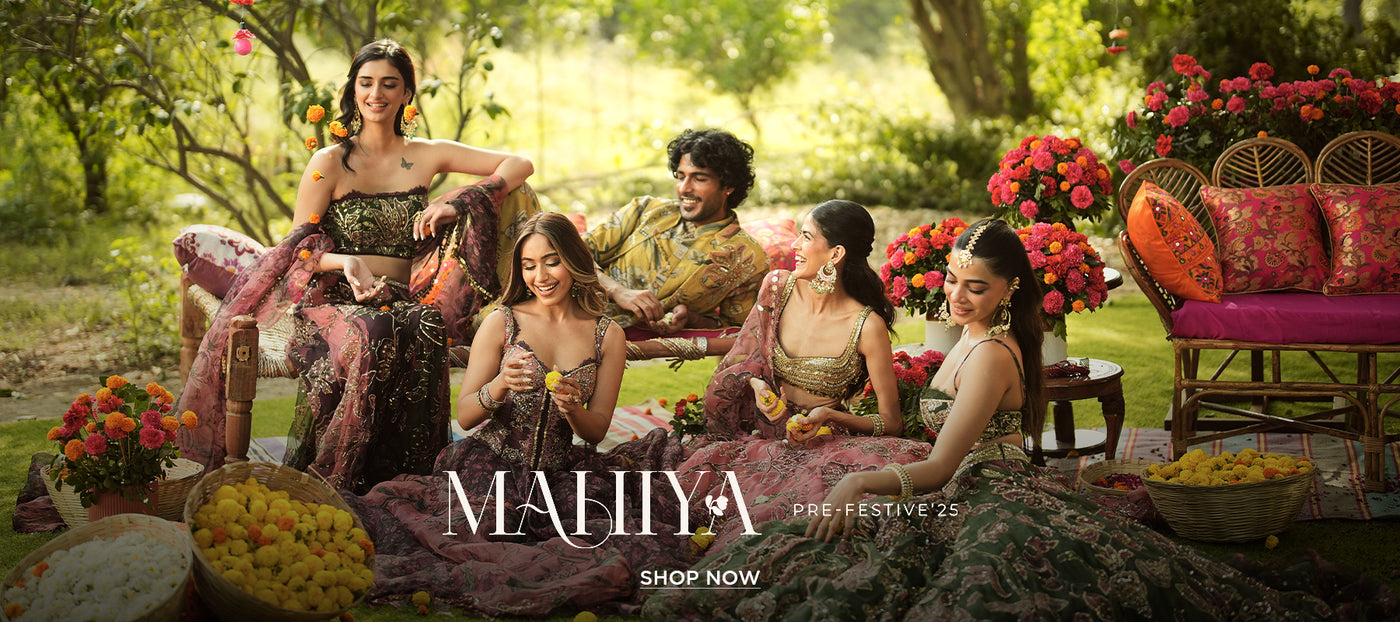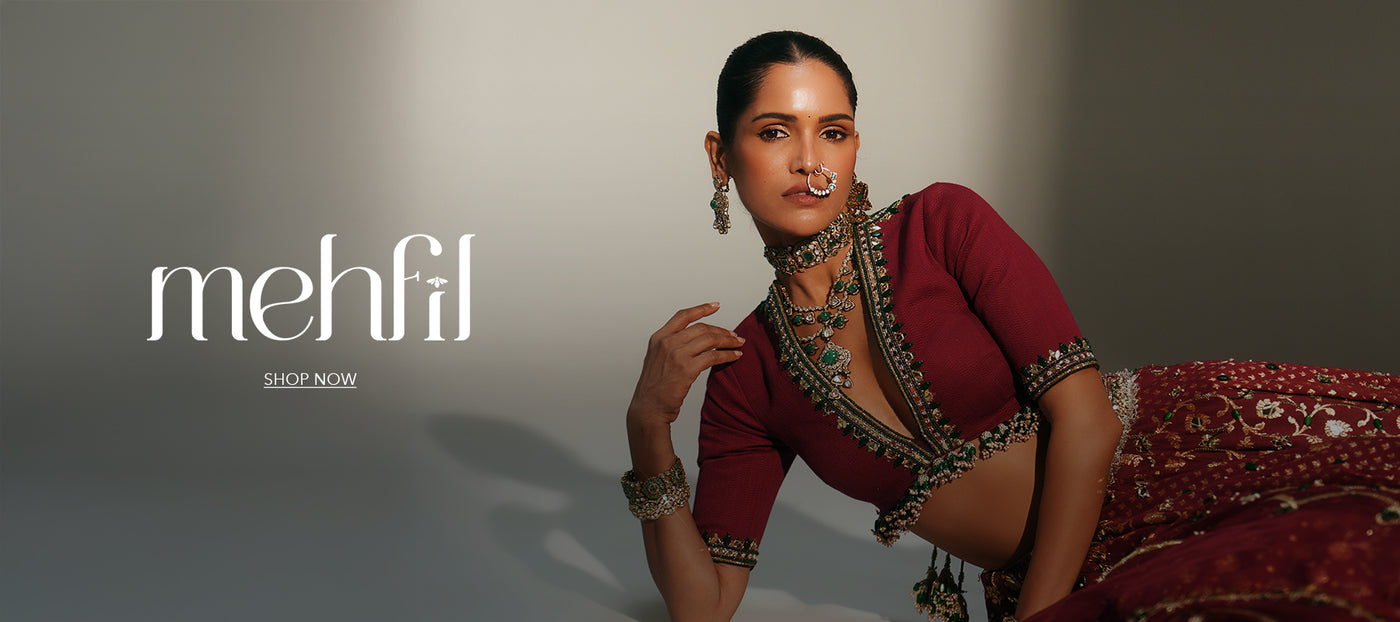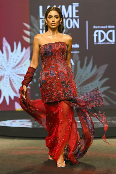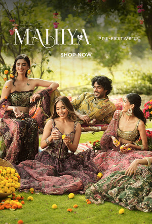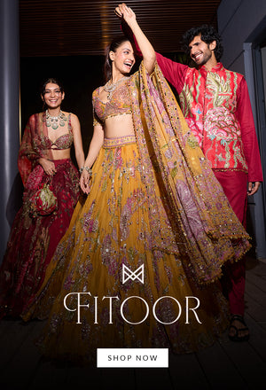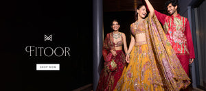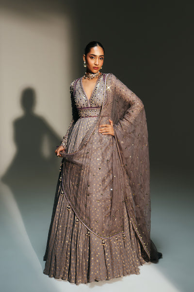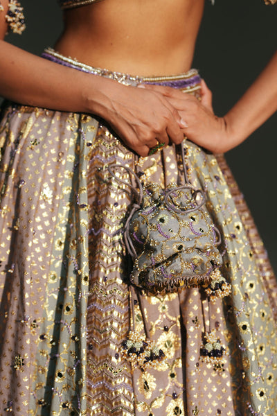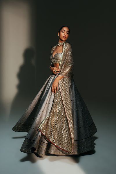Our signature corset with embellished bust and waist cinching drawstringspaired with an organza Lehenga and heavily embellished dupatta in Aquamarine.