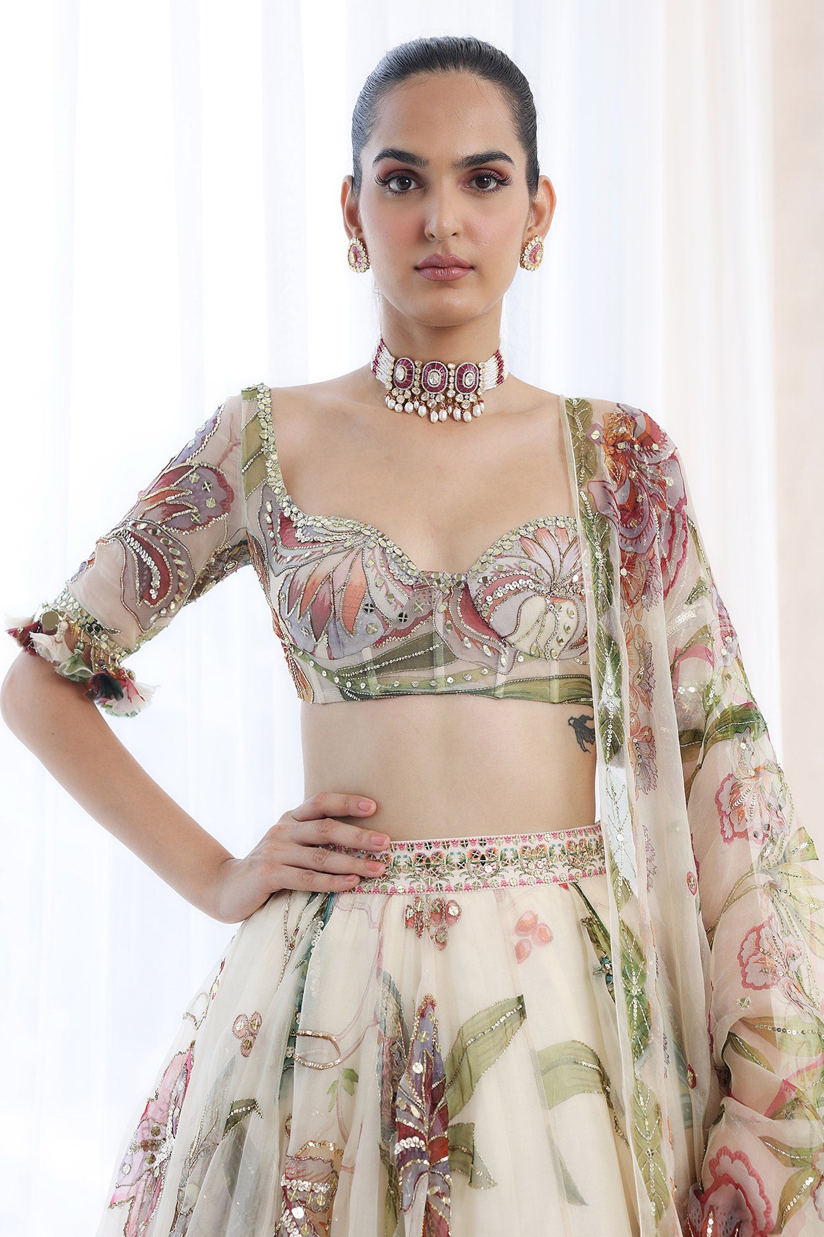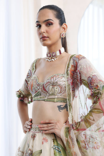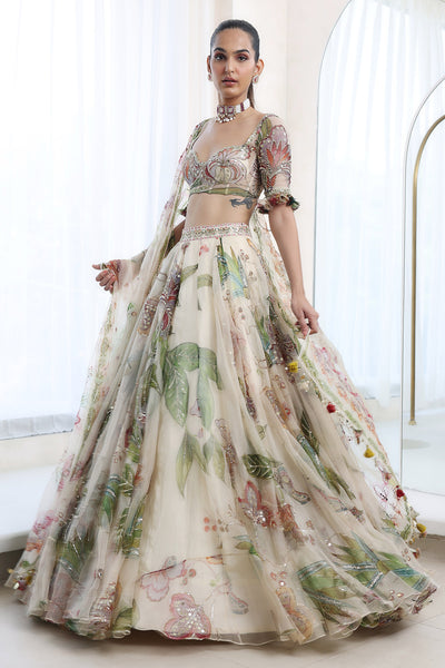 Printed embroidered blouse with lehenga and dupatta
