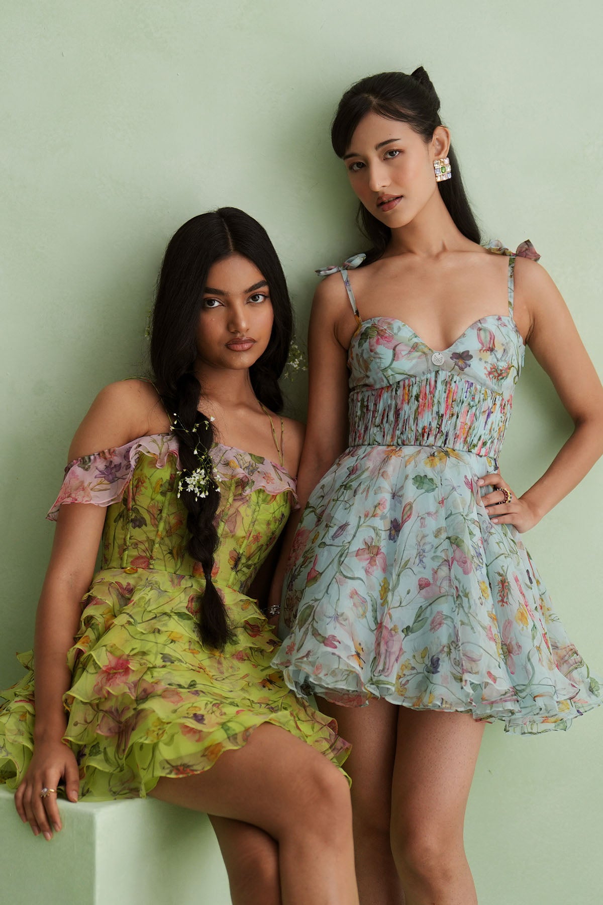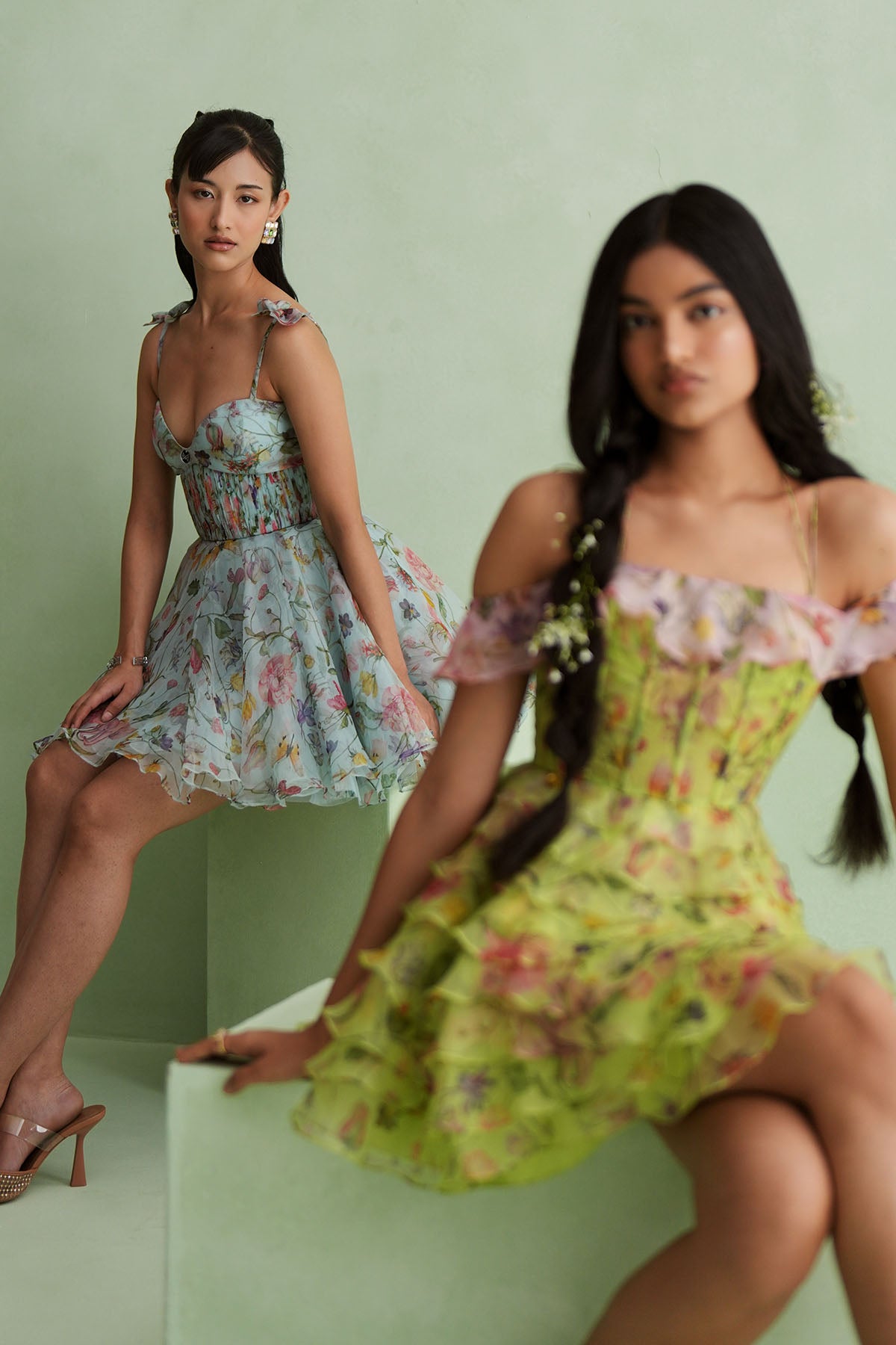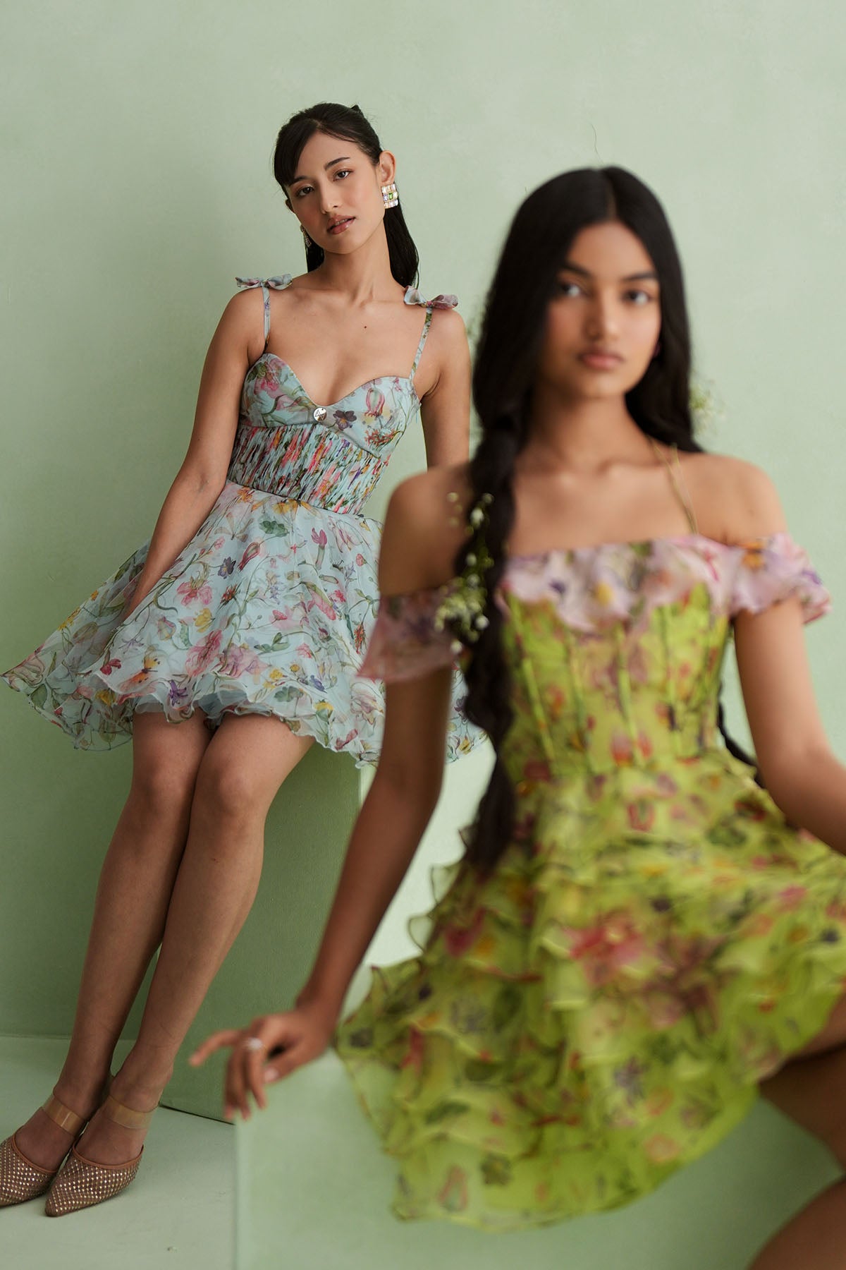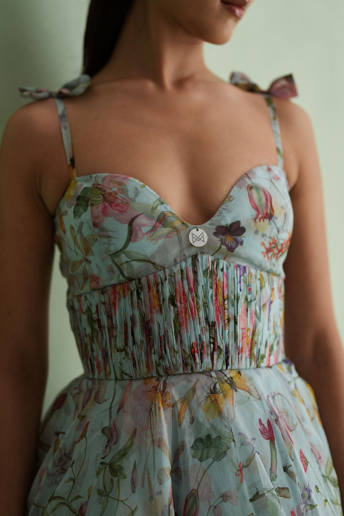 Pastel Light-Blue Floral Mini Dress With A Soft, Romantic Aesthetic. It Features A Sweetheart Neckline With Thin Shoulder Straps That Tie Into Small Bows.The Dress Includes A Lace-Up Corset Closure