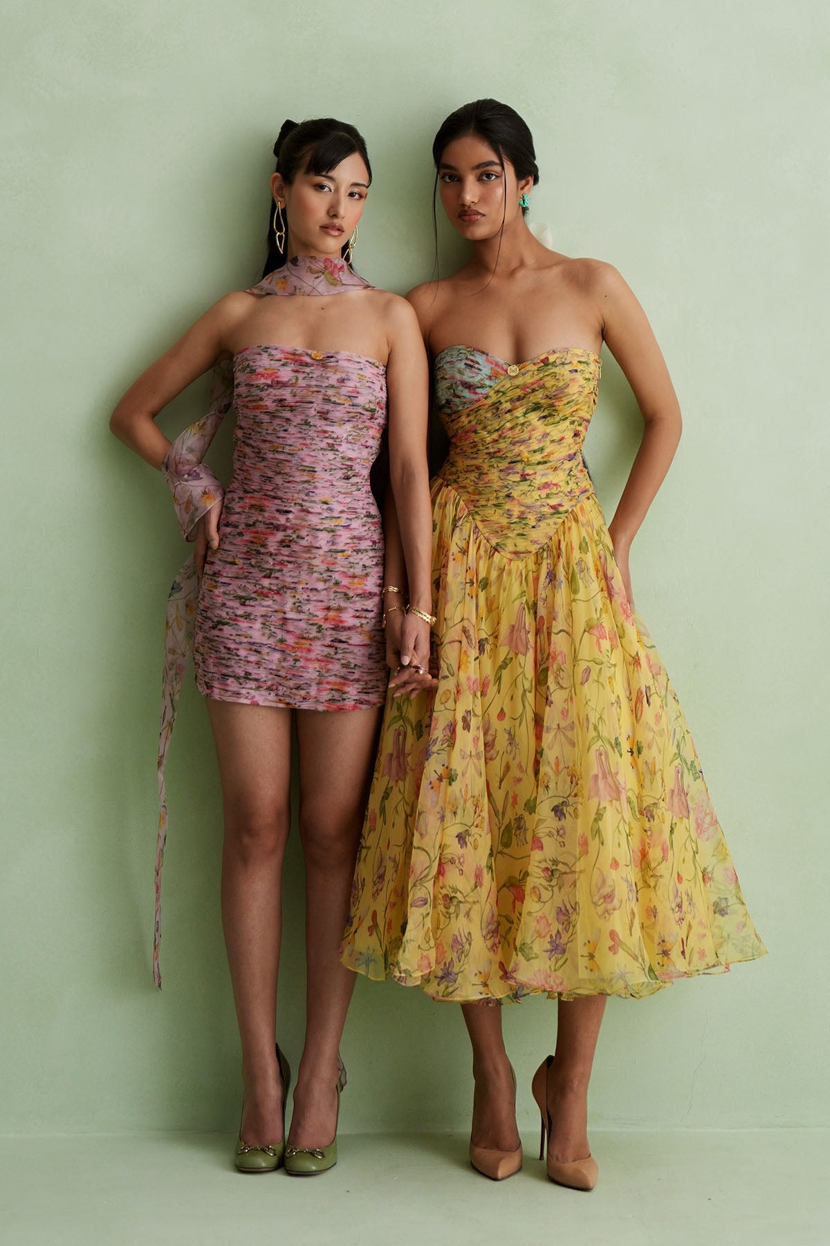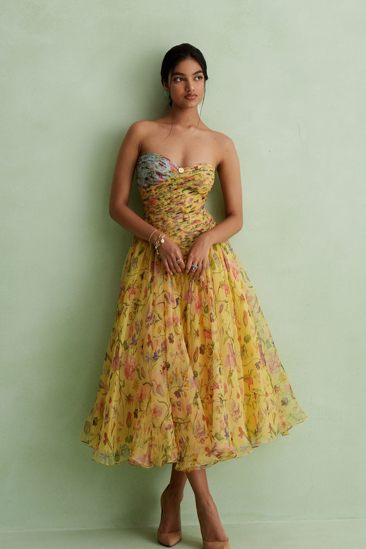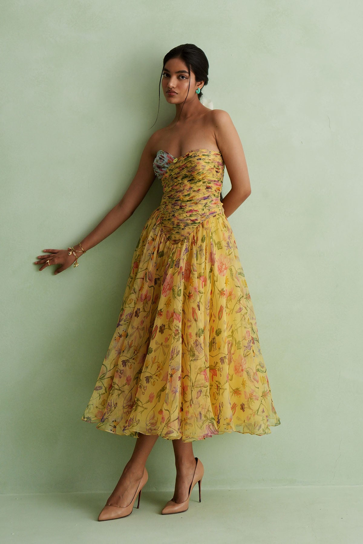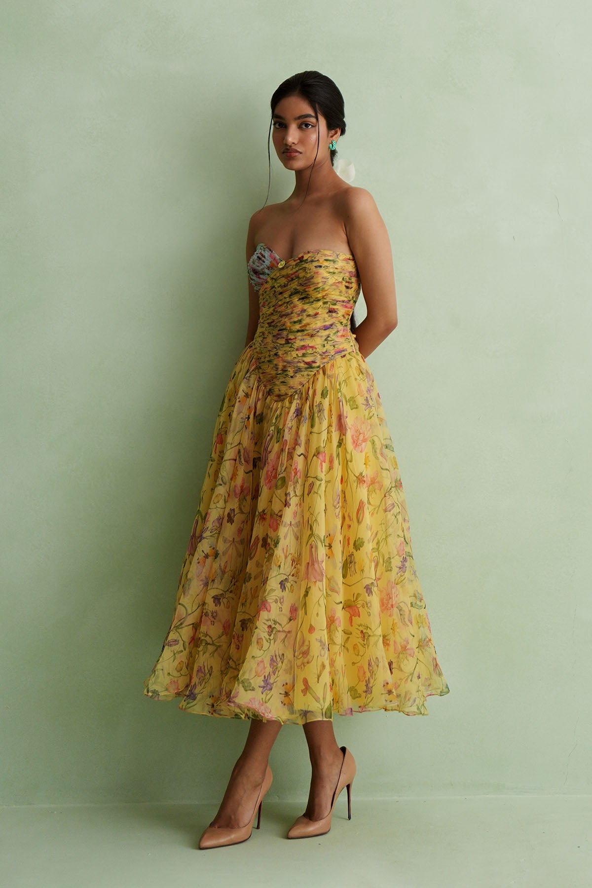 Ruched Bodice Midi Dress ,Features A Soft Sweetheart Neckline With Two-Tone Detailing At The Bust. The Dress Opens Into A Full, Flared Skirt. Warm Yellow Tone With A Delicate Botanical Print Of Blooming Flowers And Vines