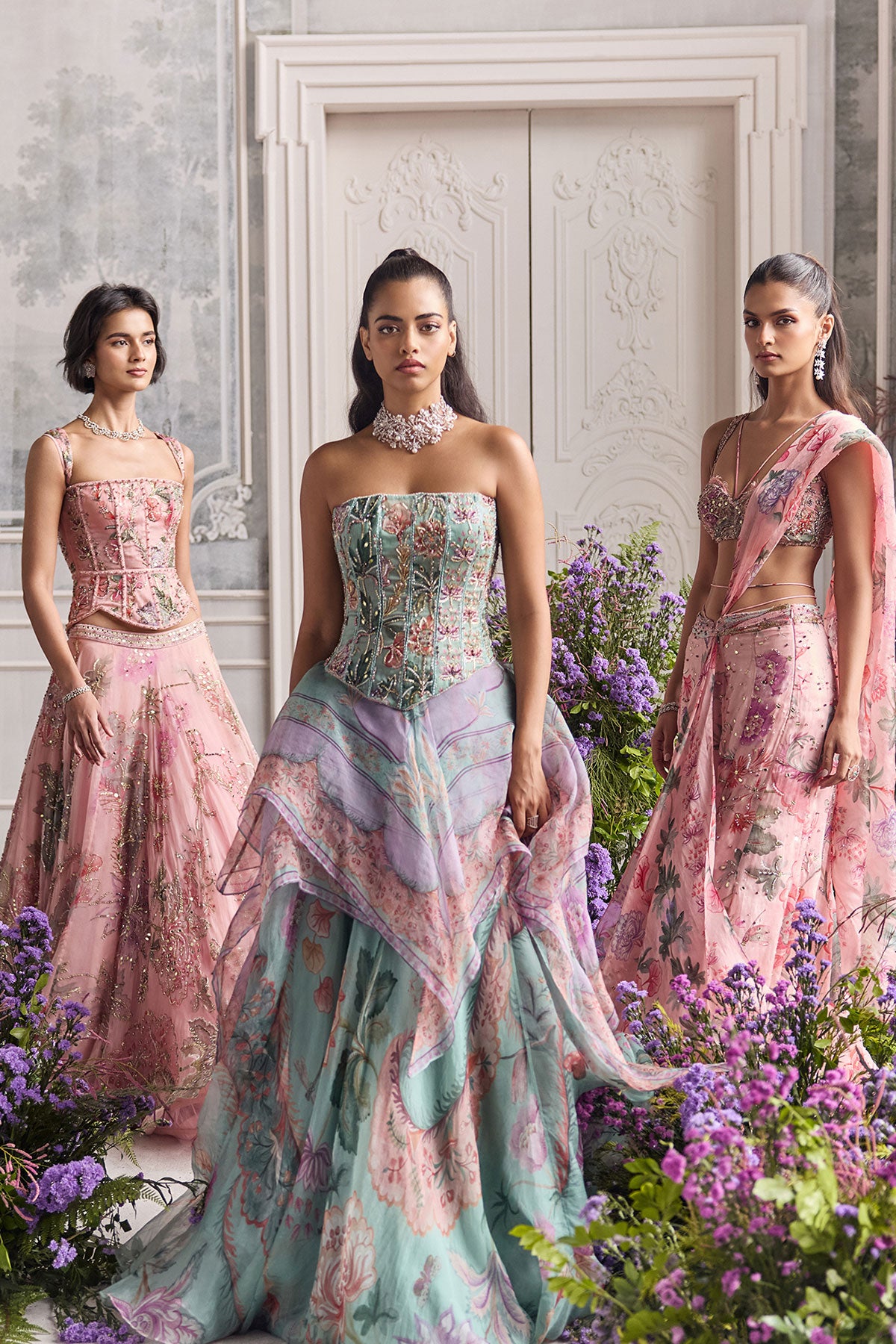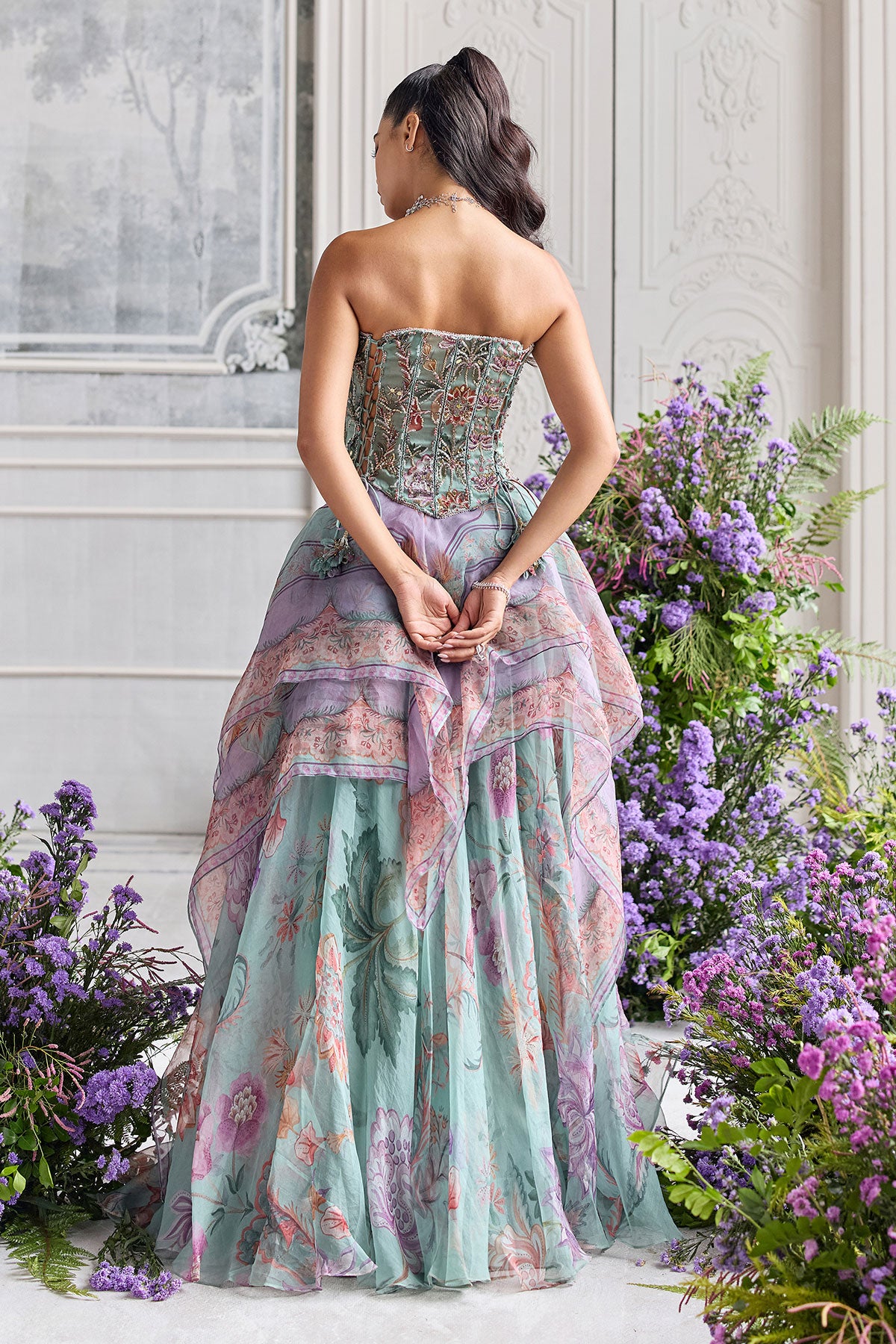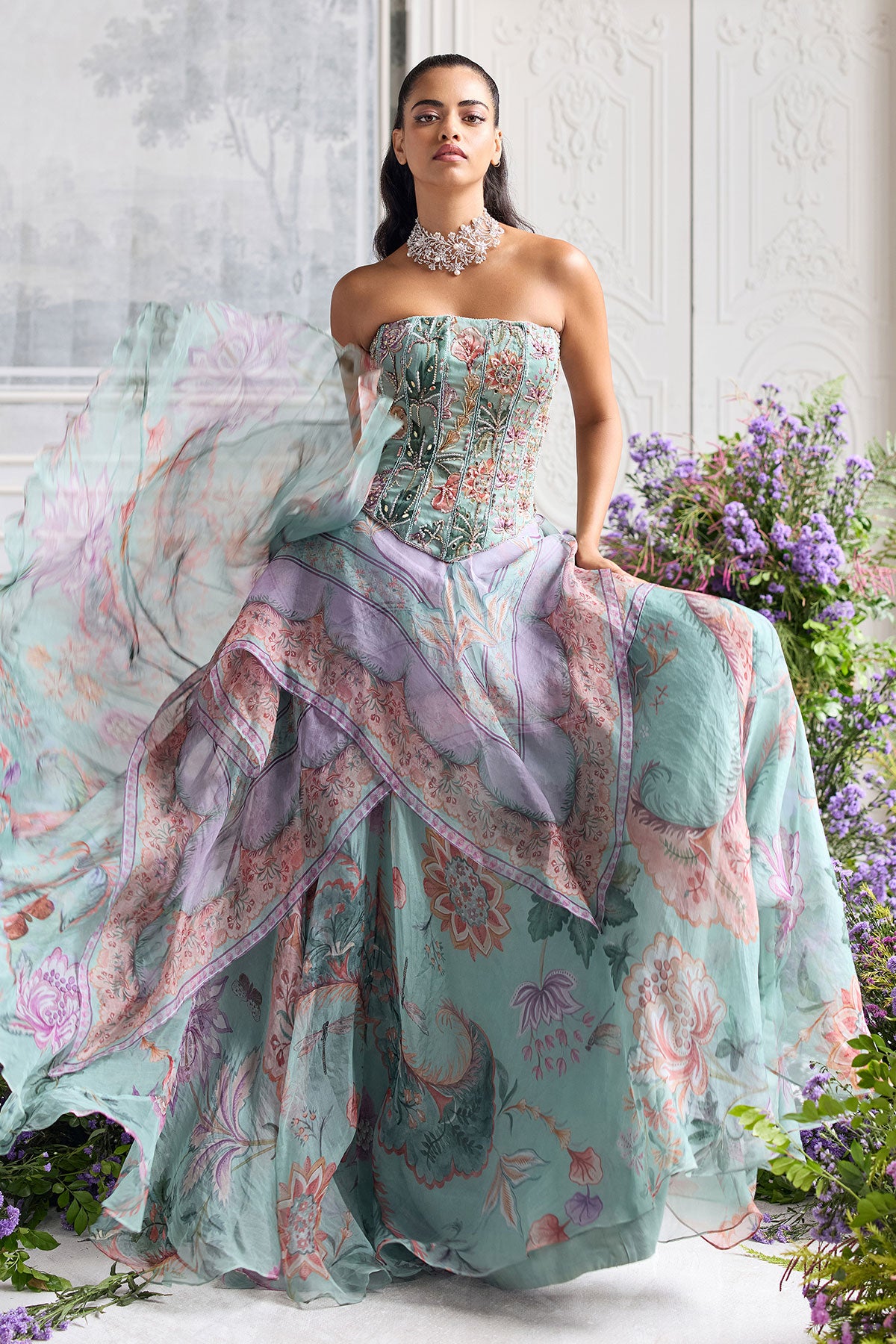 HAND EMBROIDERED CORSET TOP PAIRED WITH FLORAL ASYMMETRICAL SKIRT