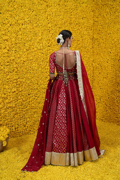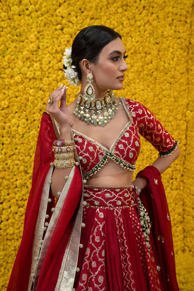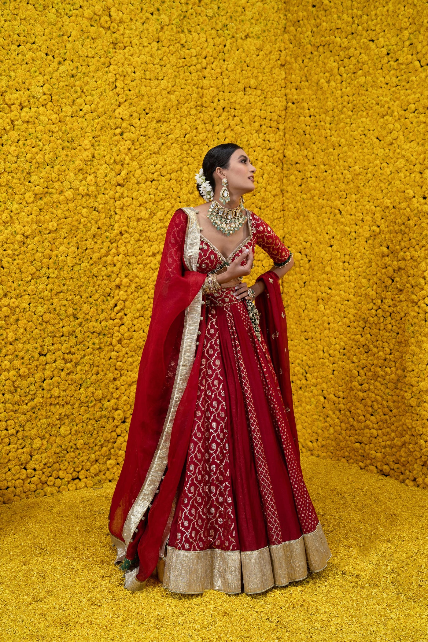Red embroidered blouse with tassels, banarsi chanderi embroidered lehenga and organza dupatta with tassels.