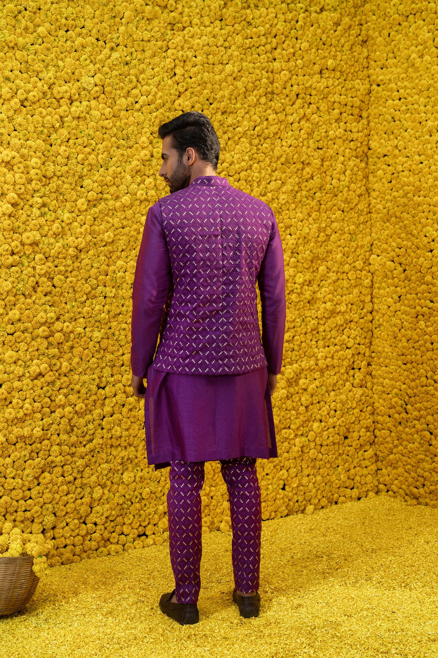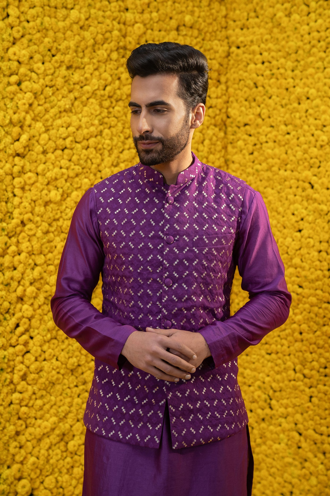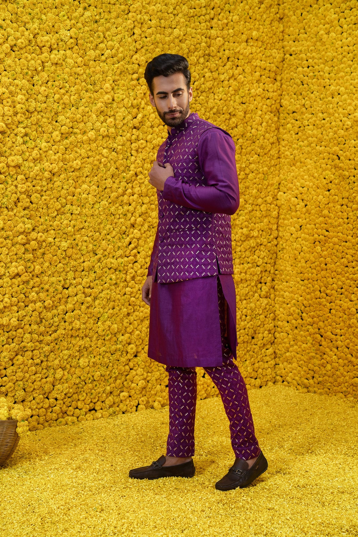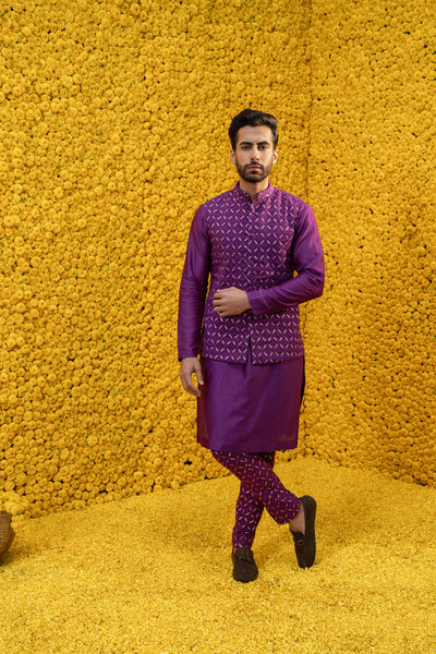 Purple kurta with chudidar and bandi jacket