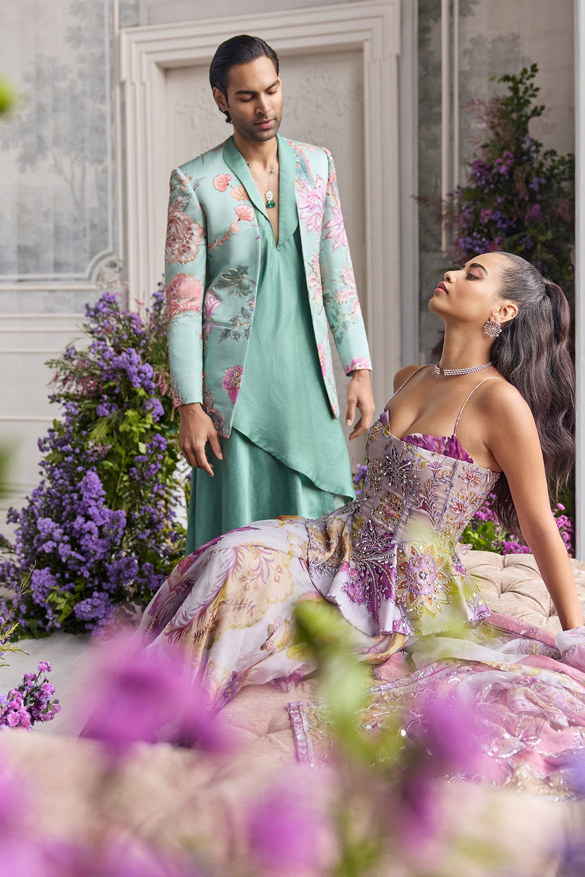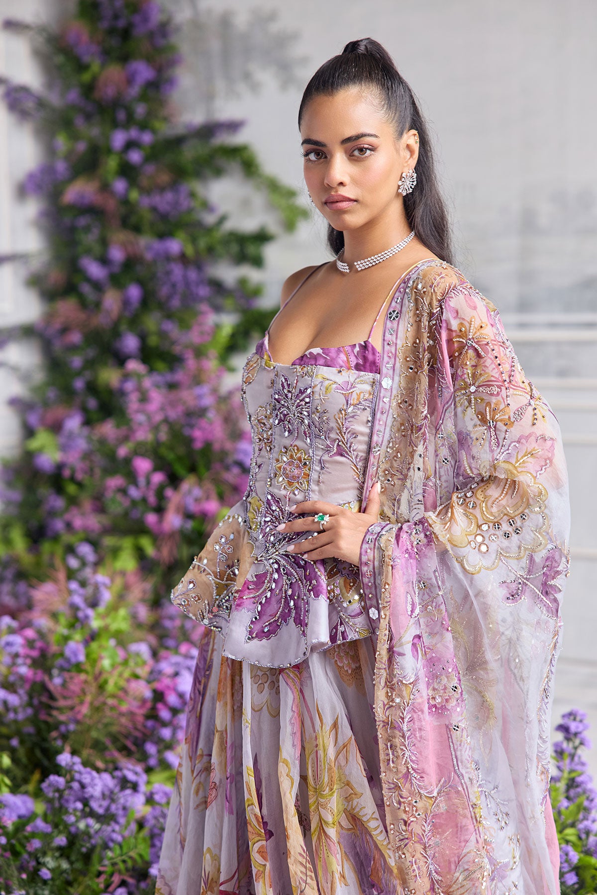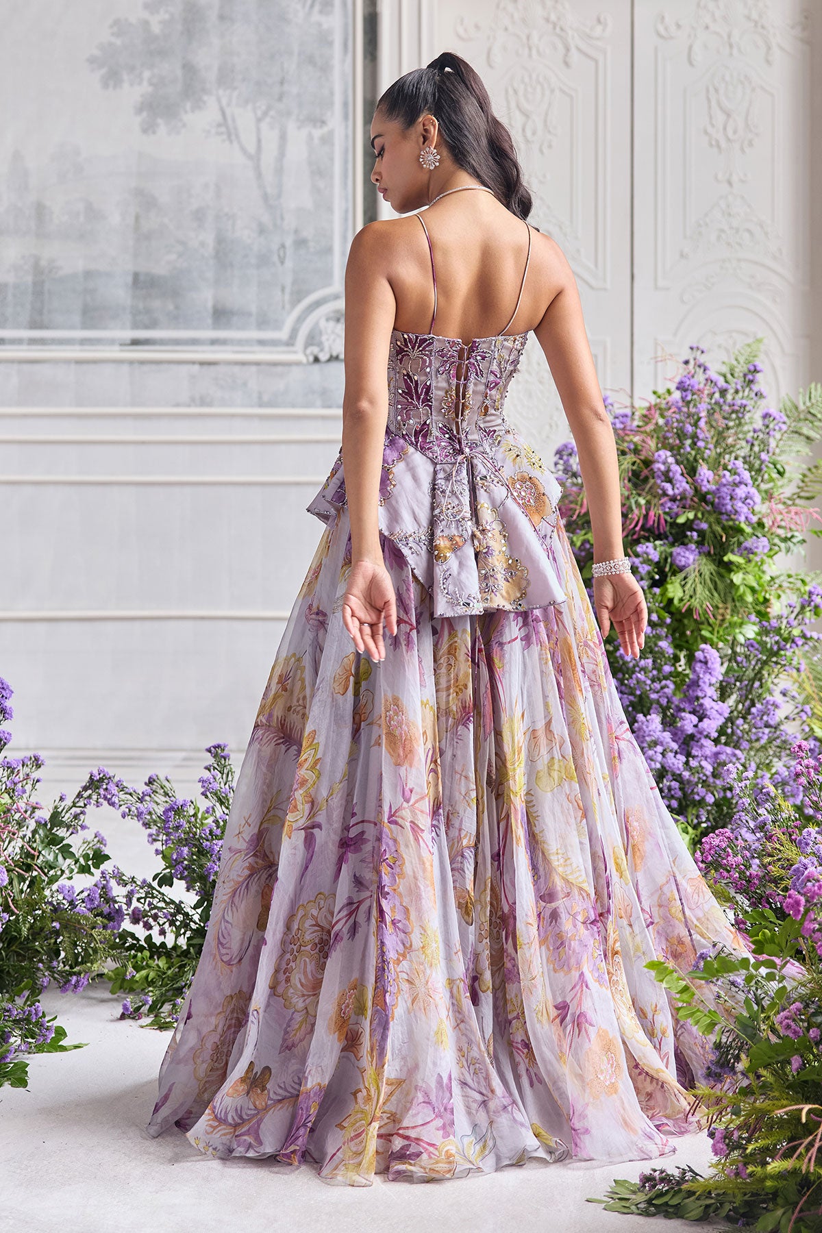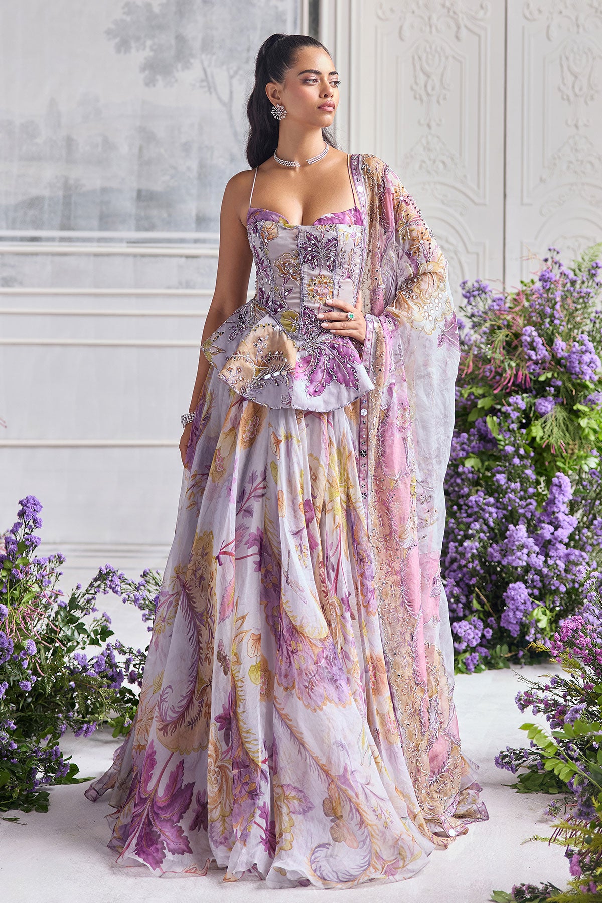 HAND EMBROIDERED PEPLUM CORSET PAIRED WITH EMBROIDERED DUPATTA AND FLORAL LEHENGA