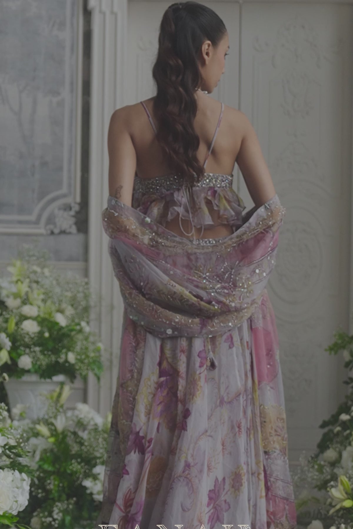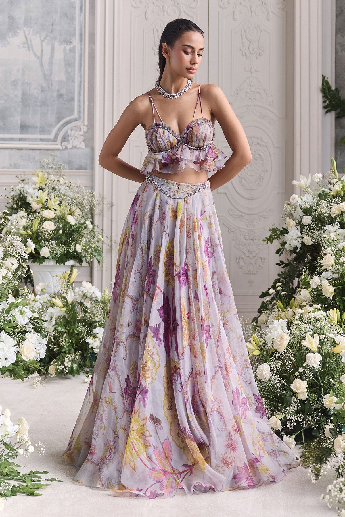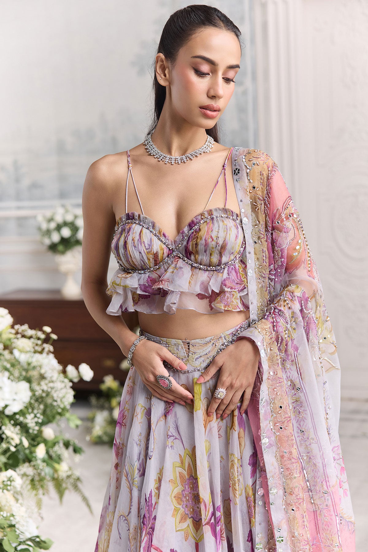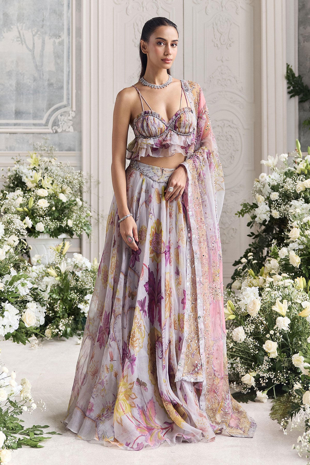 RUFFLED BUSTIER PEPLUM TOP PAIRED WITH HEAVY CHUNNI AND FLORAL LEHENGA