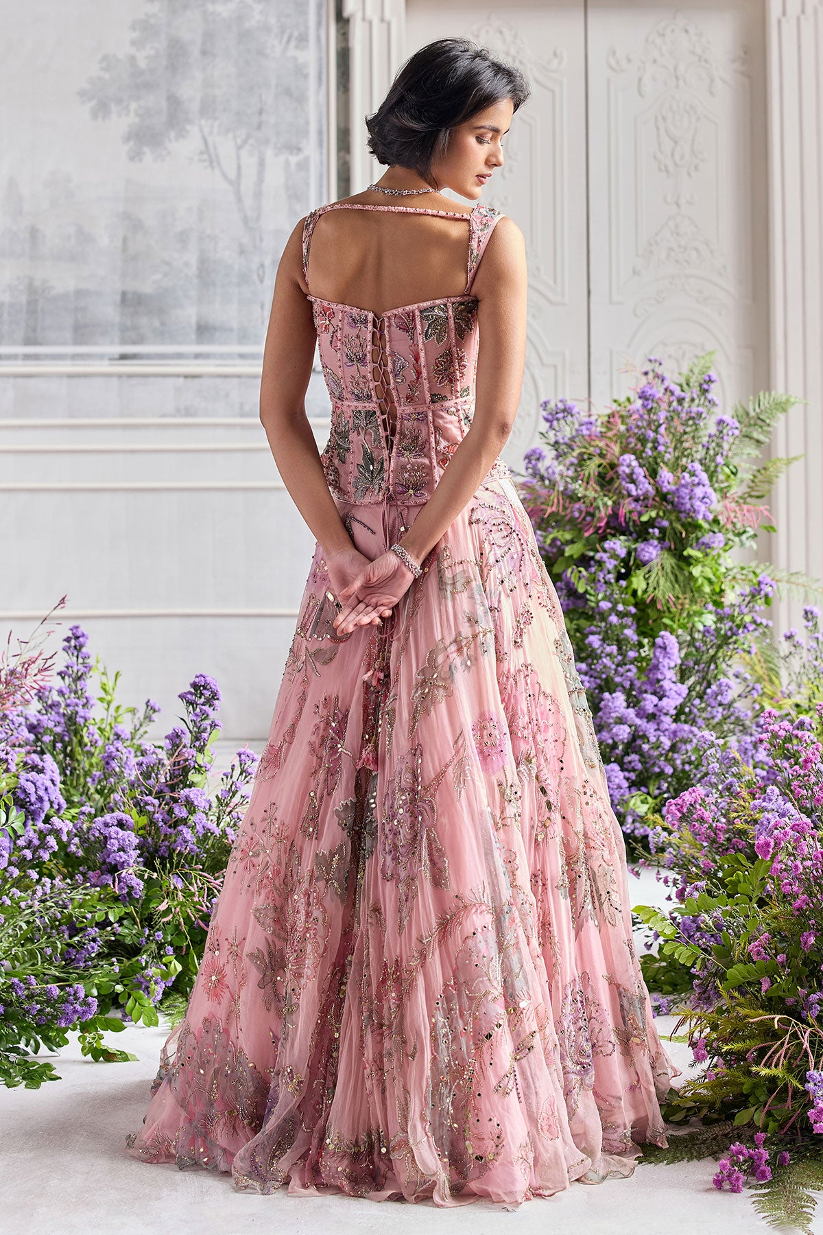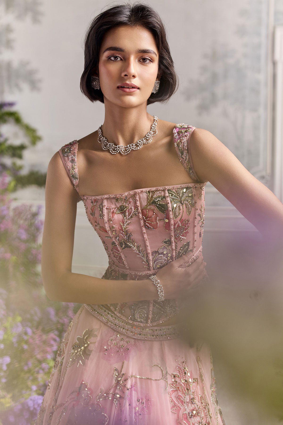 HAND EMBROIDERED CORSET FEATURING DETACHABLE STRAPS AND EMBROIDERED LEHENGA PAIRED WITH CONTRAST DUPATTA