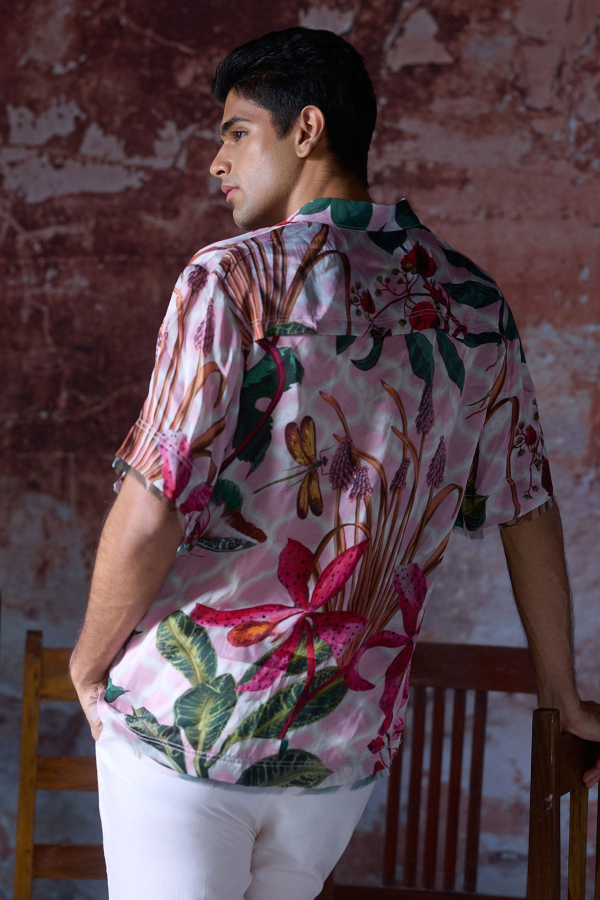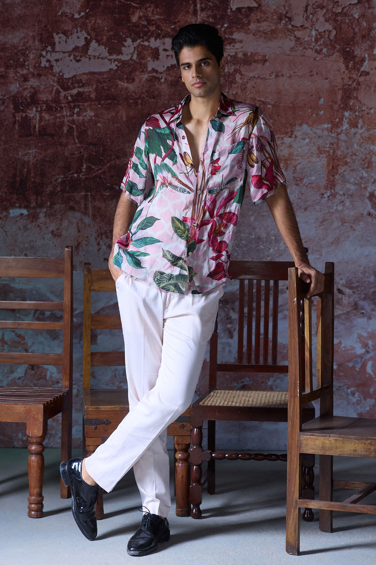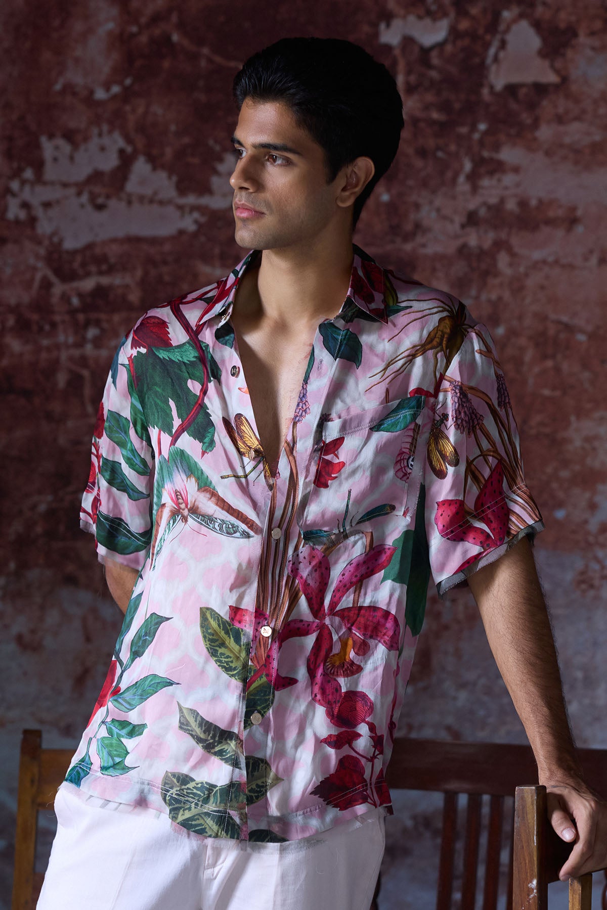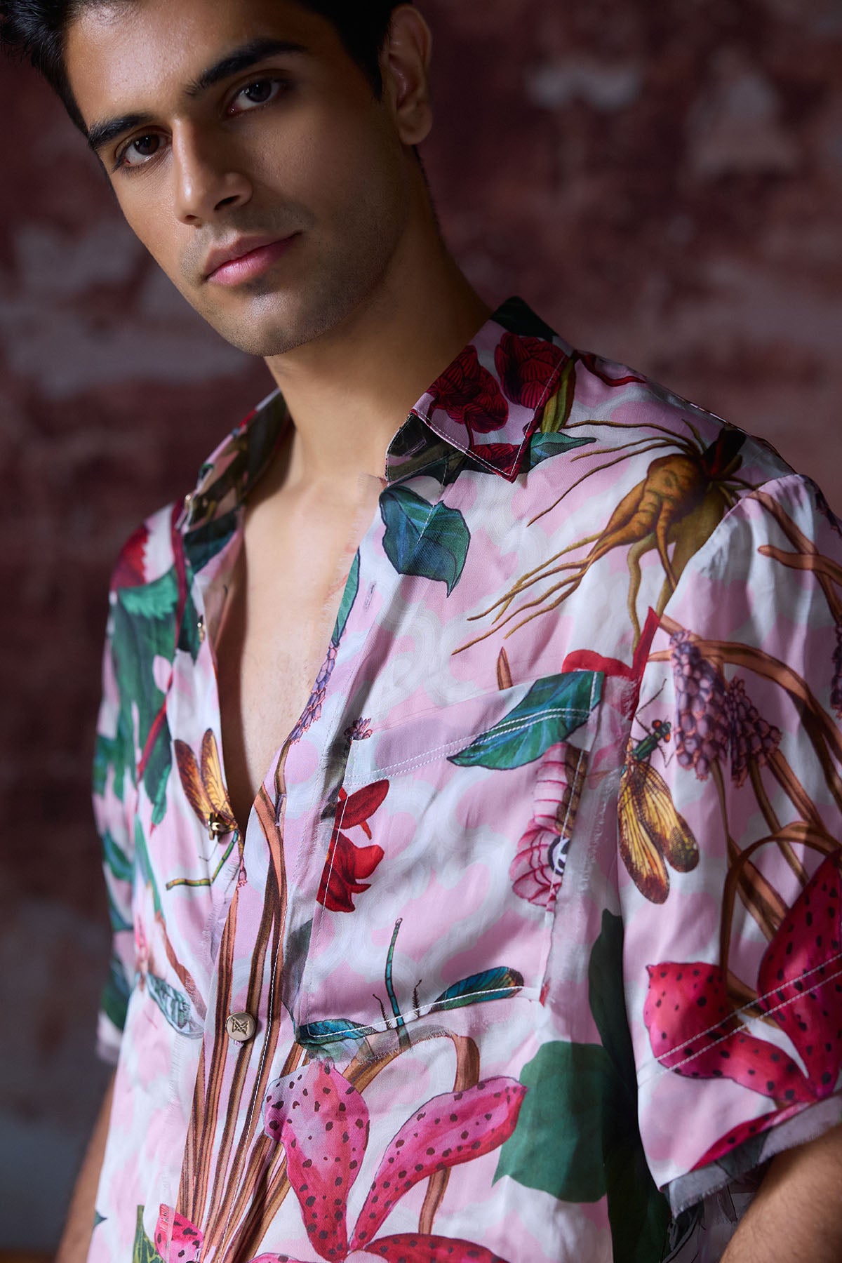 Tropical Printed Shirt with Gold MM logo buttons and sleeve detailing .