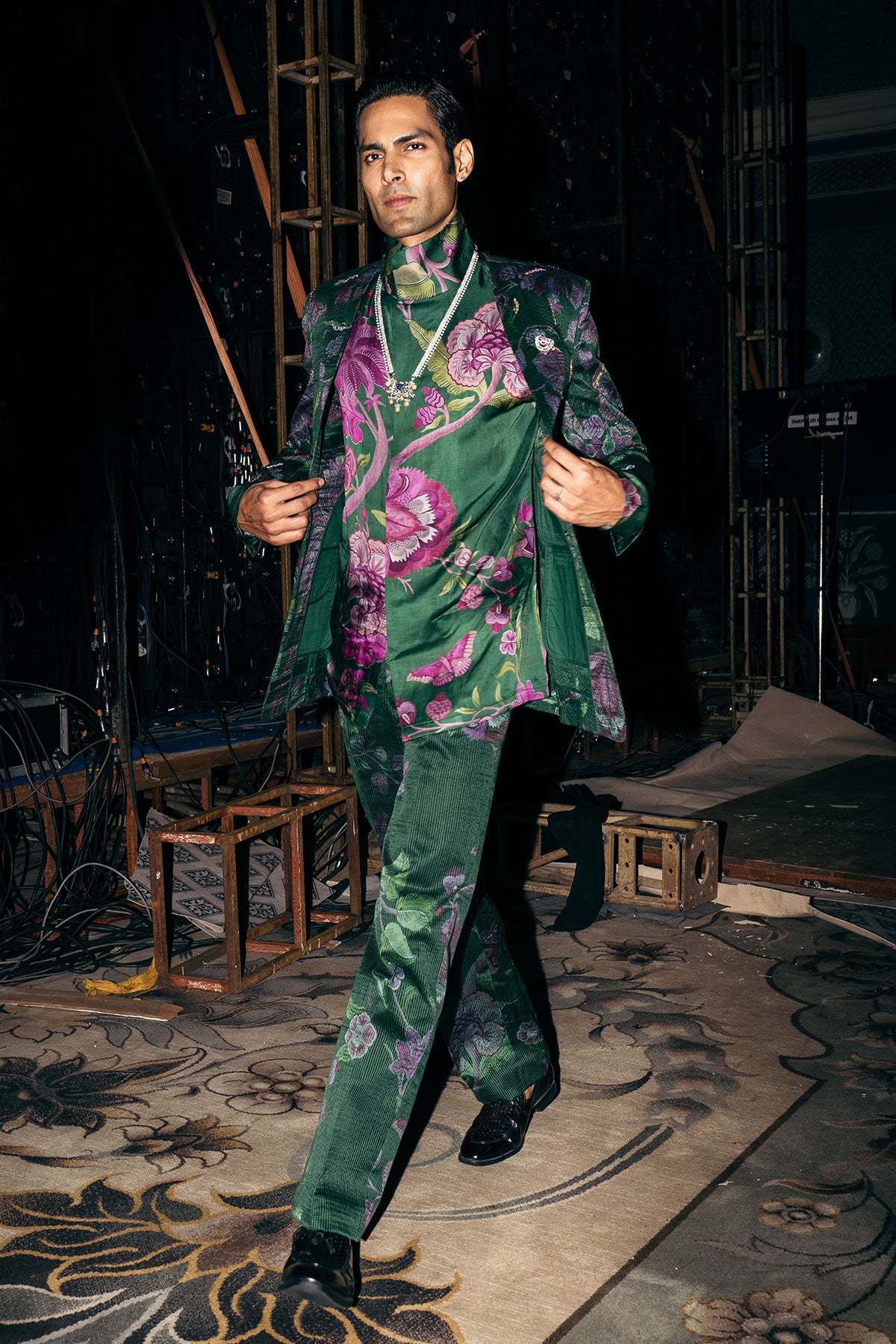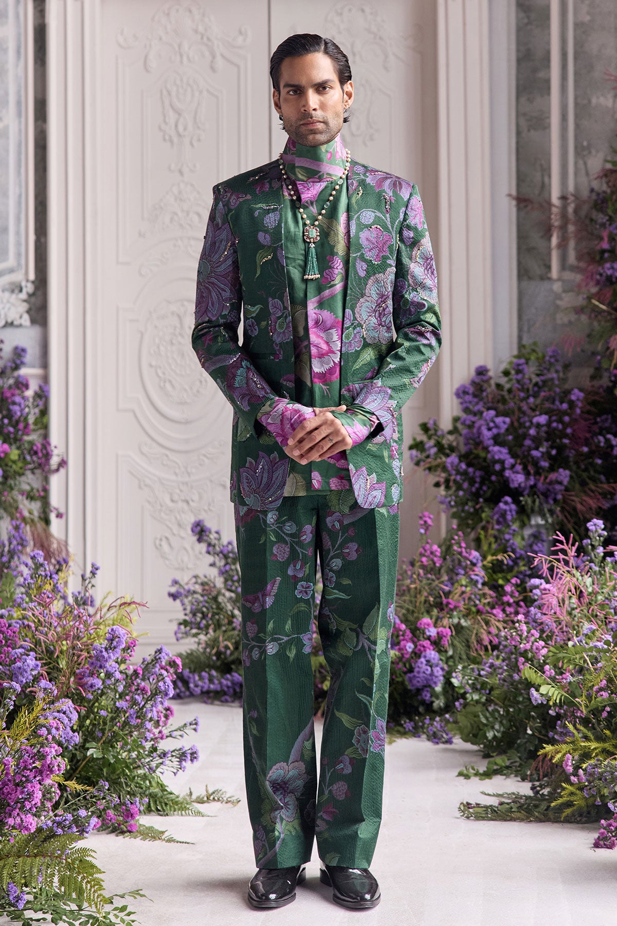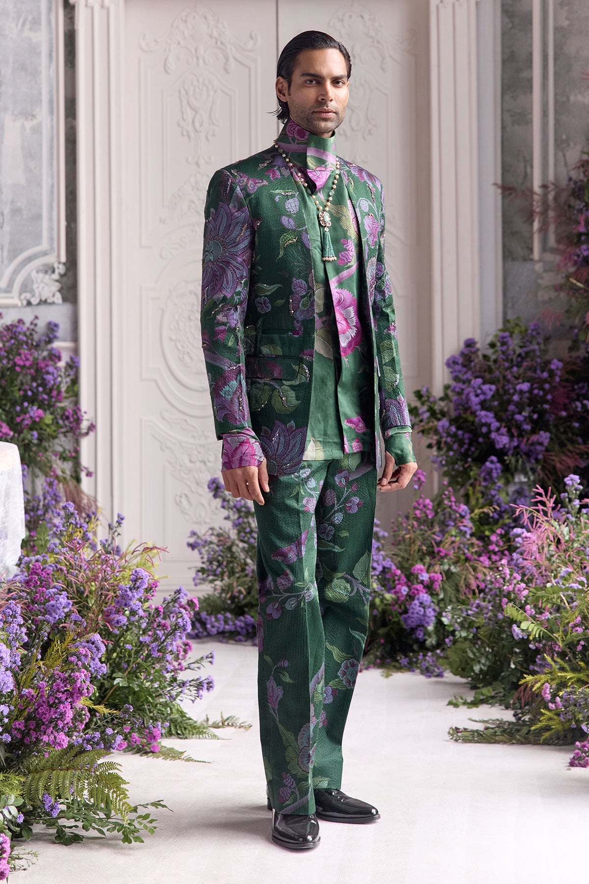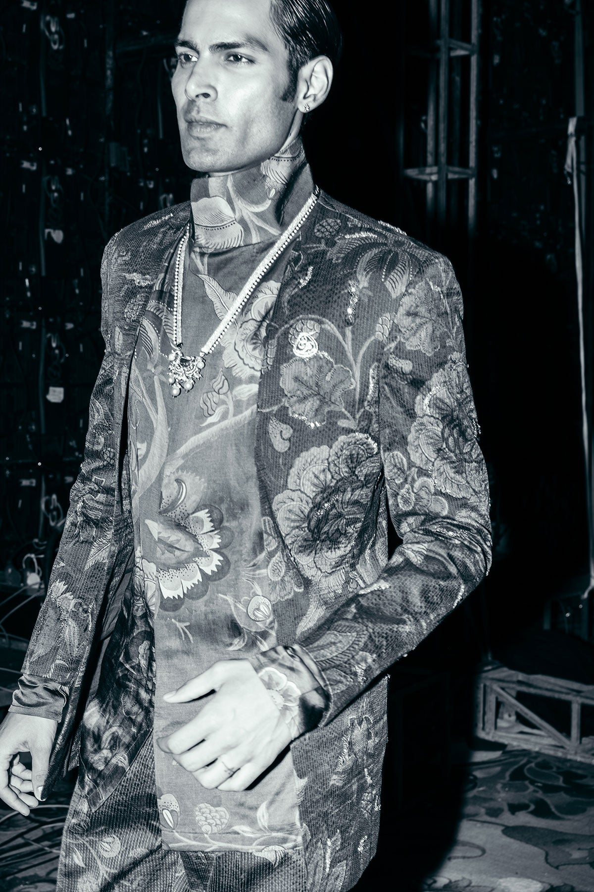 HAND EMBROIDERED BLAZER PAIRED WITH HIGH NECK SHIRT AND TROUSER