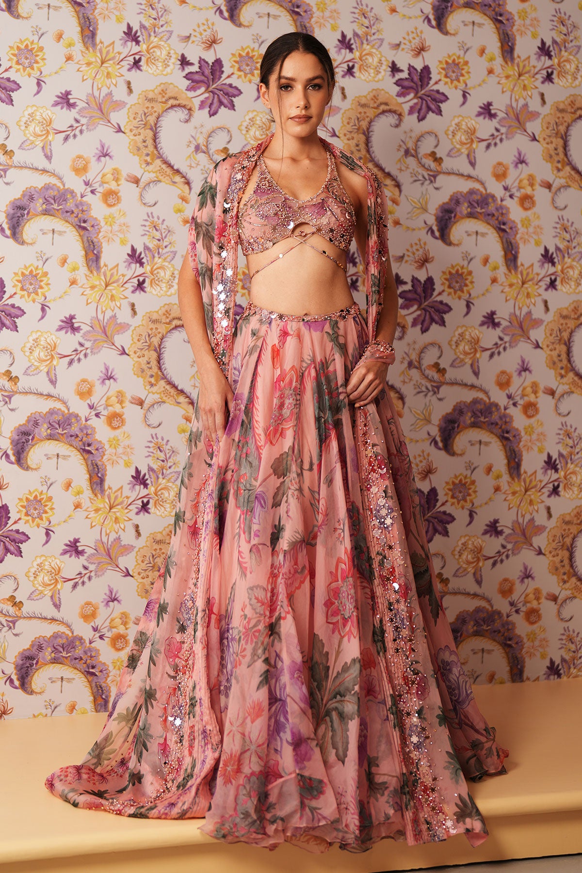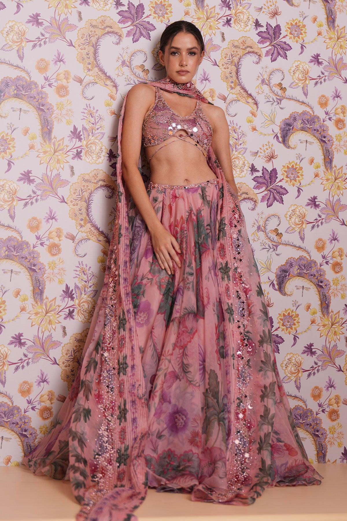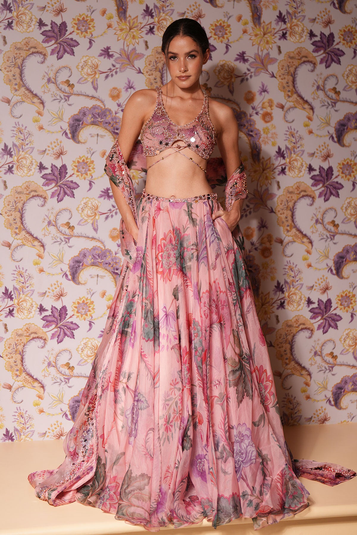 Hand Embroidered Backless Blouse And Floral Lehenga Featuring MM acrylics Paired With Pleated Dupatta