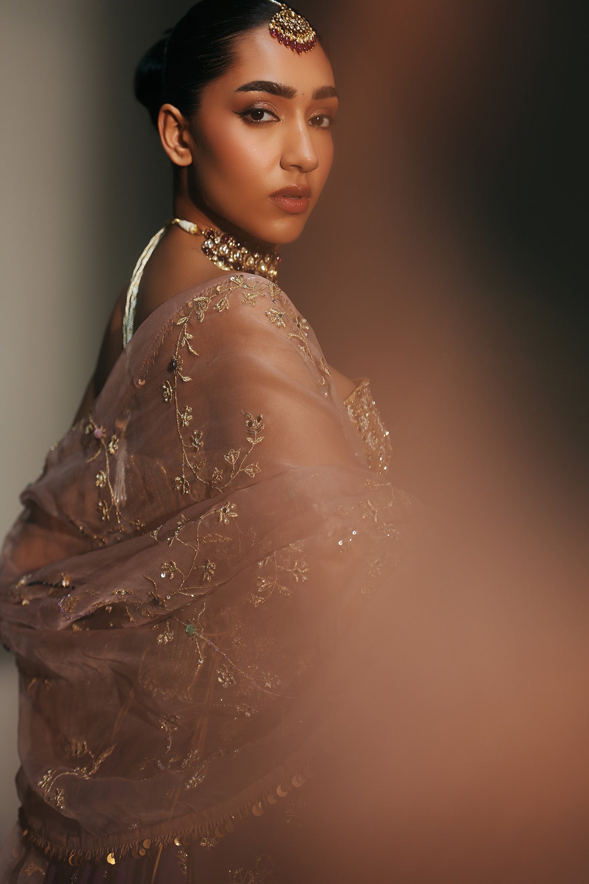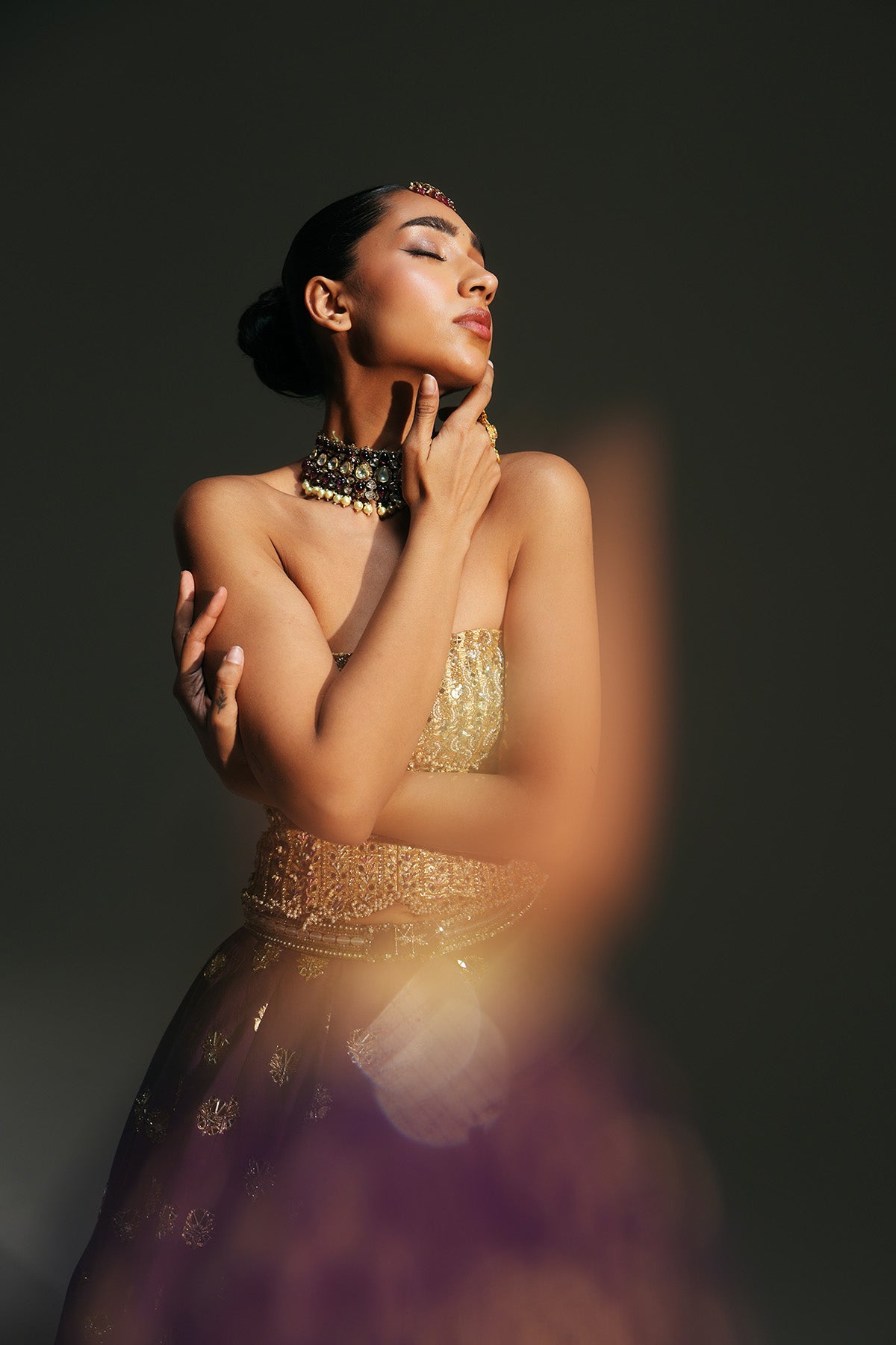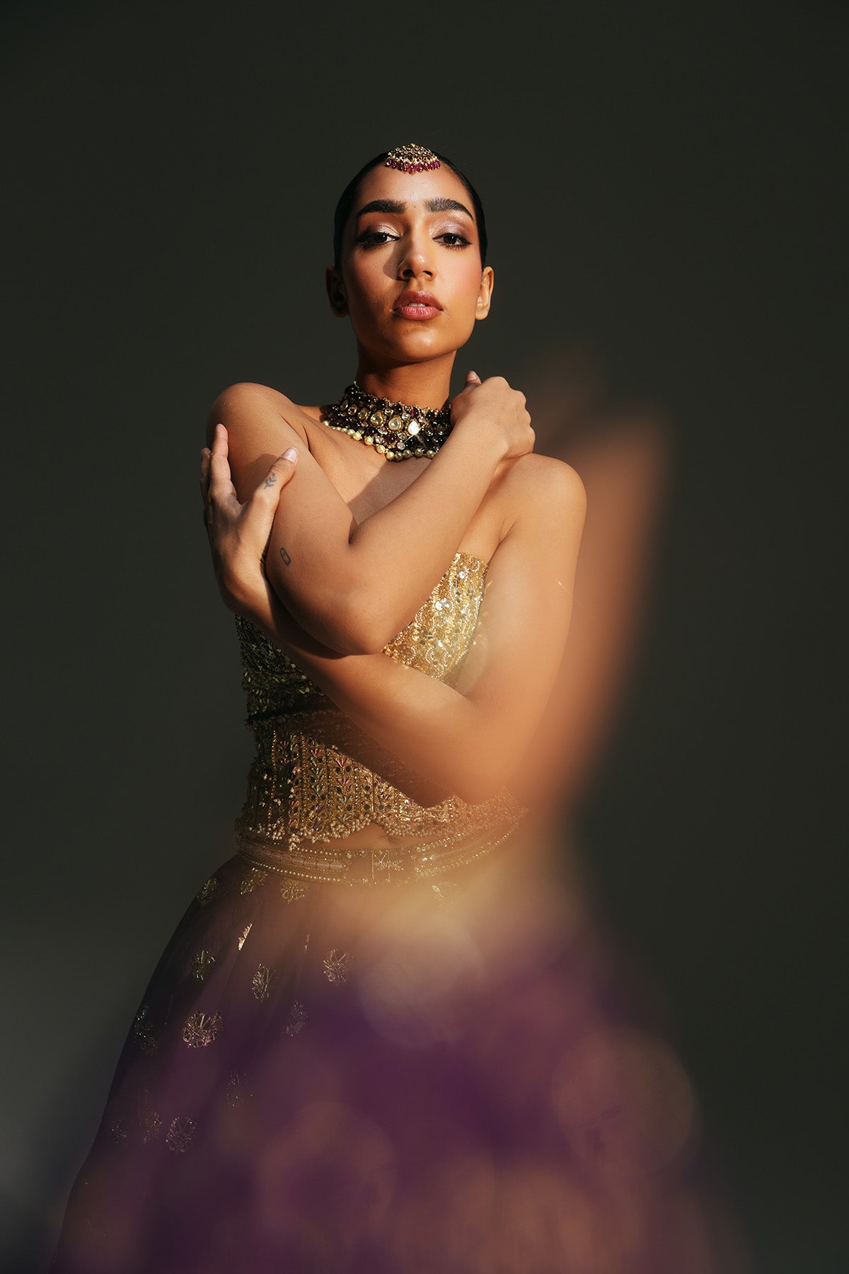 HAND EMBROIERED BOOTI LEHENGA FEATURING DRAGON FLY LOGO ON WAIST BELT PAIRED WITH GOLDEN CORSET AND DUPATTA