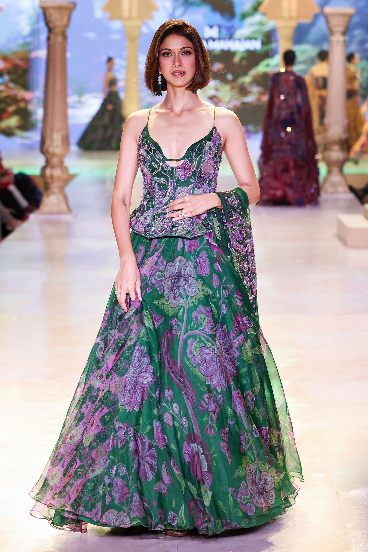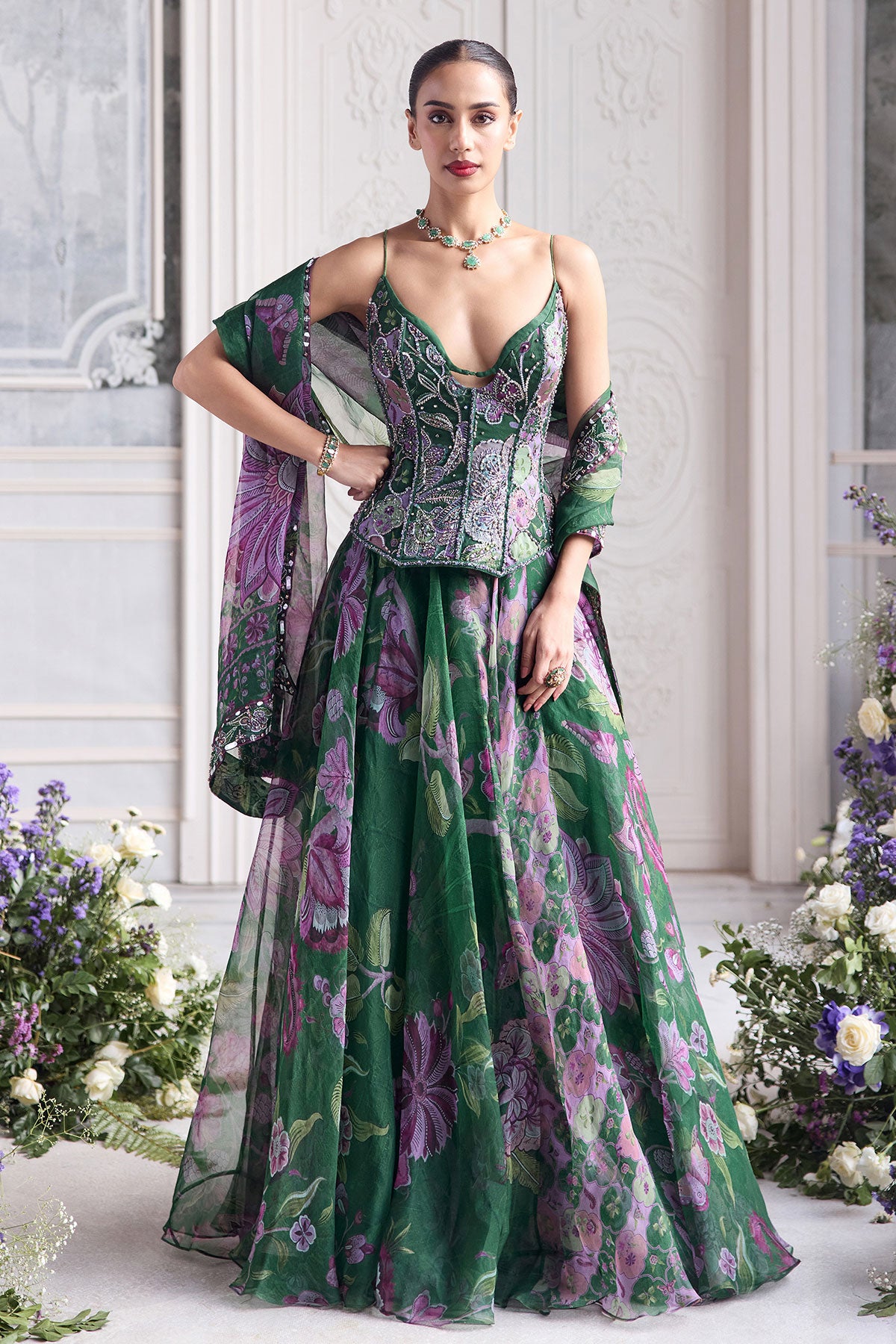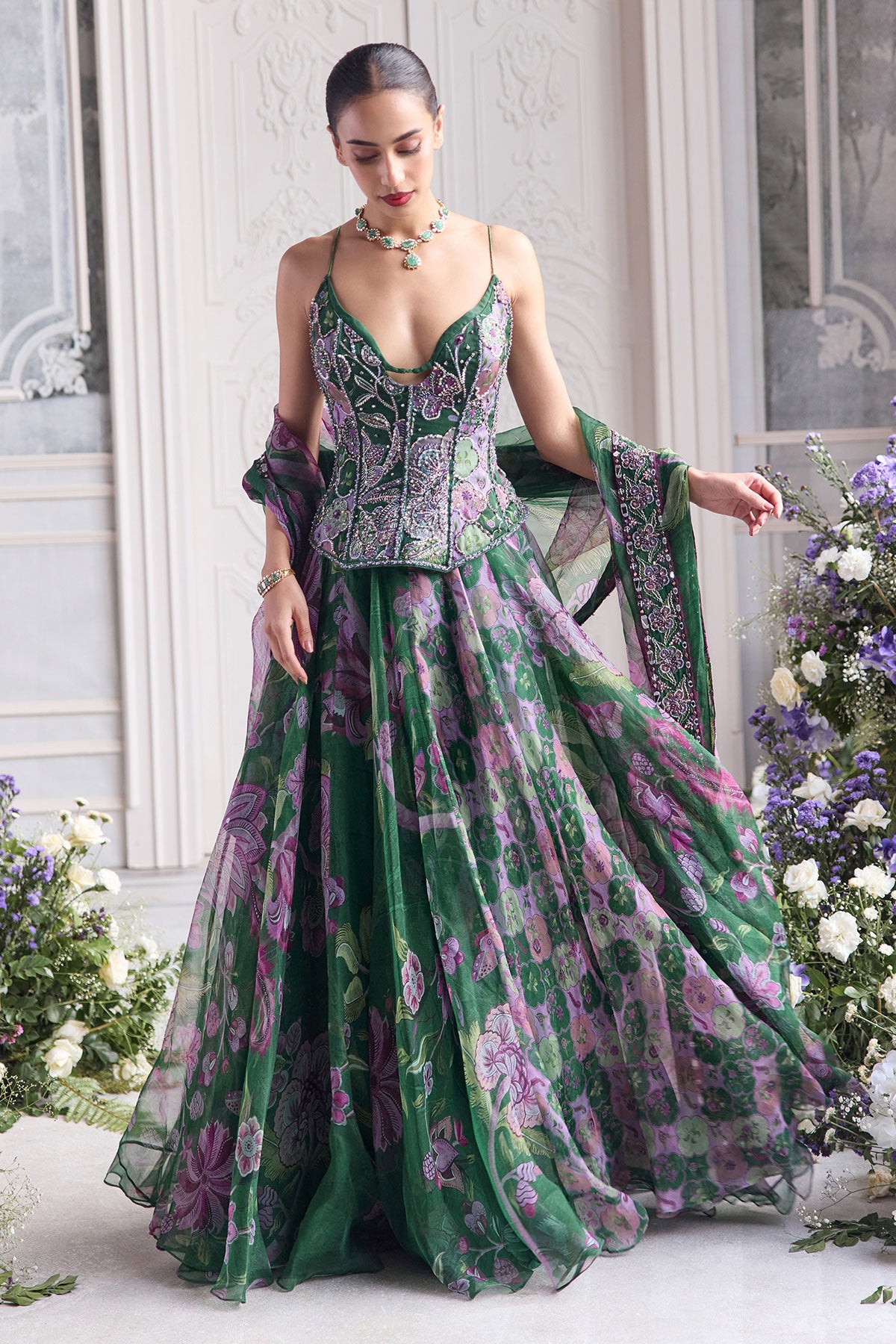 EMBRODIERED PANELLED CORSET TOP PAIRED WITH EMBROIDERED DUPATTA AND FLORAL LEHENGA