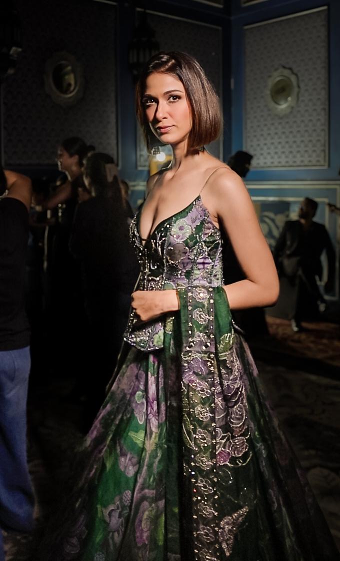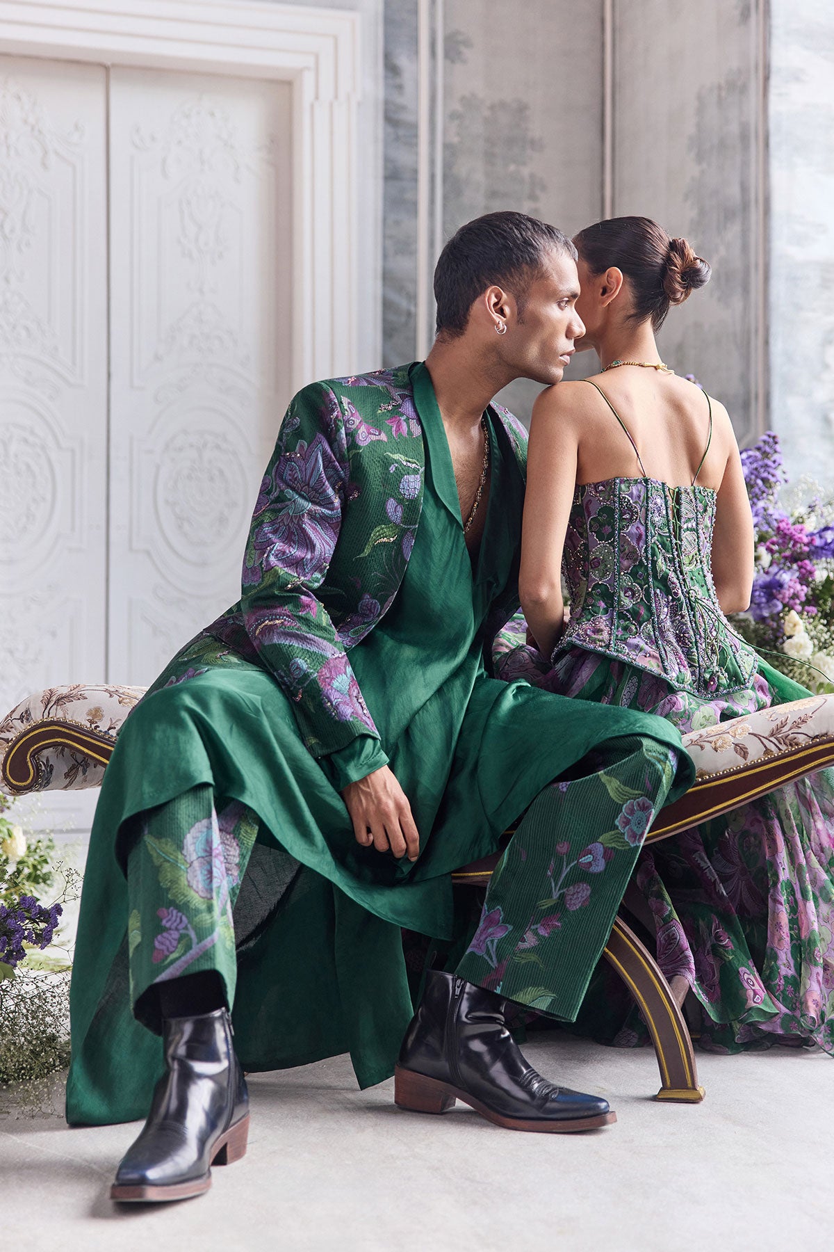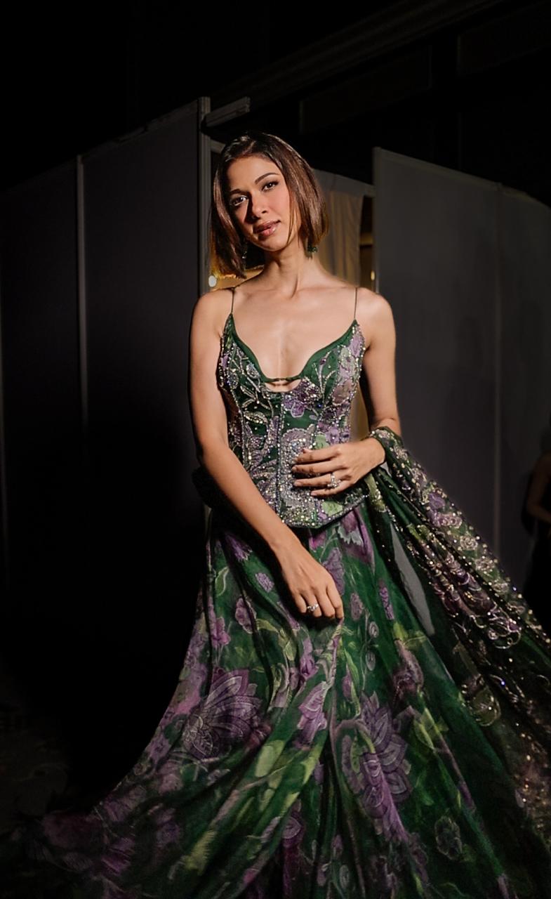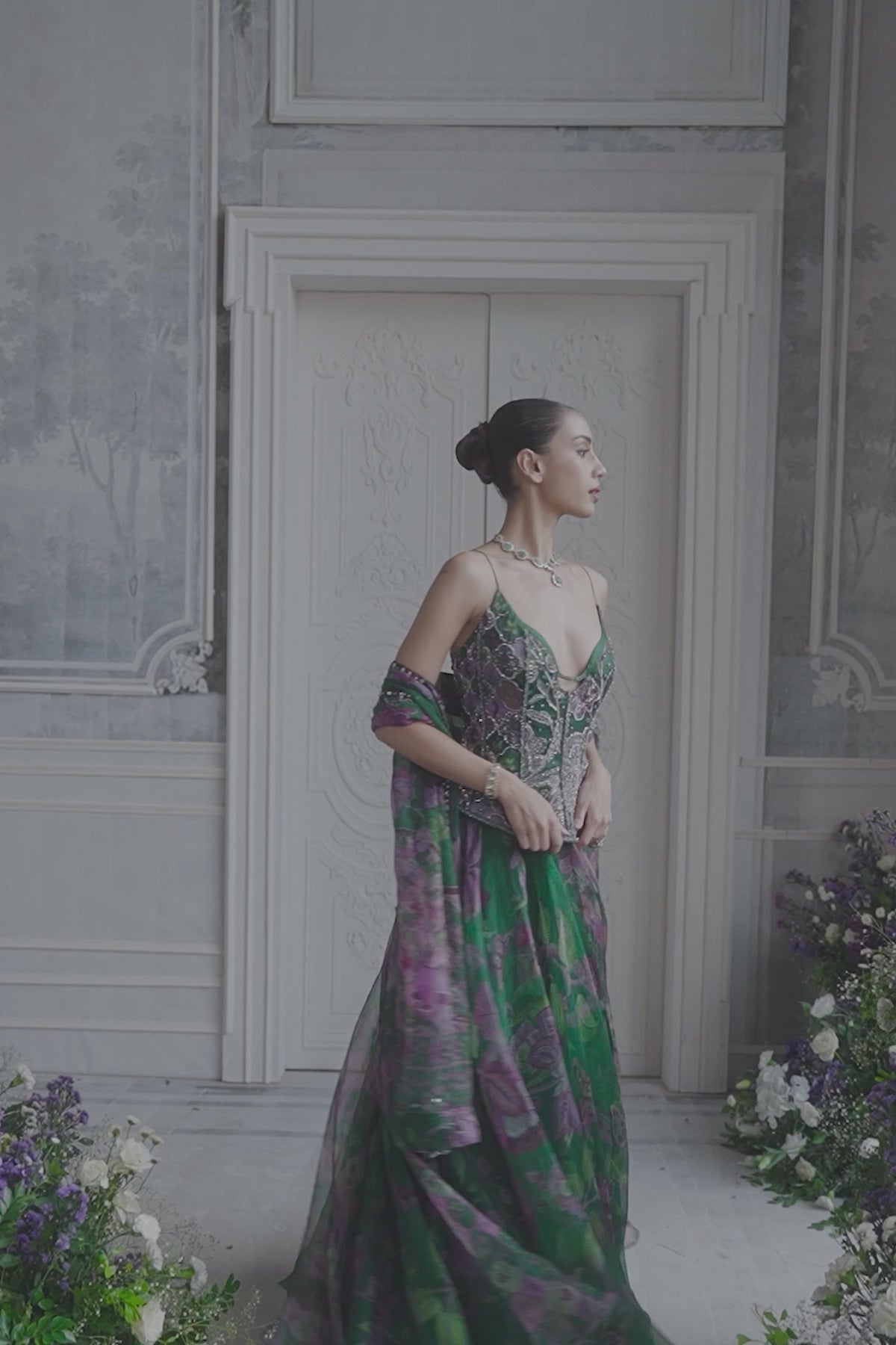 EMBRODIERED PANELLED CORSET TOP PAIRED WITH EMBROIDERED DUPATTA AND FLORAL LEHENGA