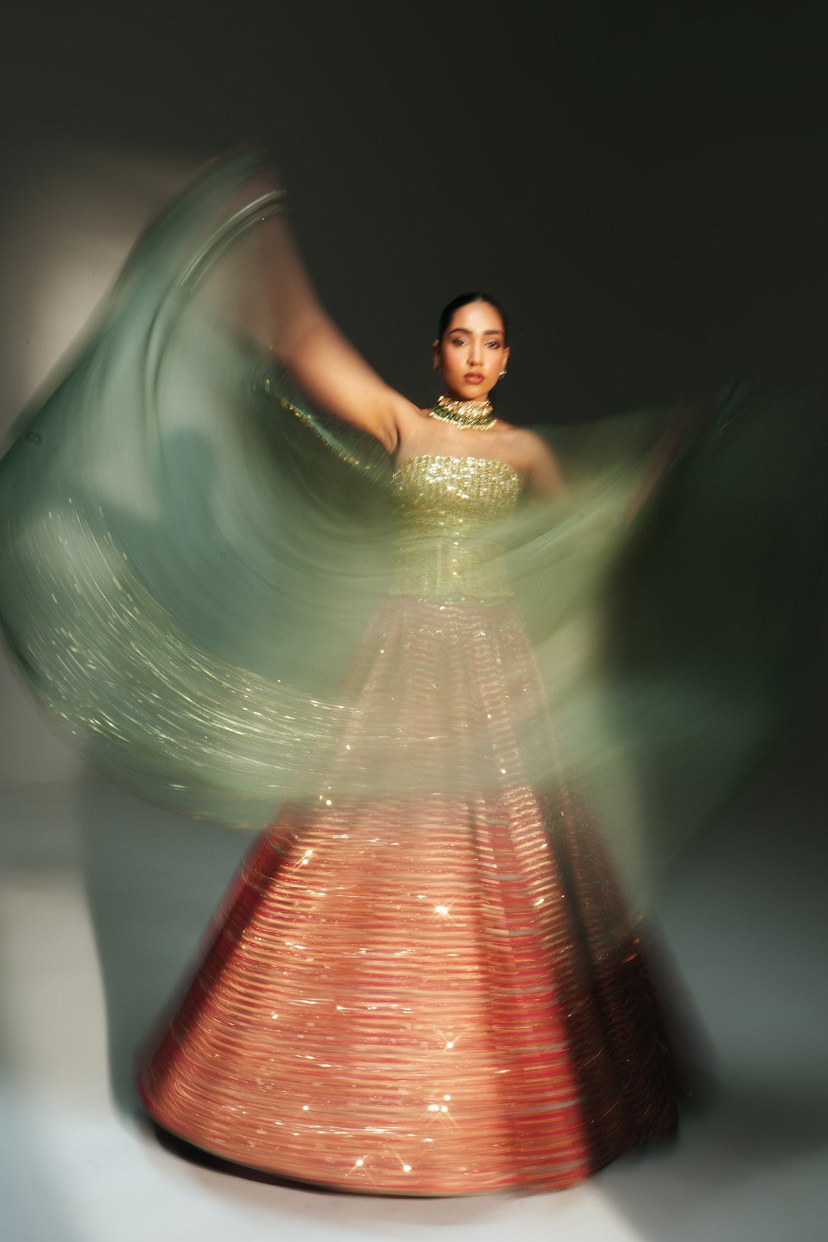 HAND EMBROIDERED RANI PINK LEHENGA PAIRED WITH GOLDEN CORSET AND CONTRAST PISTA GREEN DUPATTA