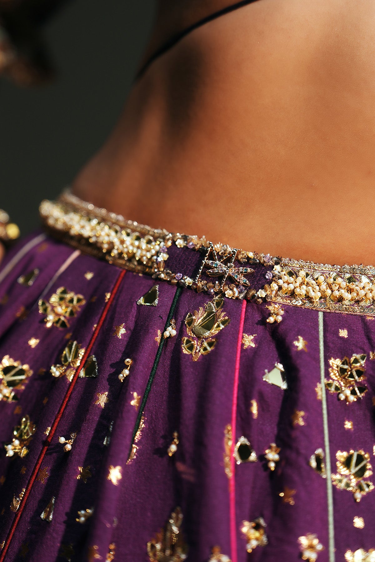 HEAVY HAND EMBROIDERED GRAPEVINE LEHENGA FEATURING DRAGON FLY LOGO ON WAIST BELT PAIRED WITH MM SIGNATURE BLOUSE AND CONTRAST DUPATTA
