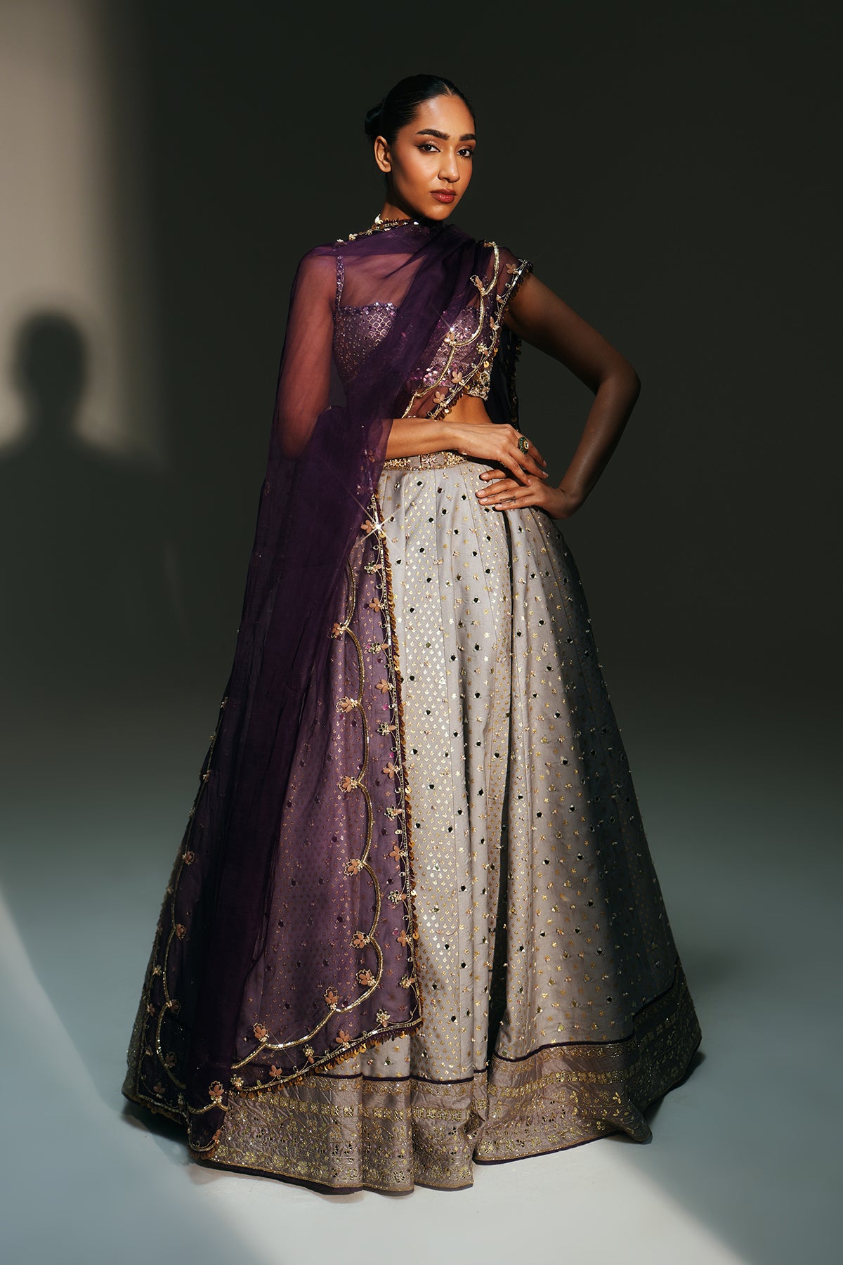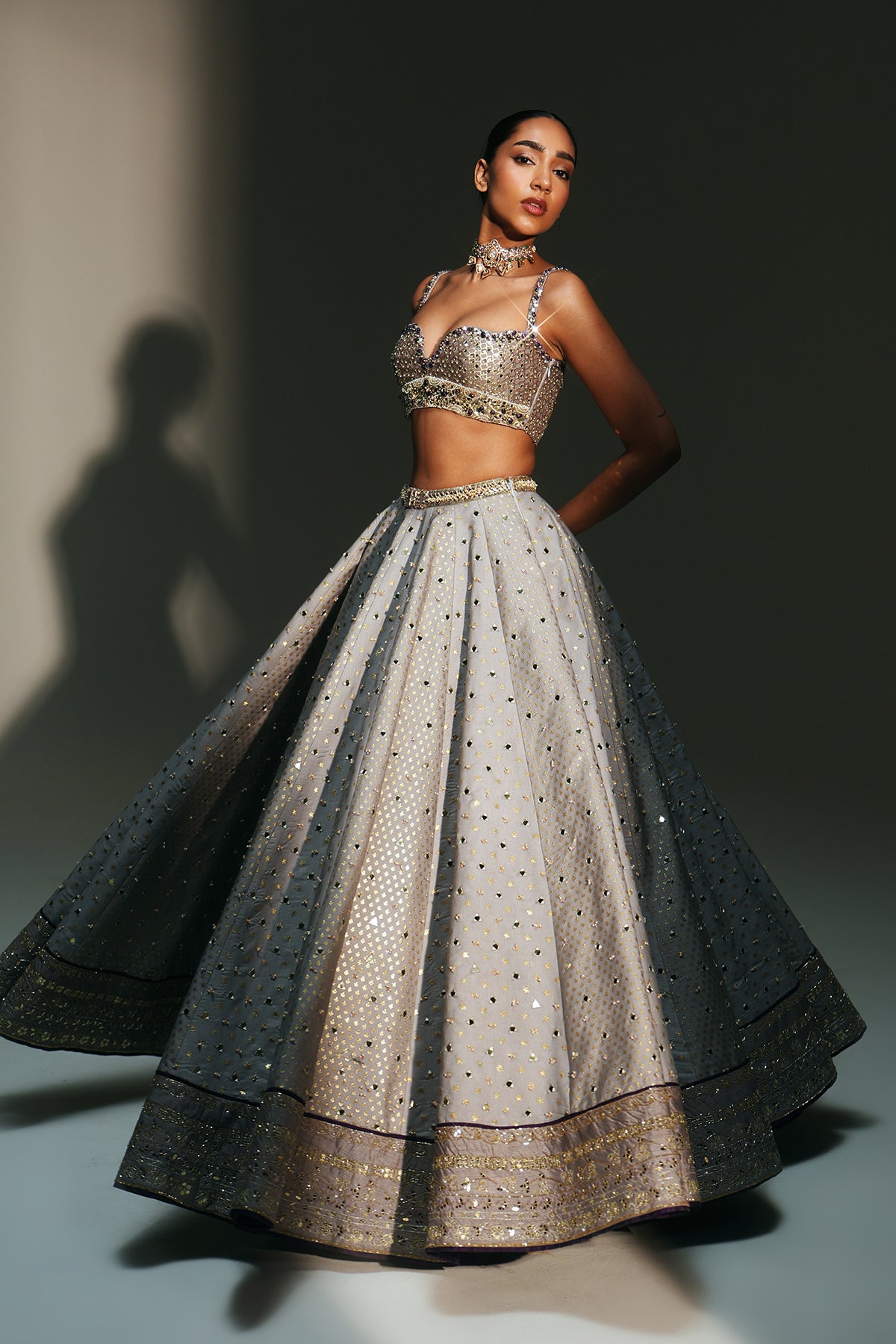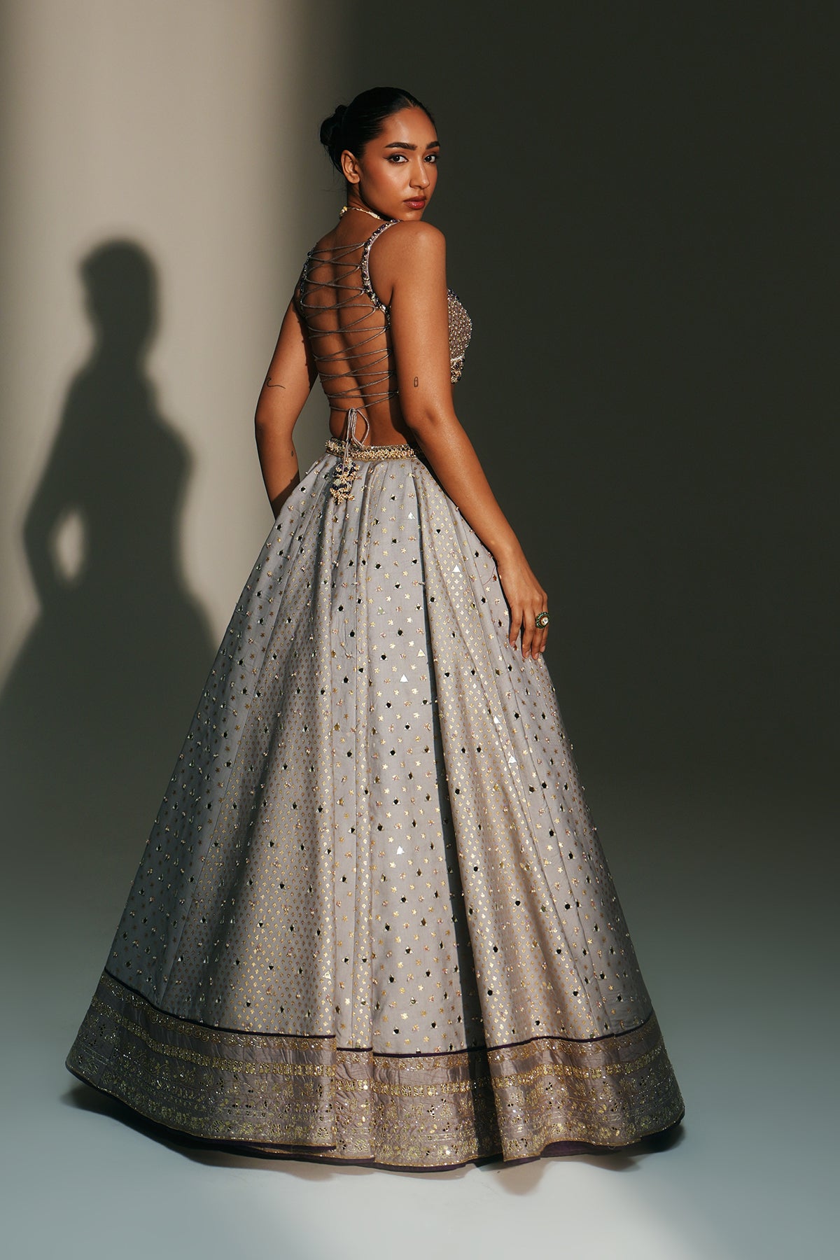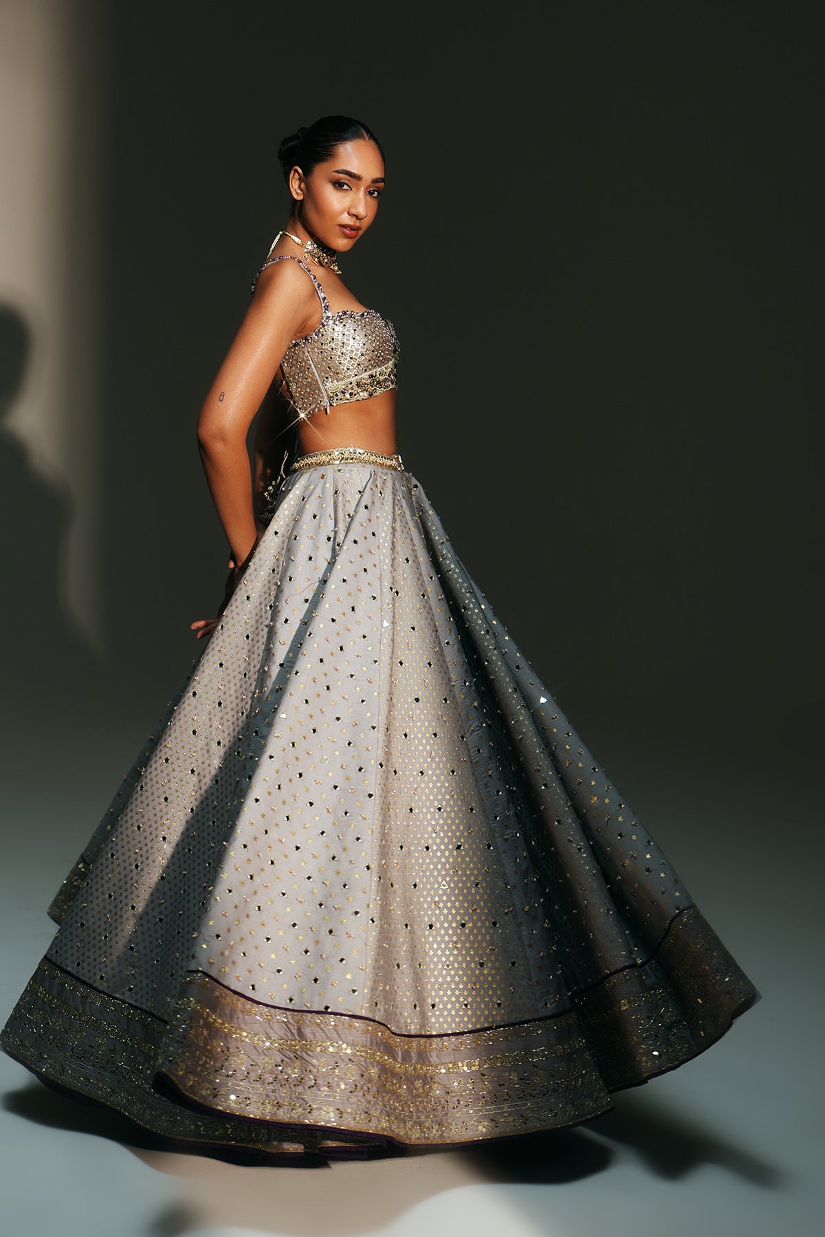 HEAVY HAND EMBROIDERED KALI LEHENGA FEATURING DRAGON FLY LOGO ON WAIST BELT PAIRED WITH BRALETTE WITH CRIS-CROSS DEATILING AT THE BACK AND CONTRAST DUPATTA