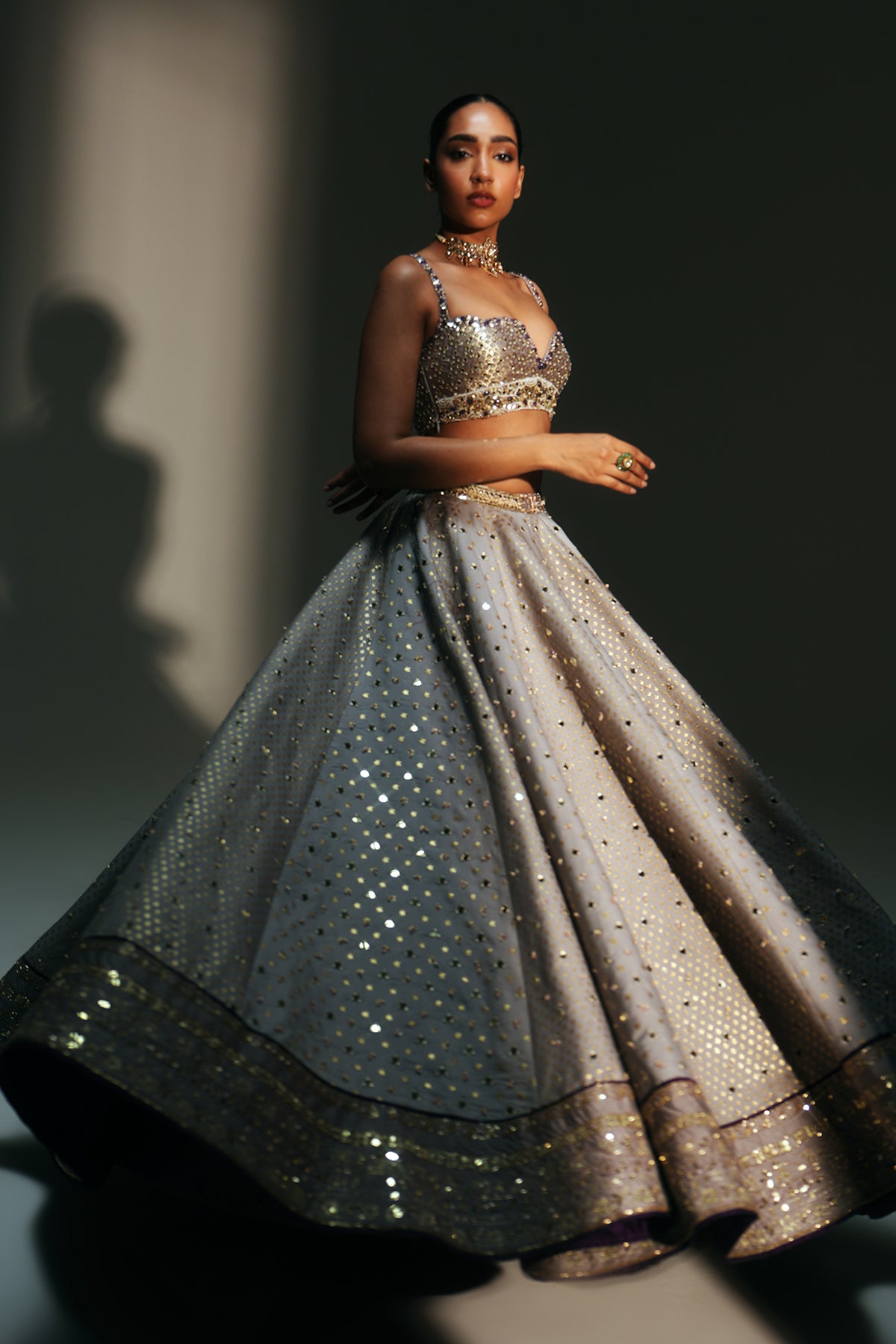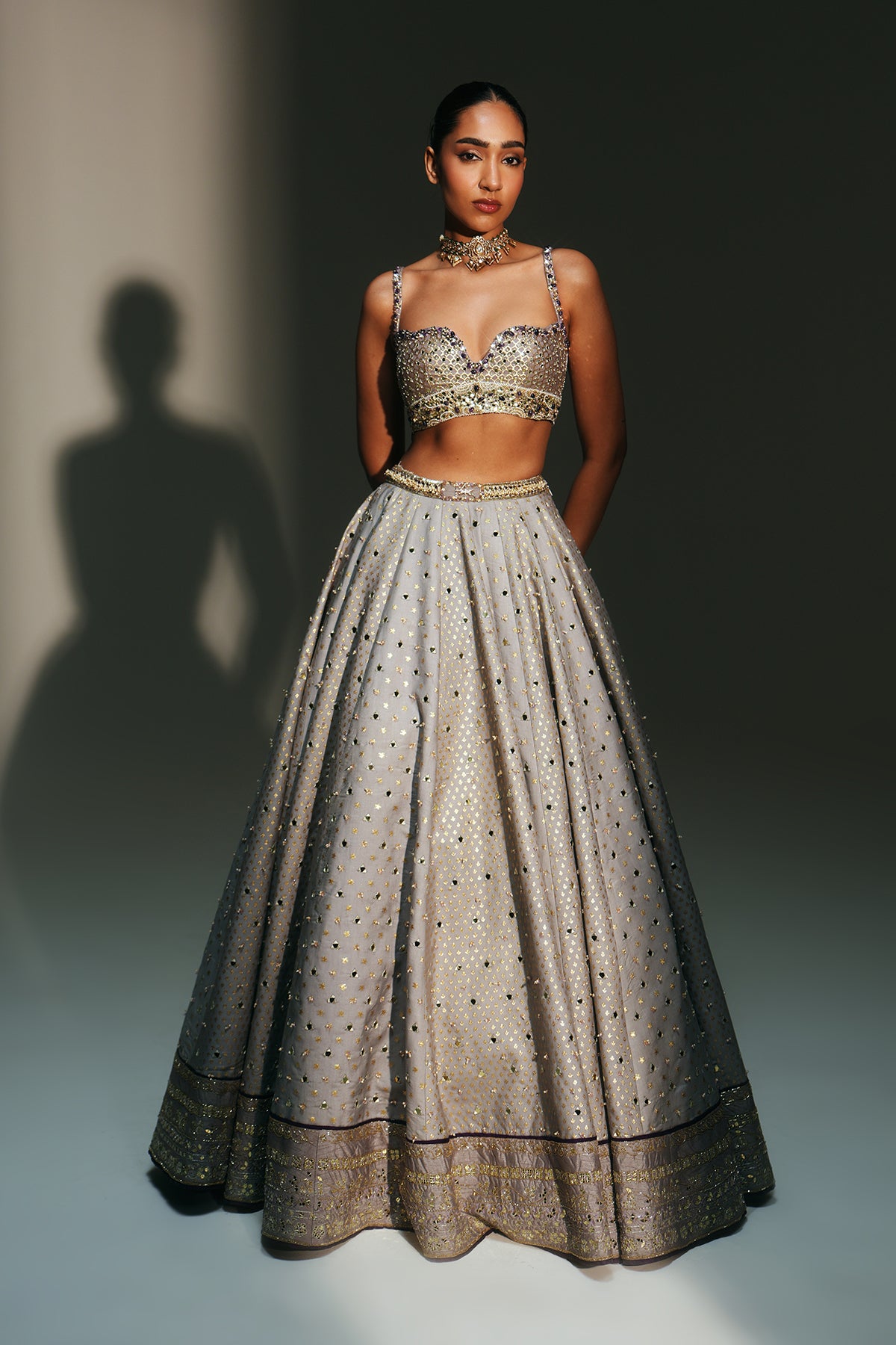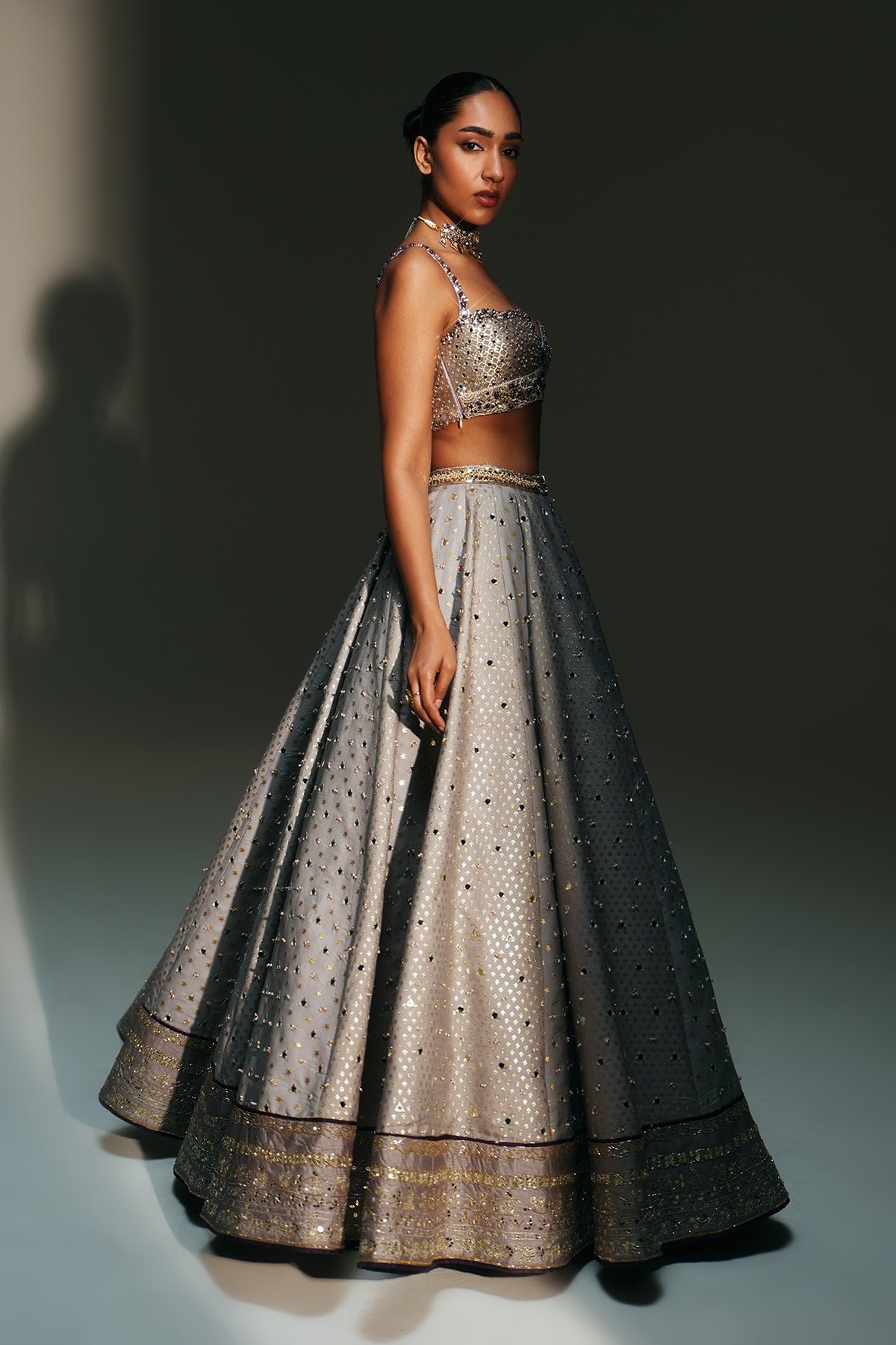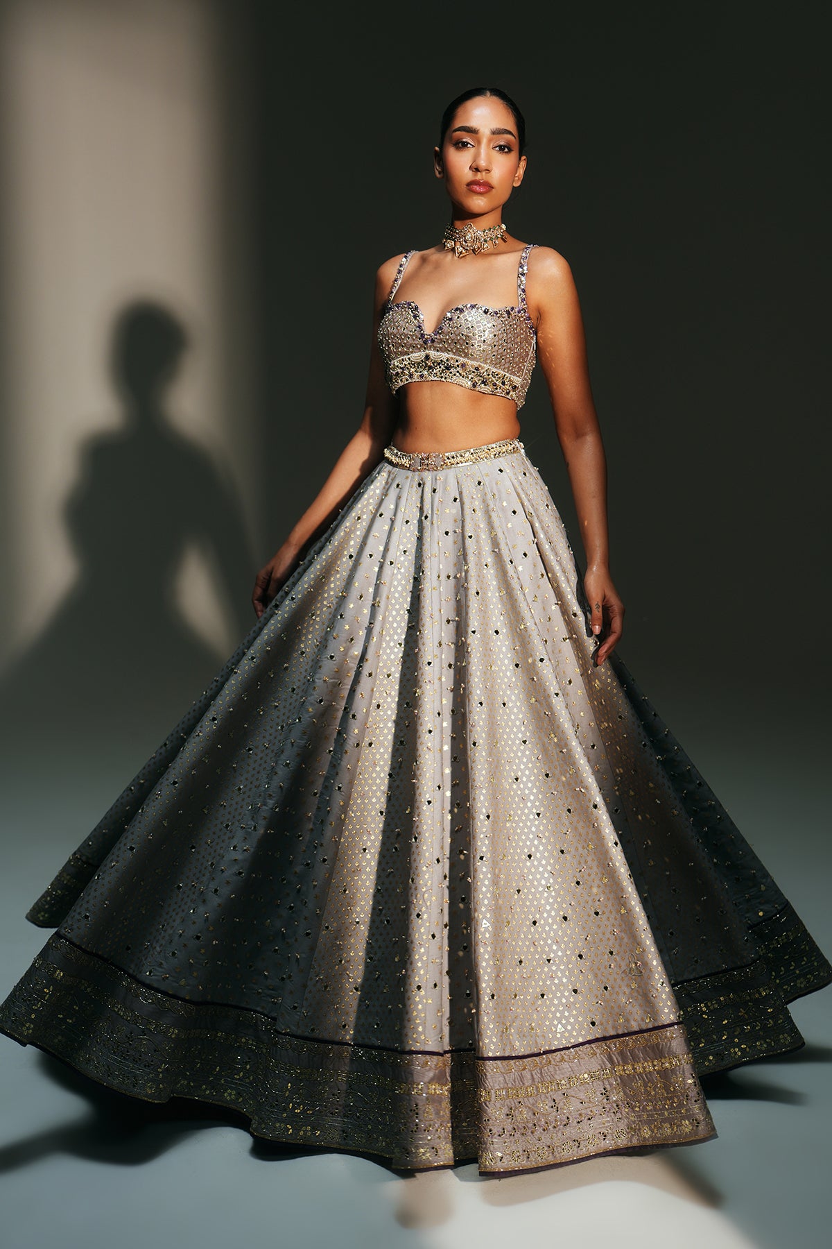 HEAVY HAND EMBROIDERED KALI LEHENGA FEATURING DRAGON FLY LOGO ON WAIST BELT PAIRED WITH BRALETTE WITH CRIS-CROSS DEATILING AT THE BACK AND CONTRAST DUPATTA