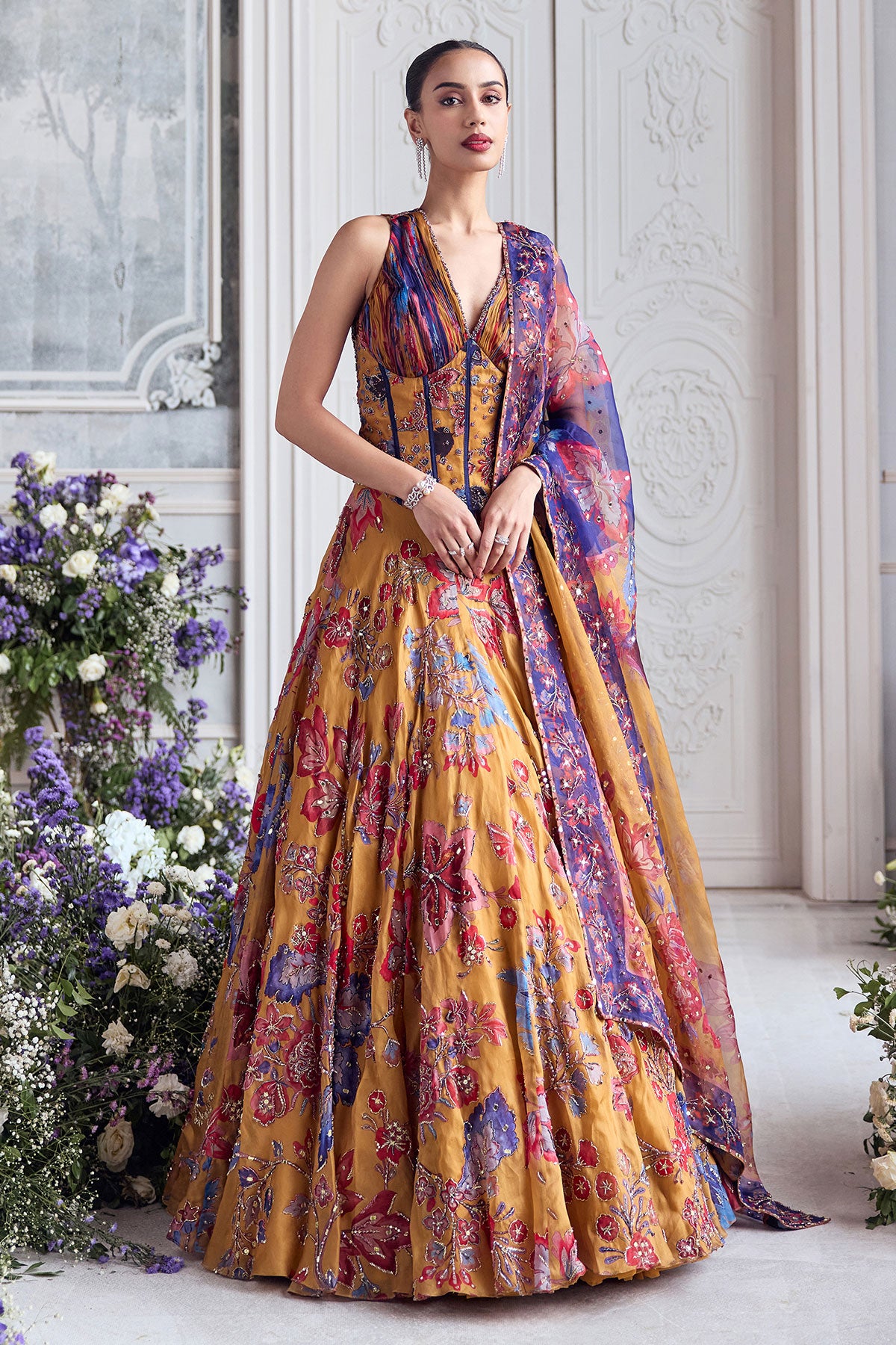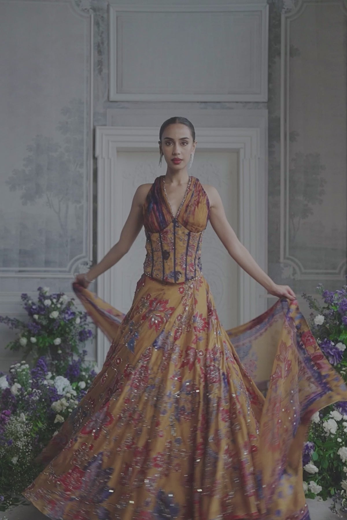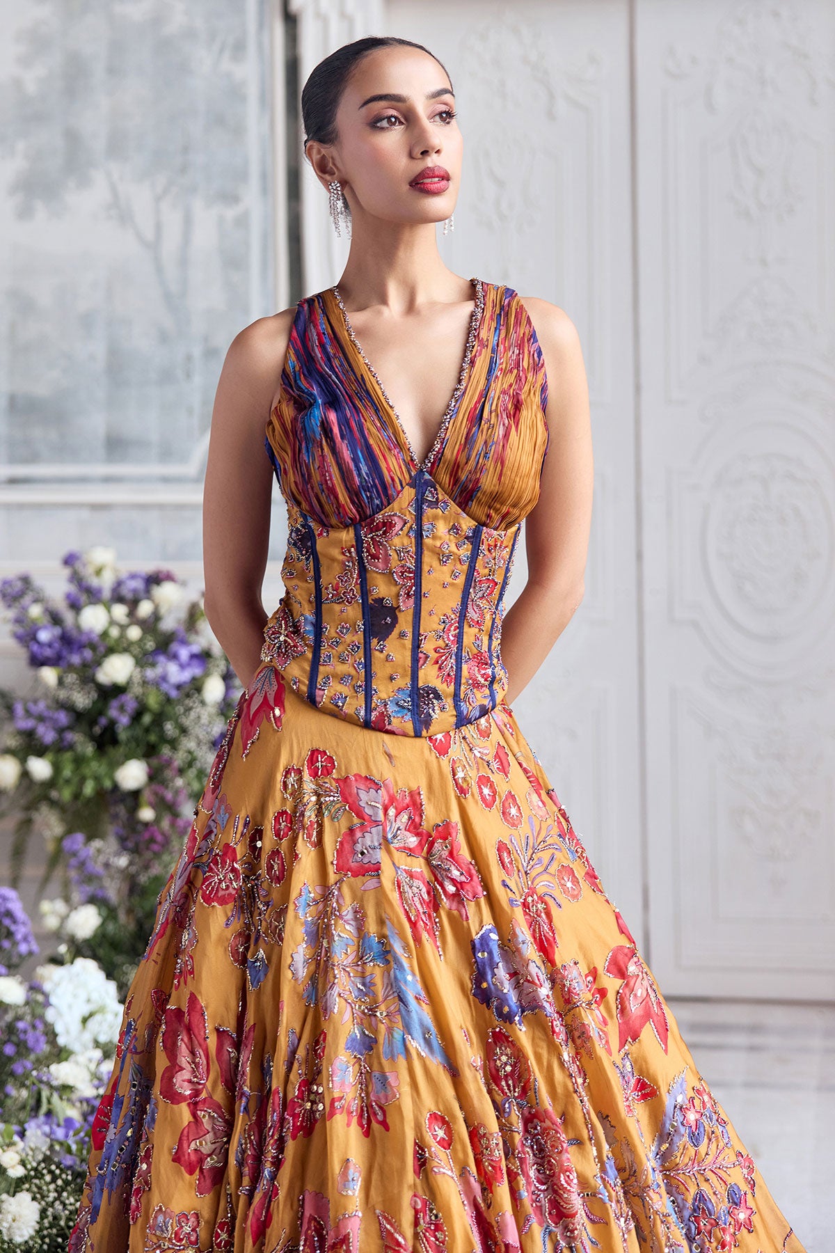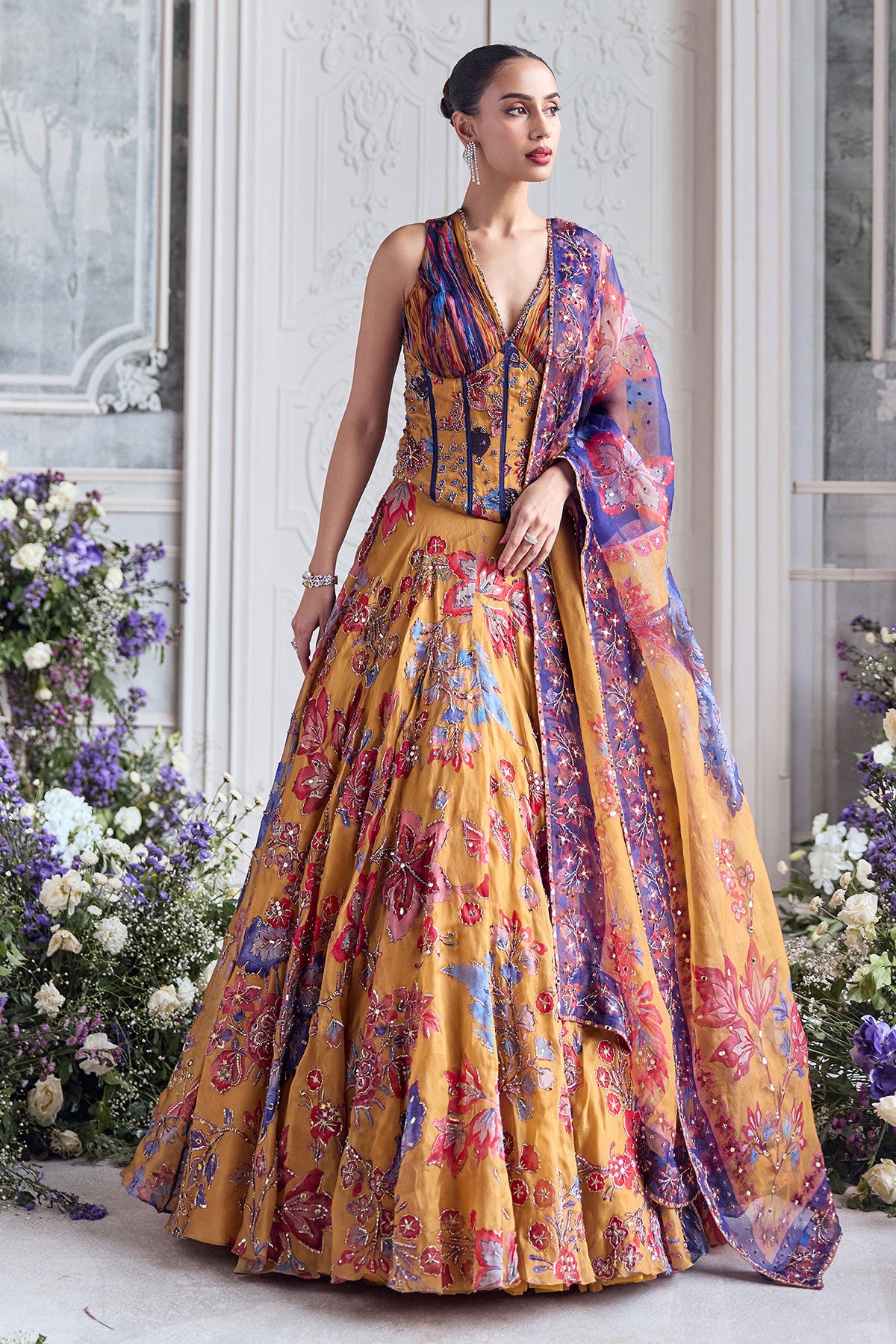 RUCHED CORSET PAIRED WITH HEAVY EMBROIDERED LEHENGA AND DUPATTA