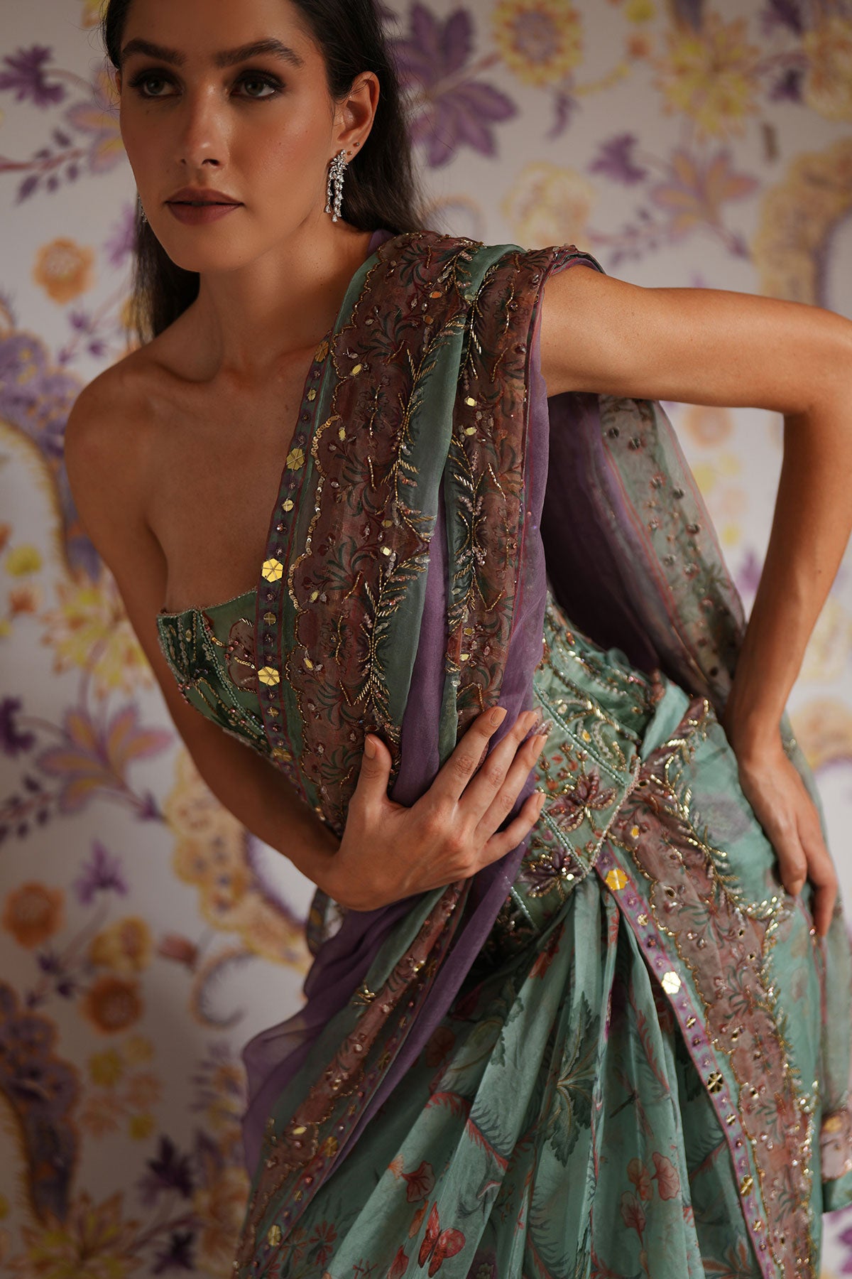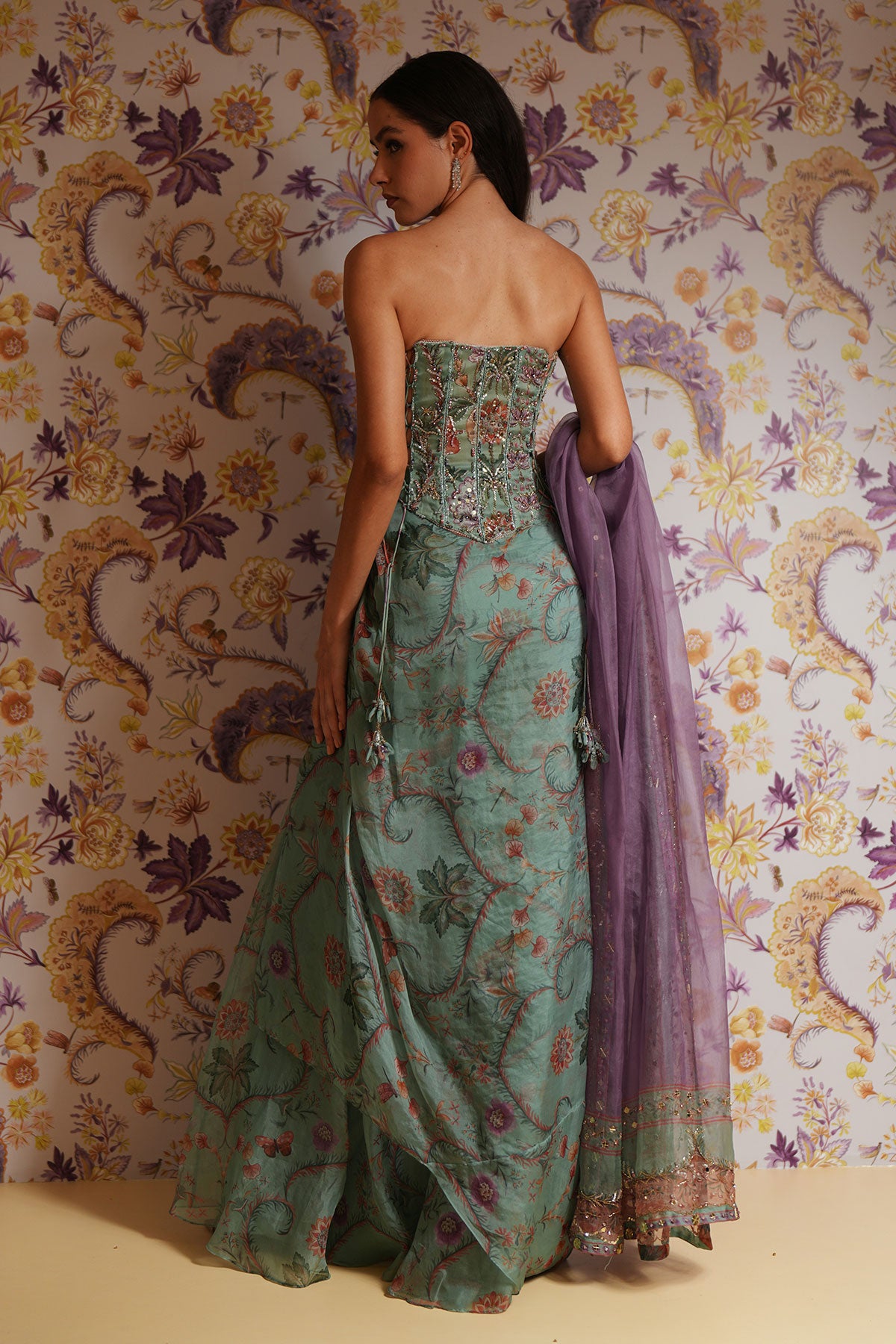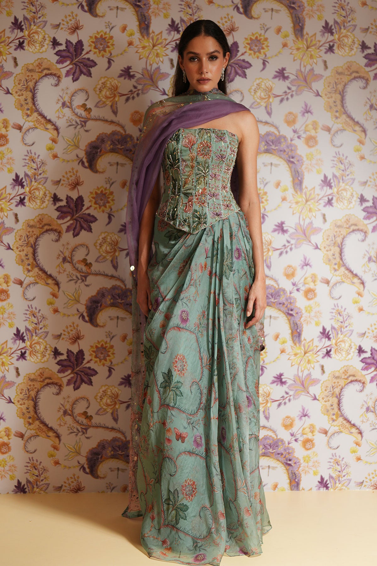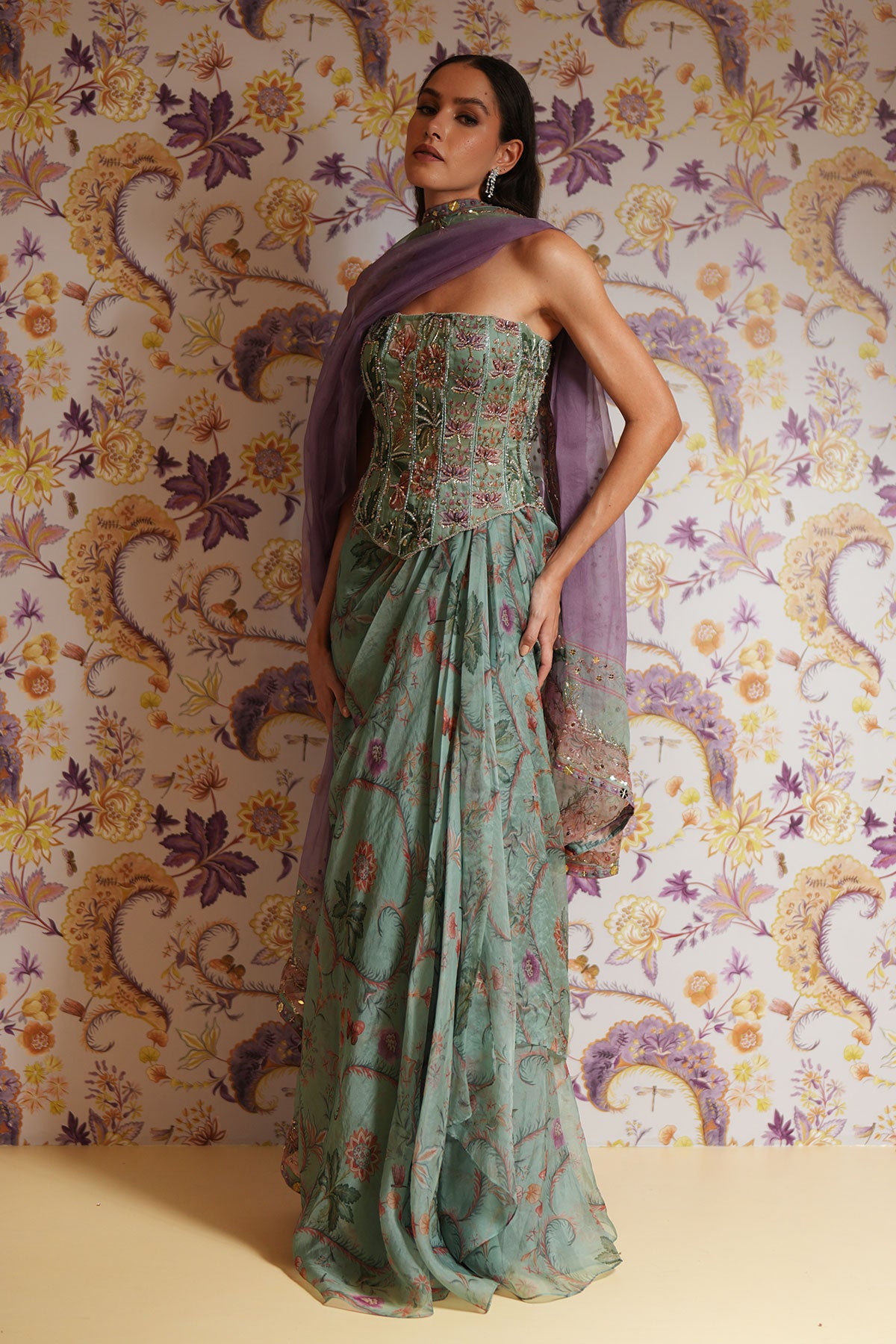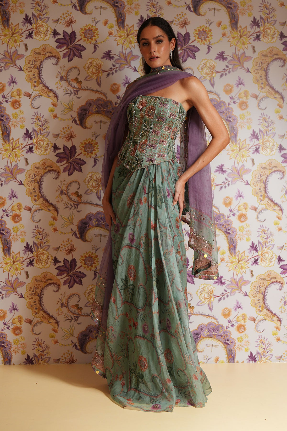 Heavy Embroidered Corset Paired With Draped Skirt And Dupatta