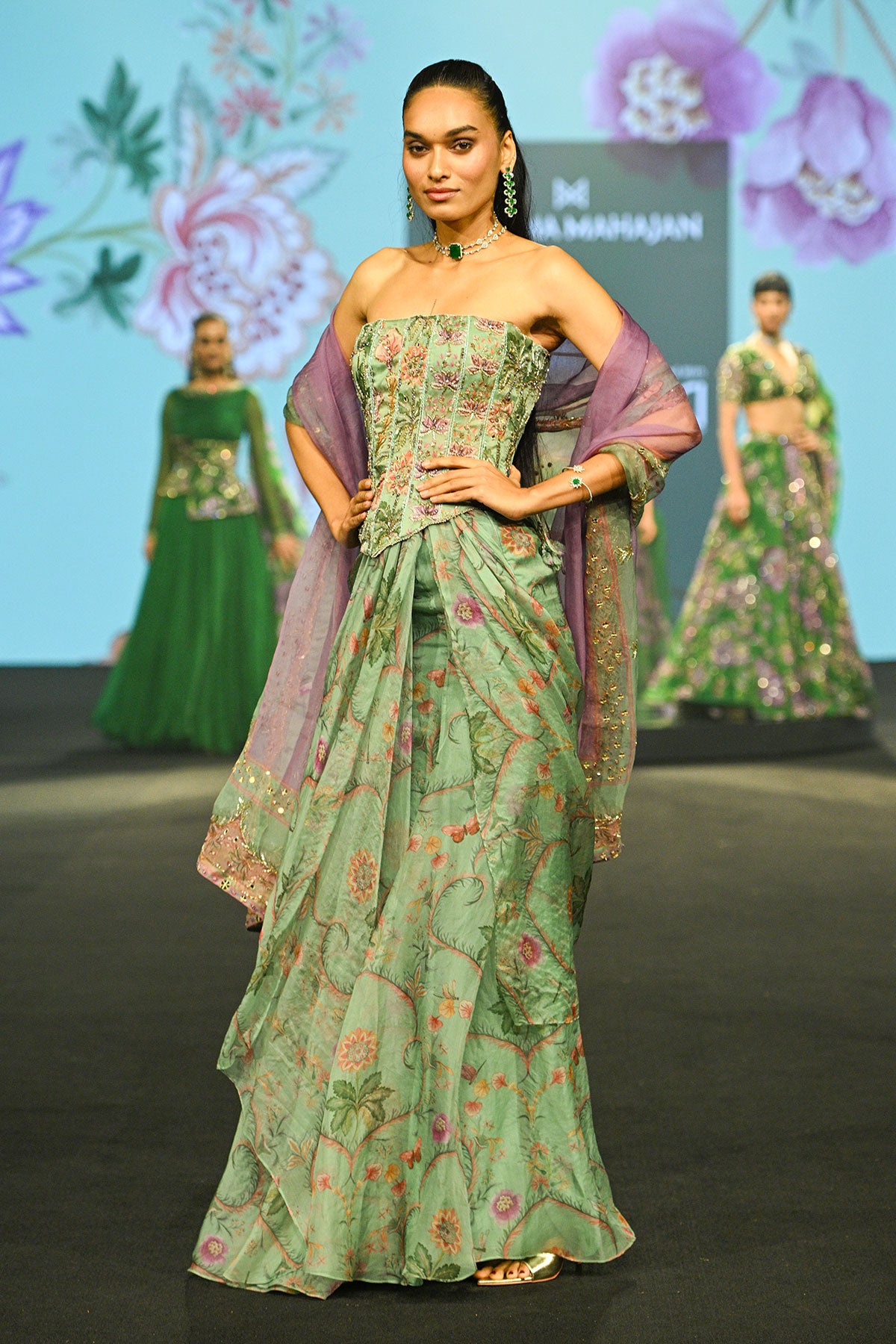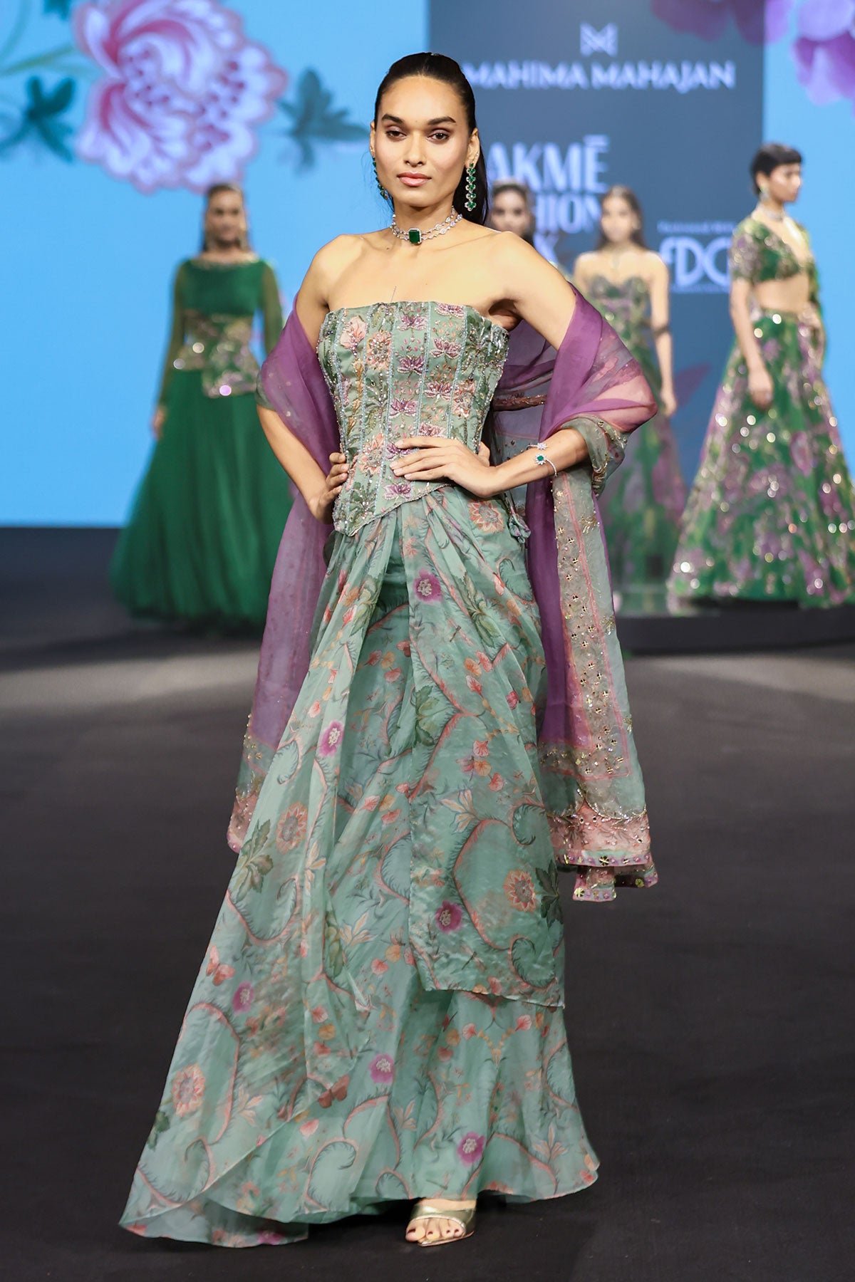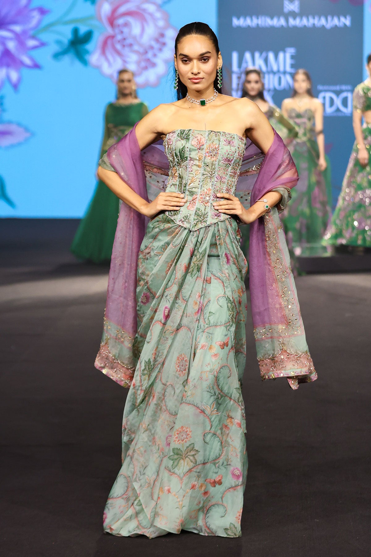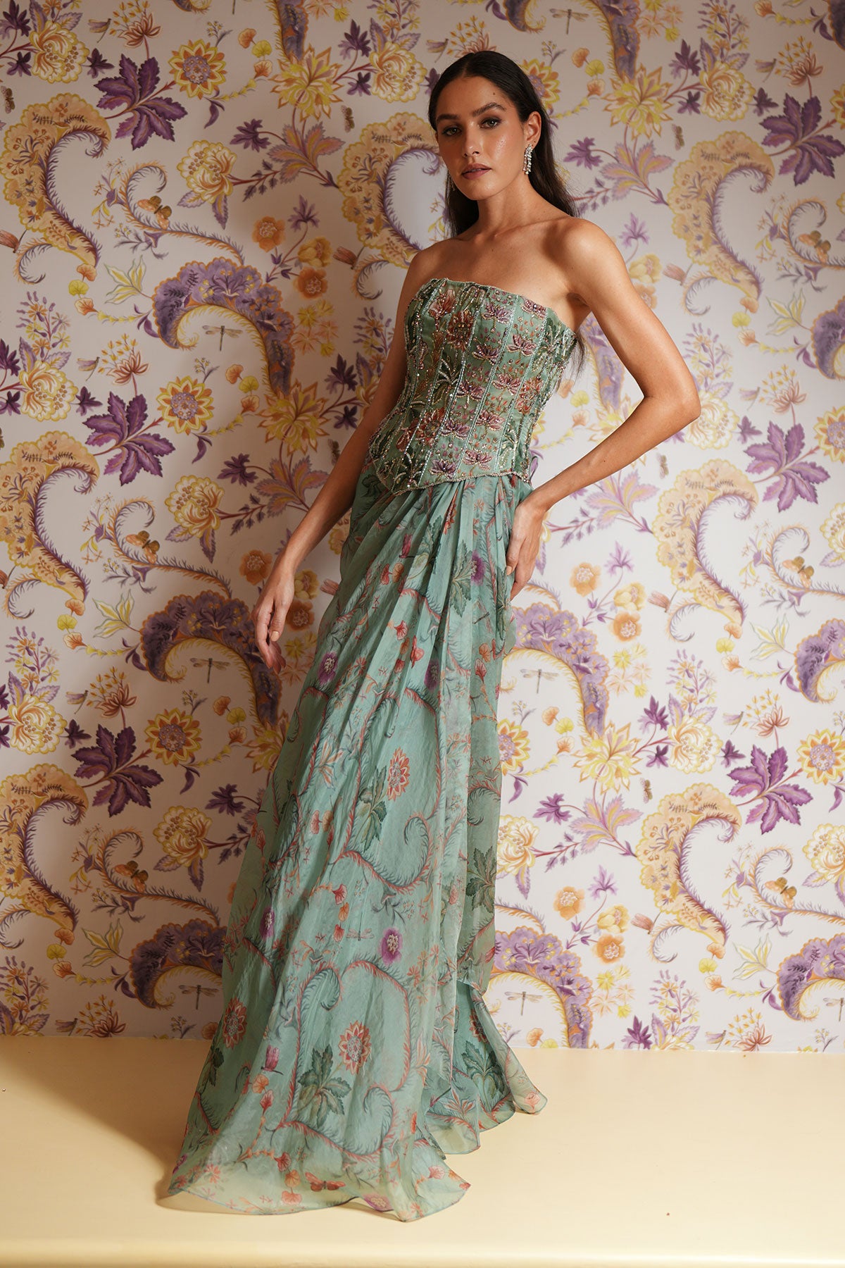 Heavy Embroidered Corset Paired With Draped Skirt And Dupatta