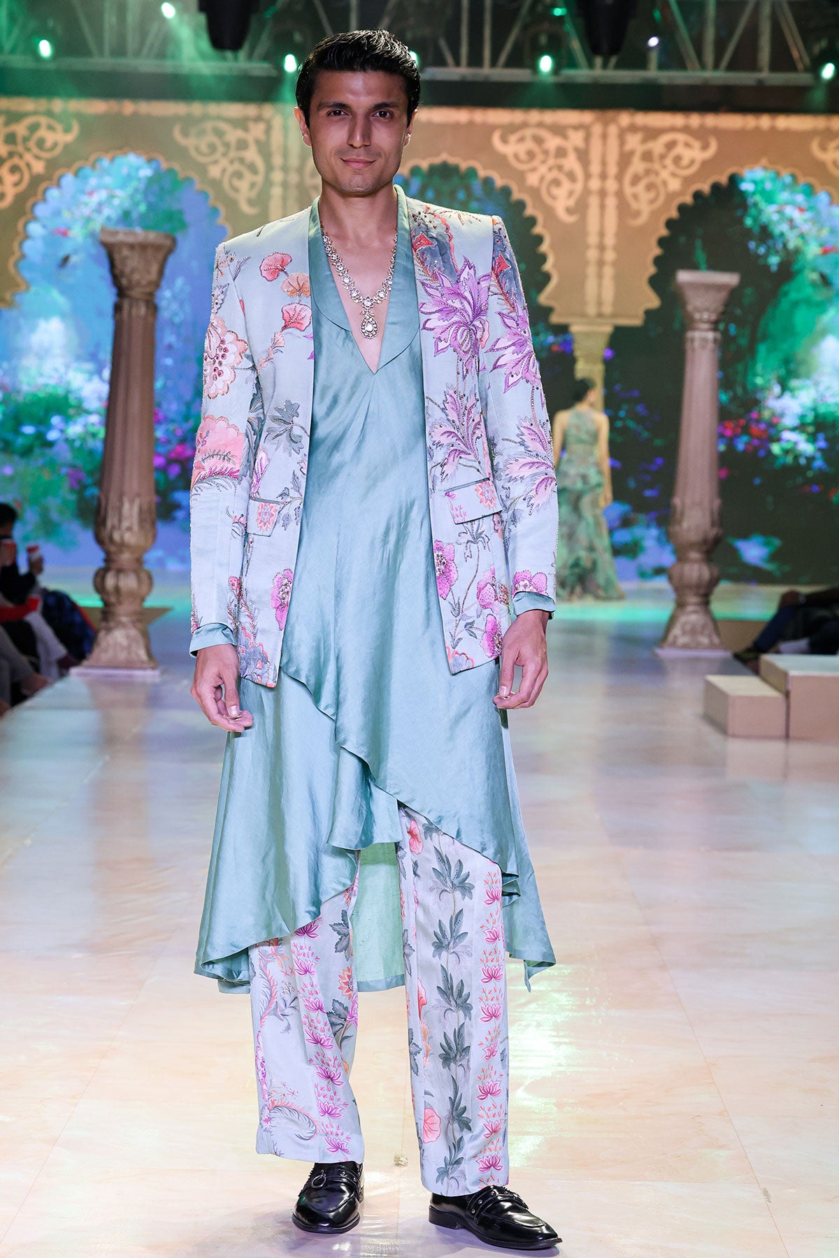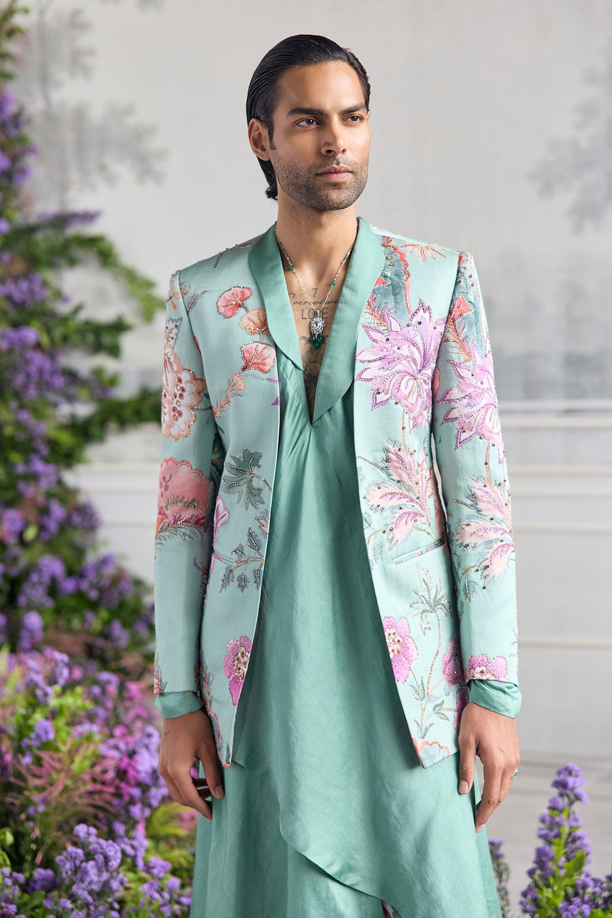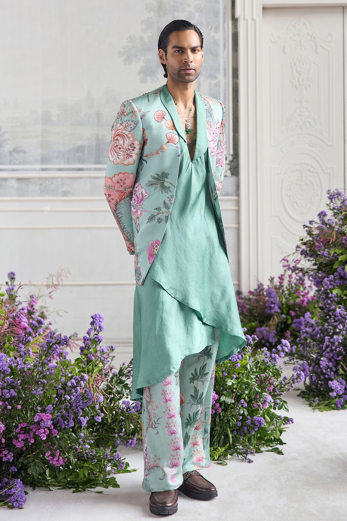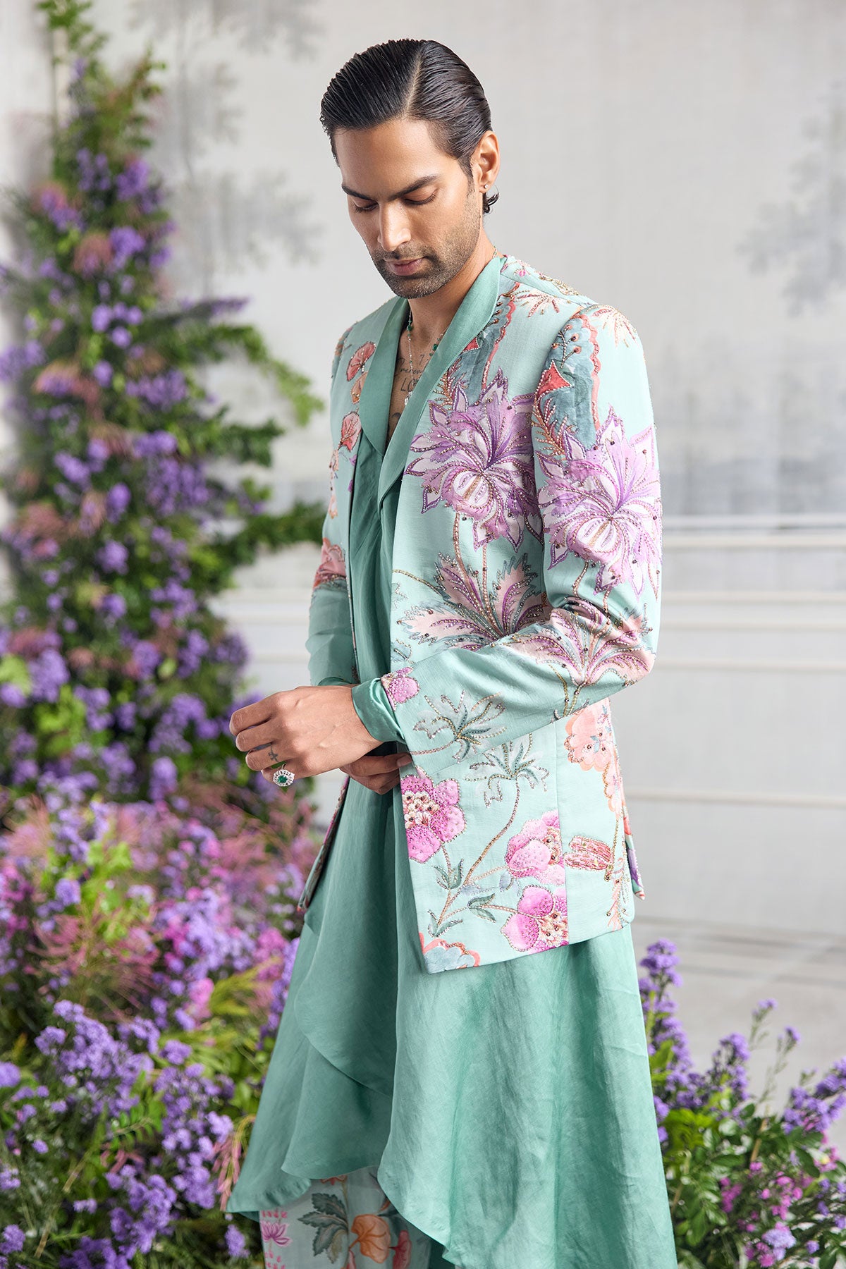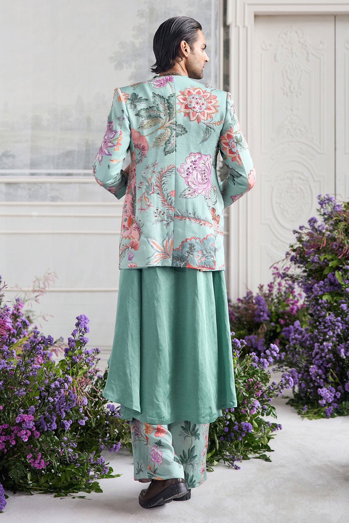 PANELLED HAND EMBROIDERED BLAZER PAIRED WITH ANGRAKHA KURTA AND QUILTED TROUSER