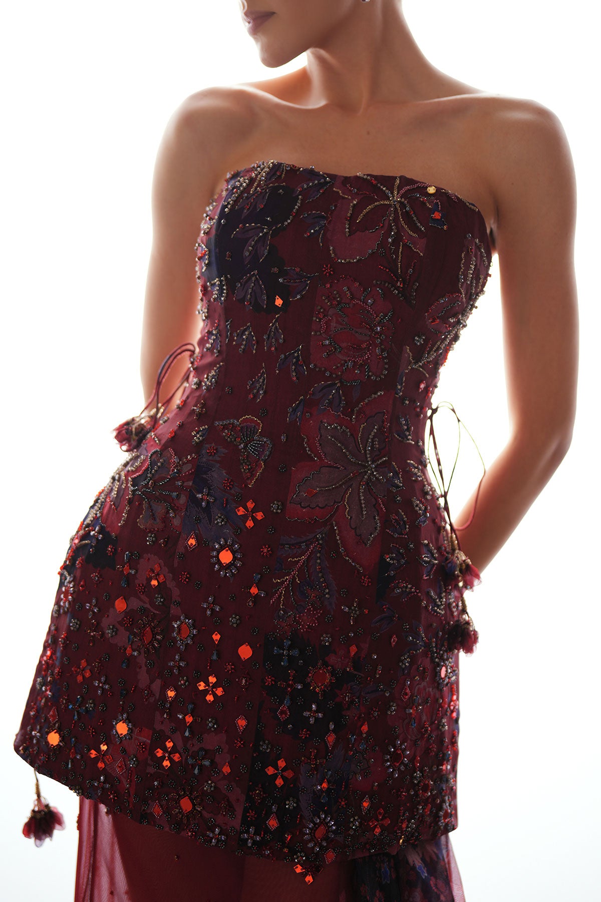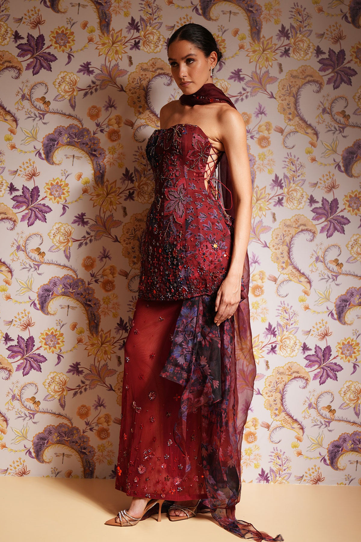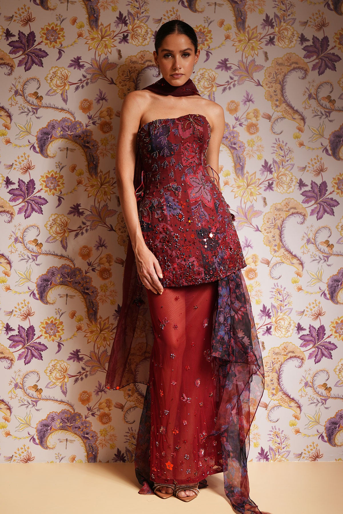 Sculpted Embroidered Tube Dress Paired With Embroidered Draped Skirt And Dupatta