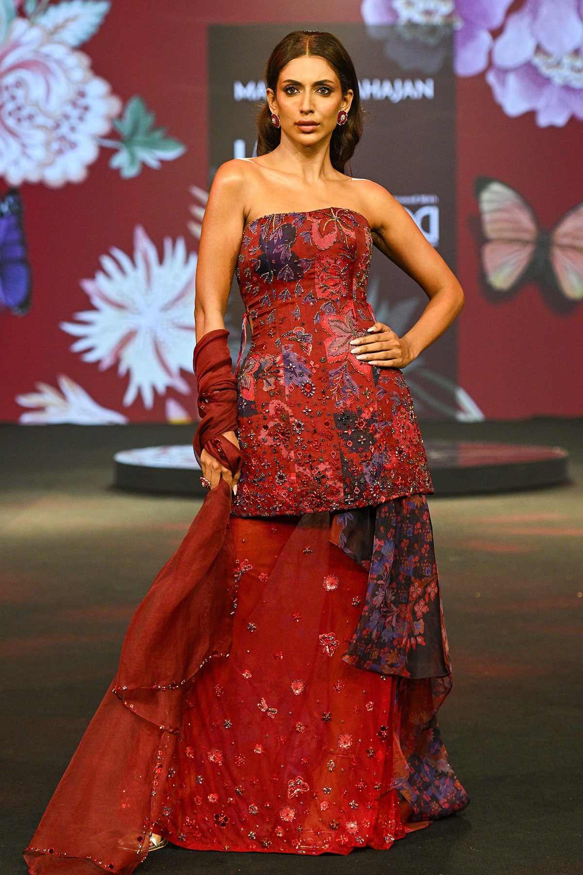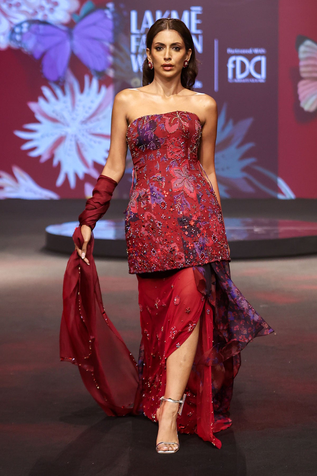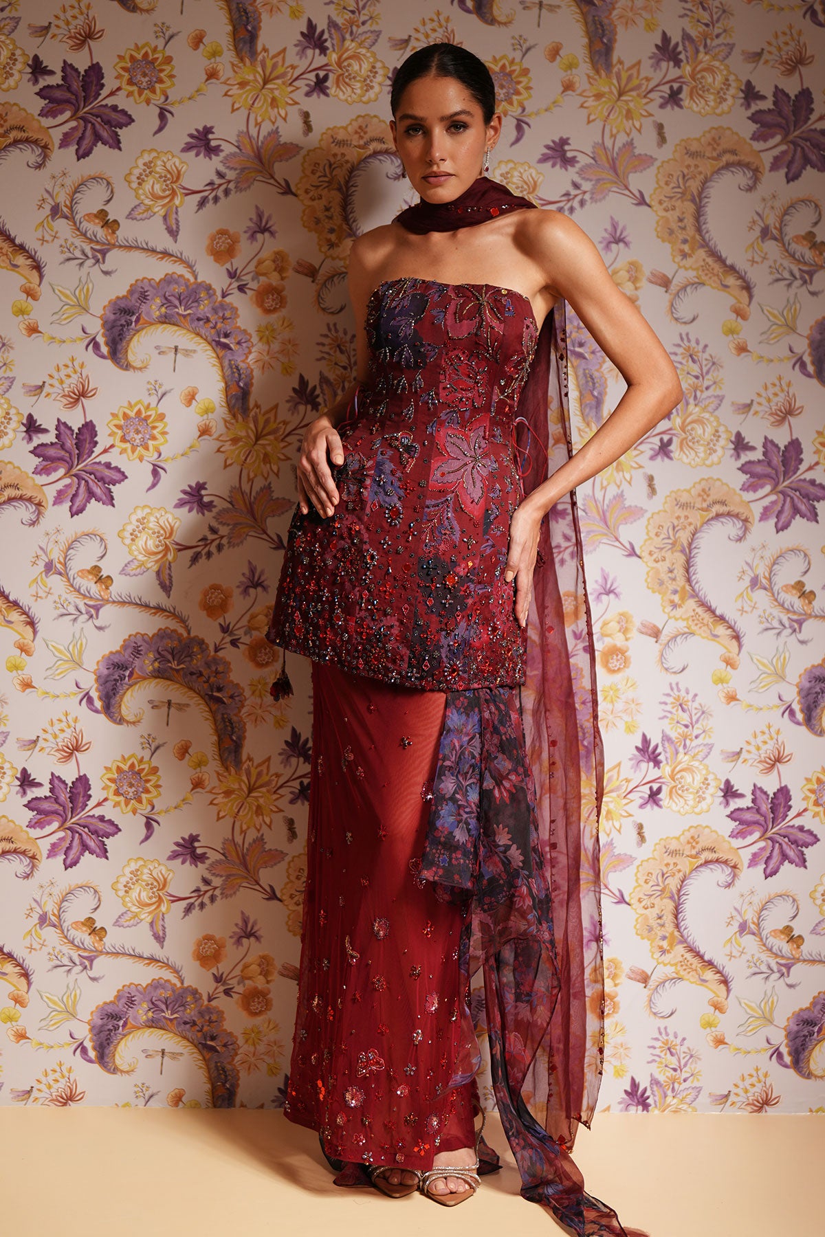 Sculpted Embroidered Tube Dress Paired With Embroidered Draped Skirt And Dupatta