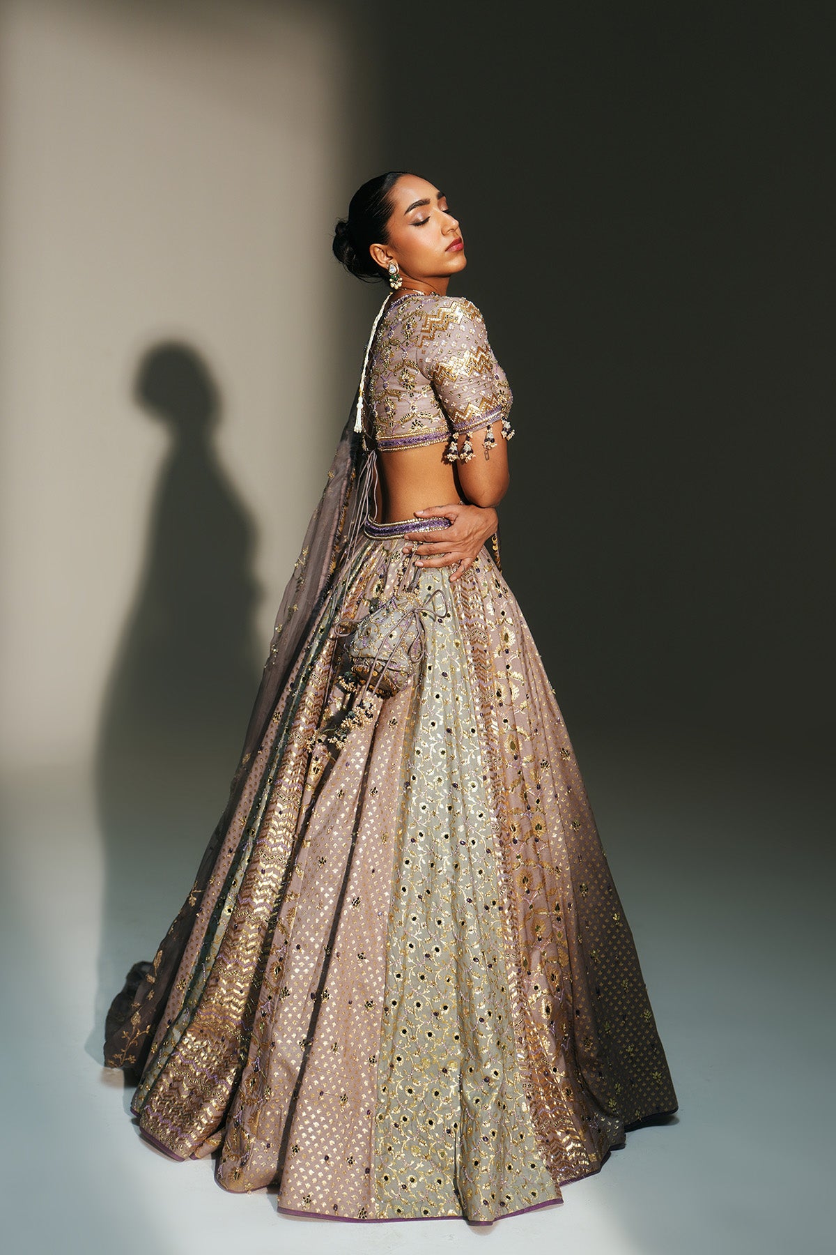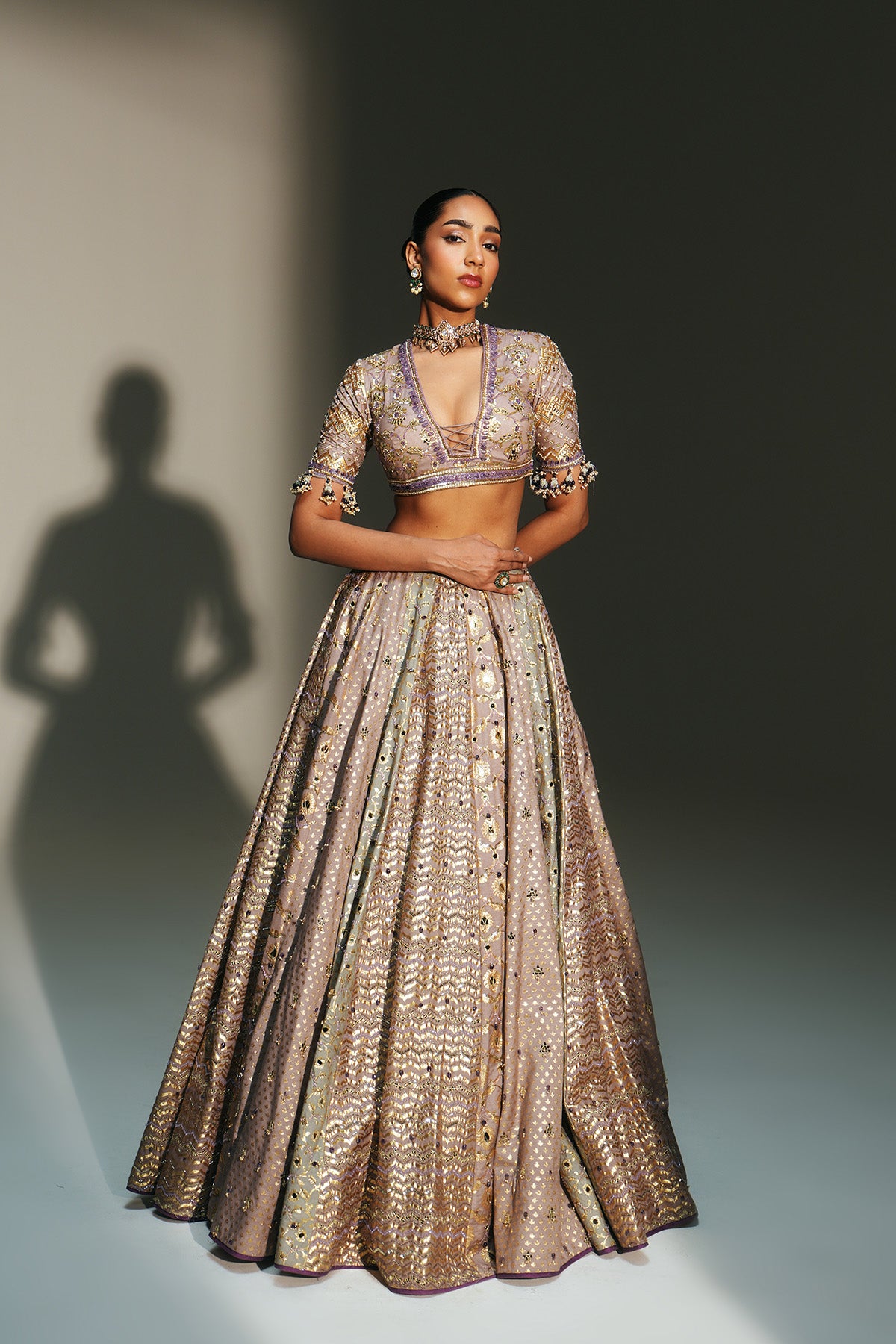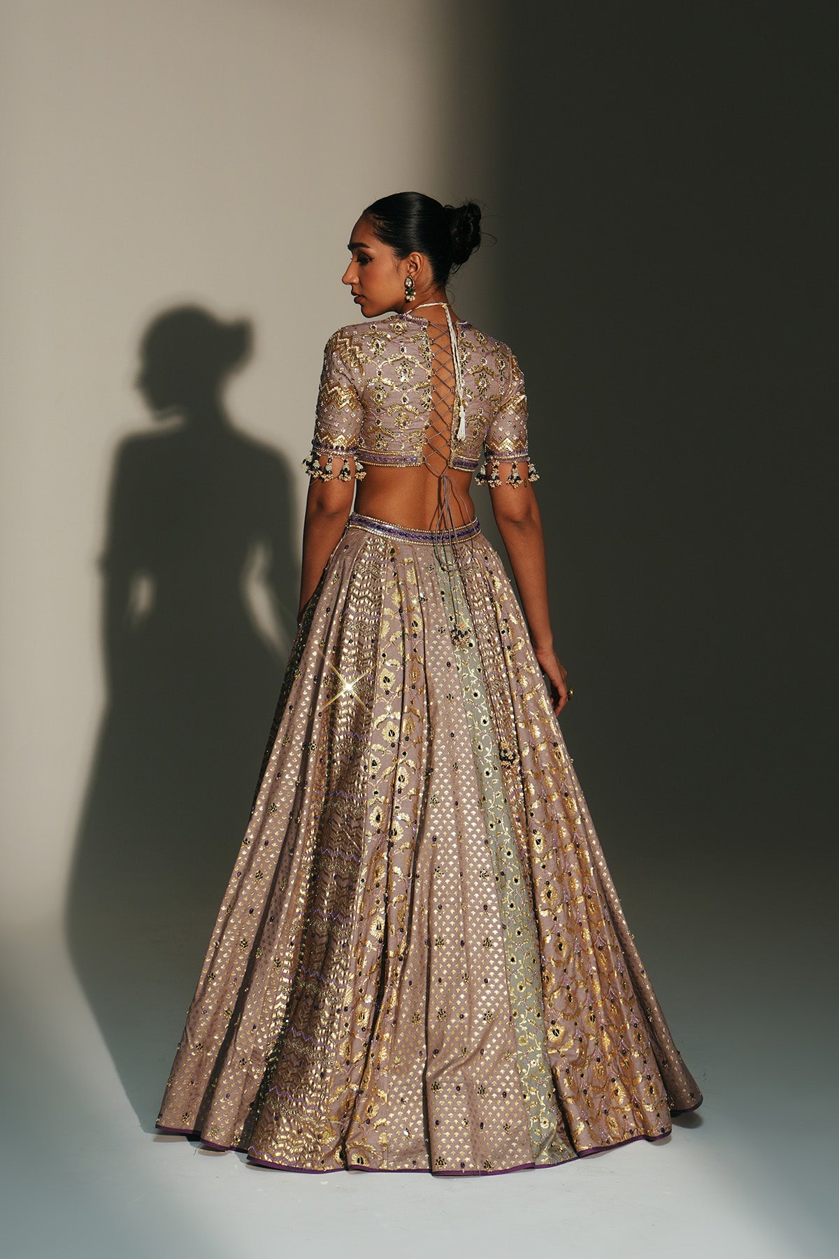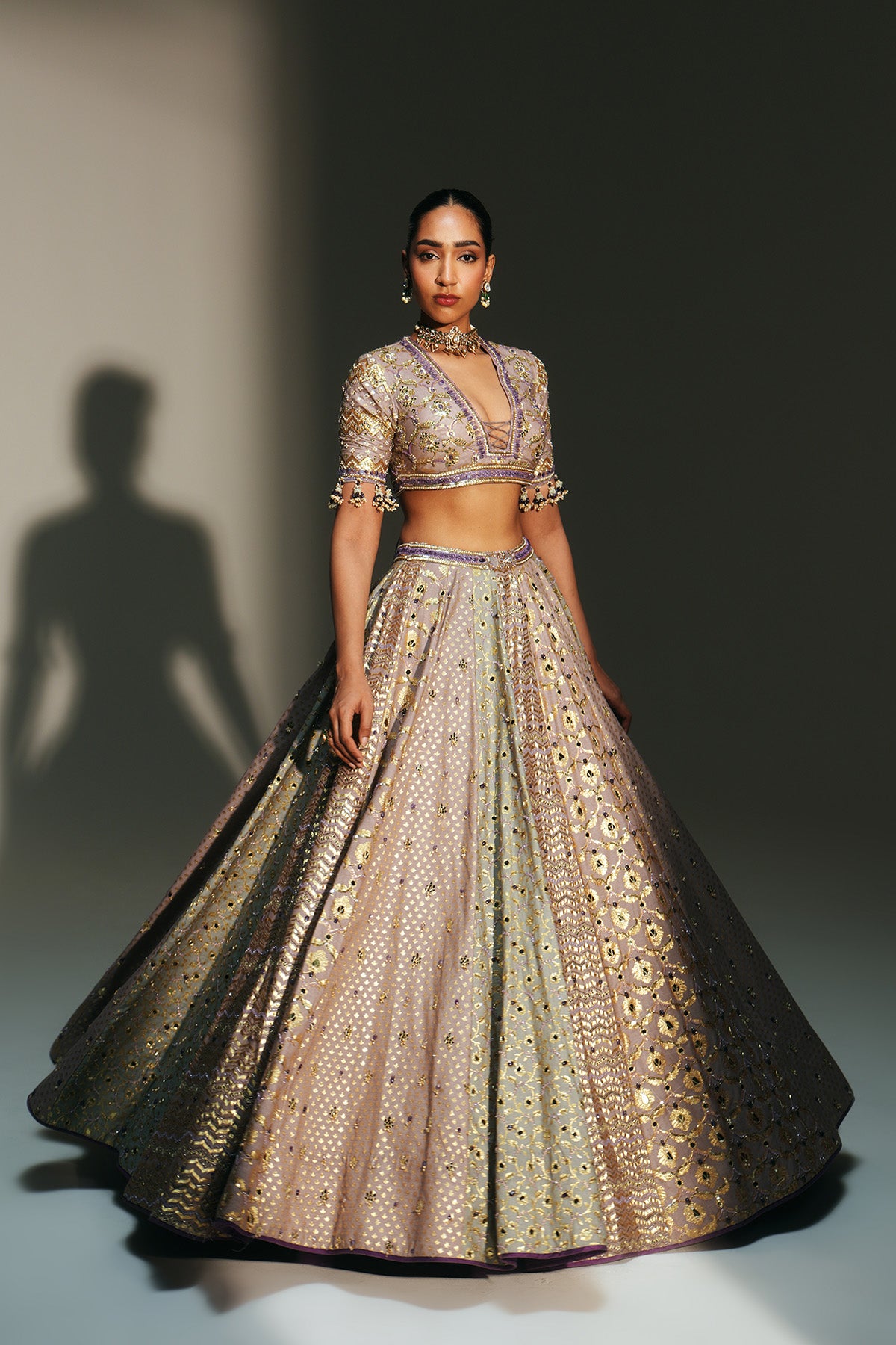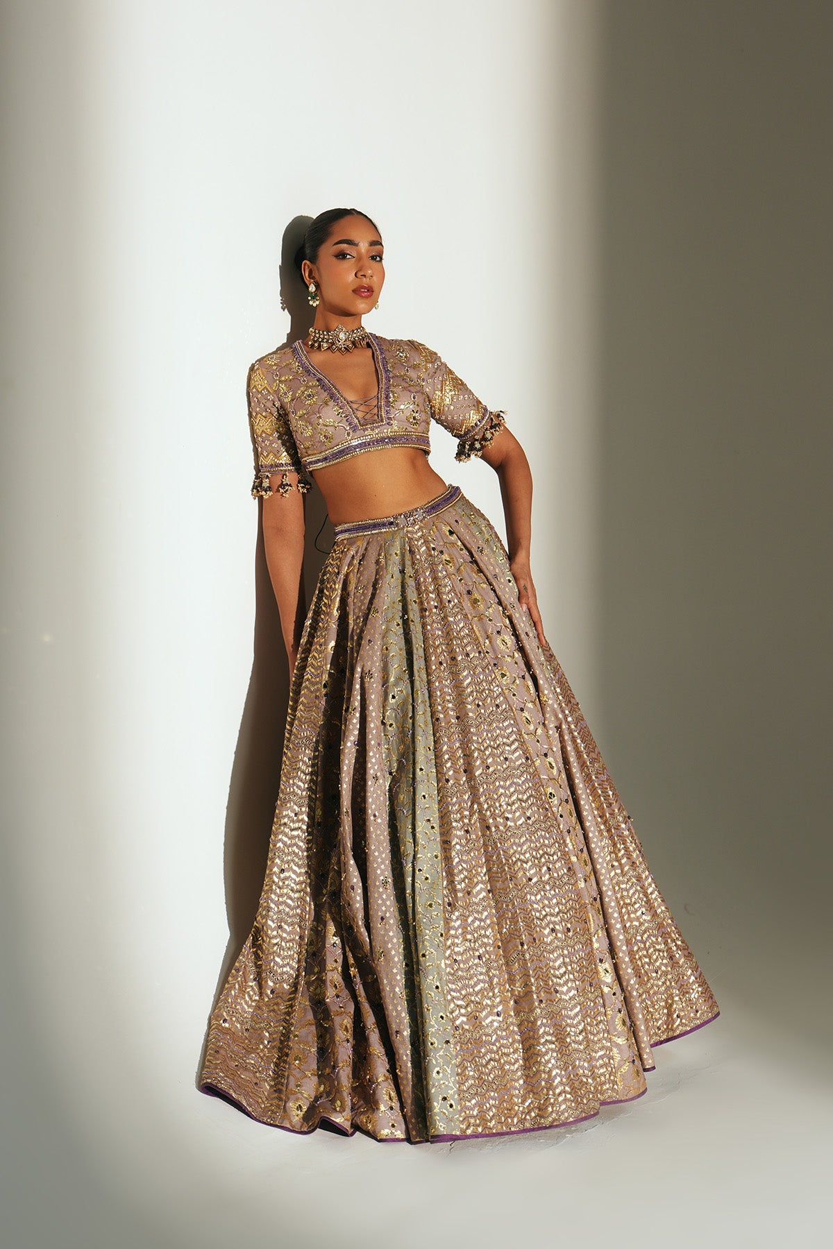 HAND EMBROIDERED LEHENGA FEATURING DRAGON FLY LOGO ON WAIST BELT PAIRED WITH MATCHING EMBROIDERE D BLOUSE AND DUPATTA