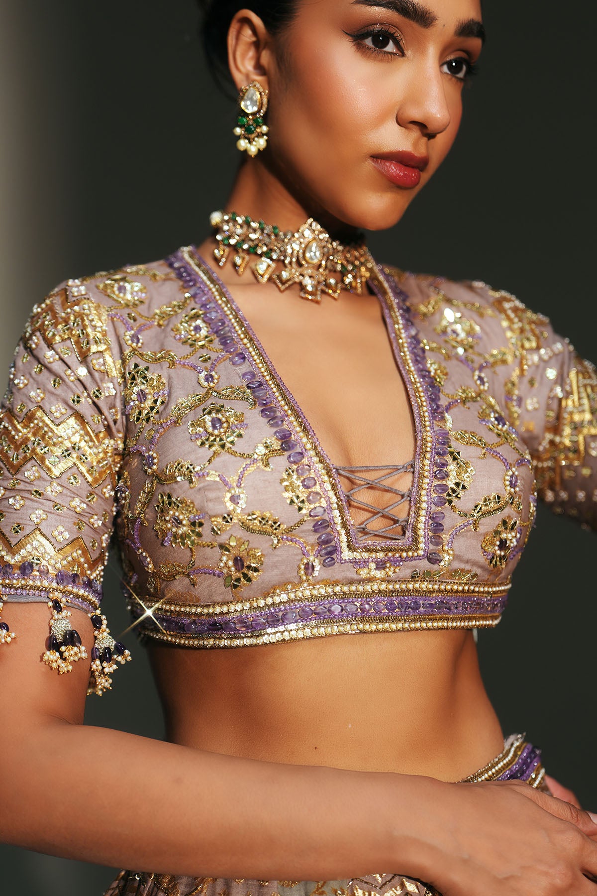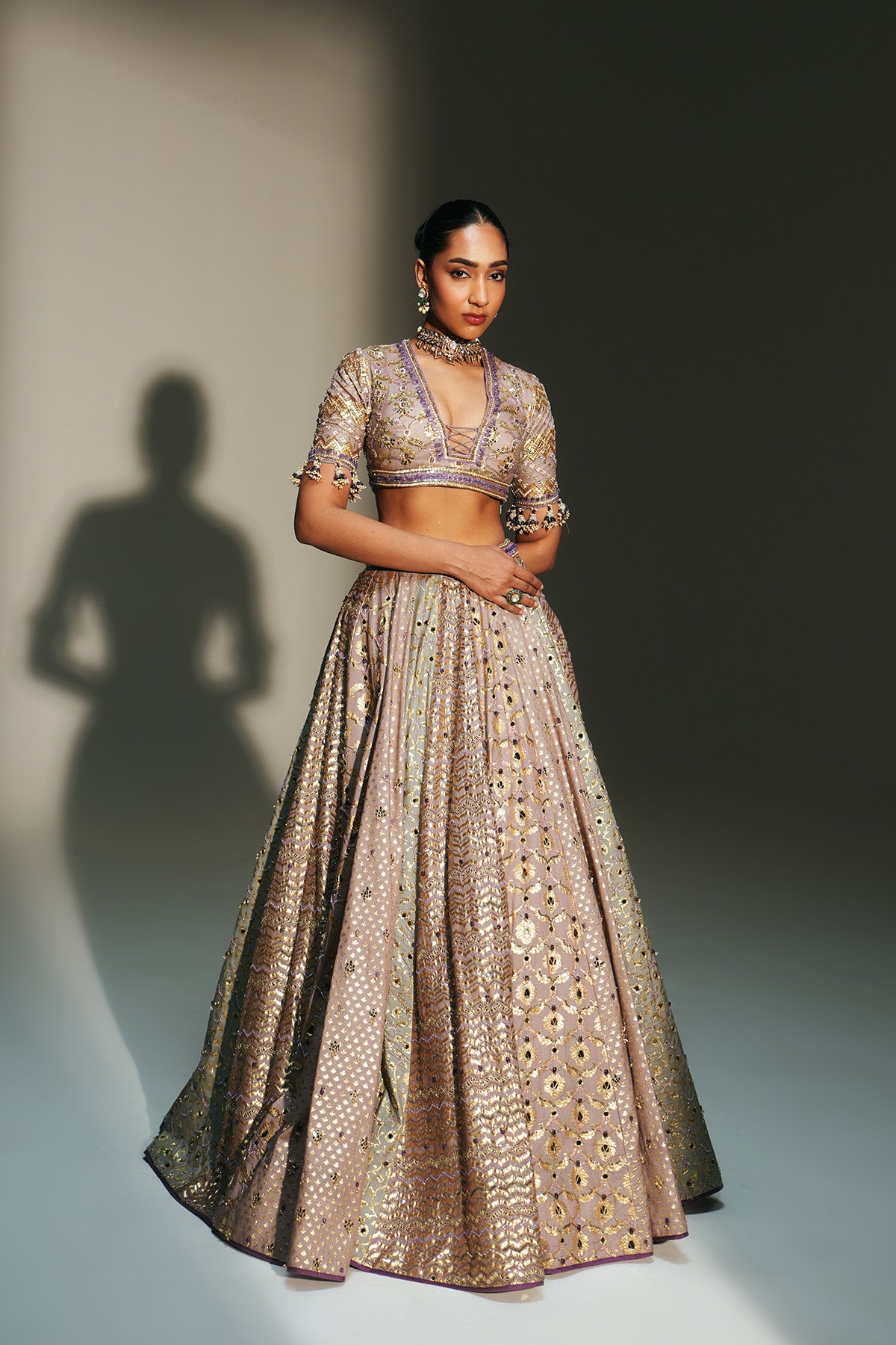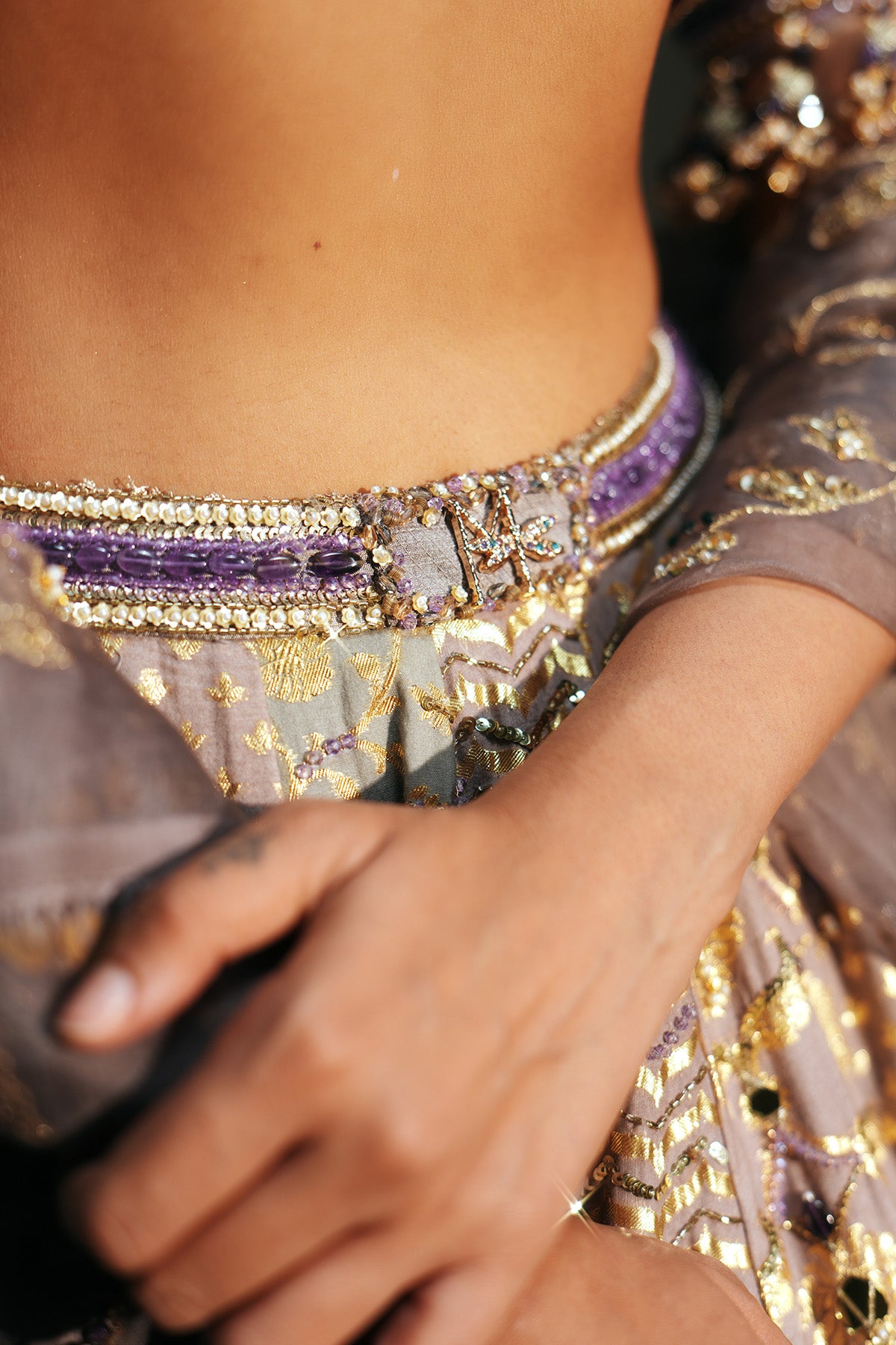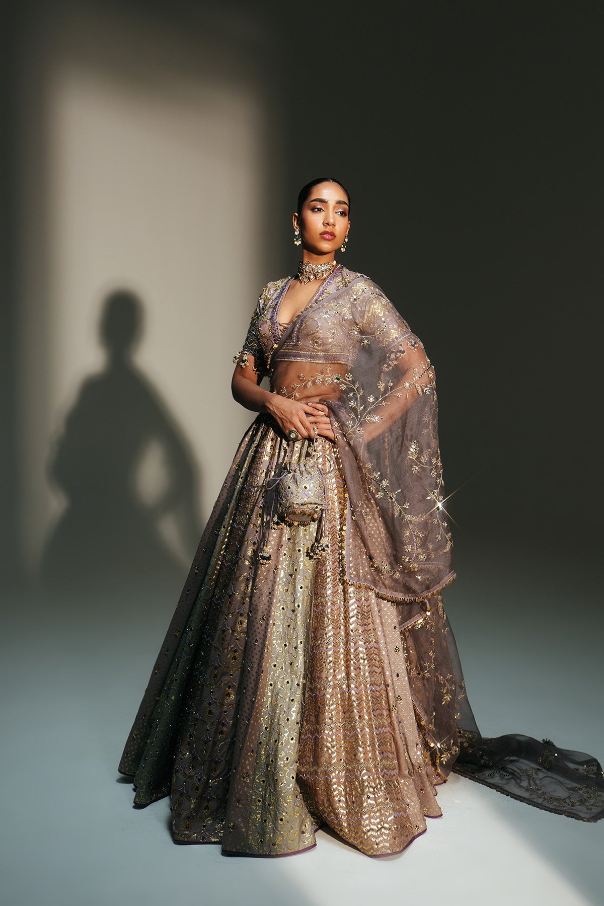 HAND EMBROIDERED LEHENGA FEATURING DRAGON FLY LOGO ON WAIST BELT PAIRED WITH MATCHING EMBROIDERE D BLOUSE AND DUPATTA