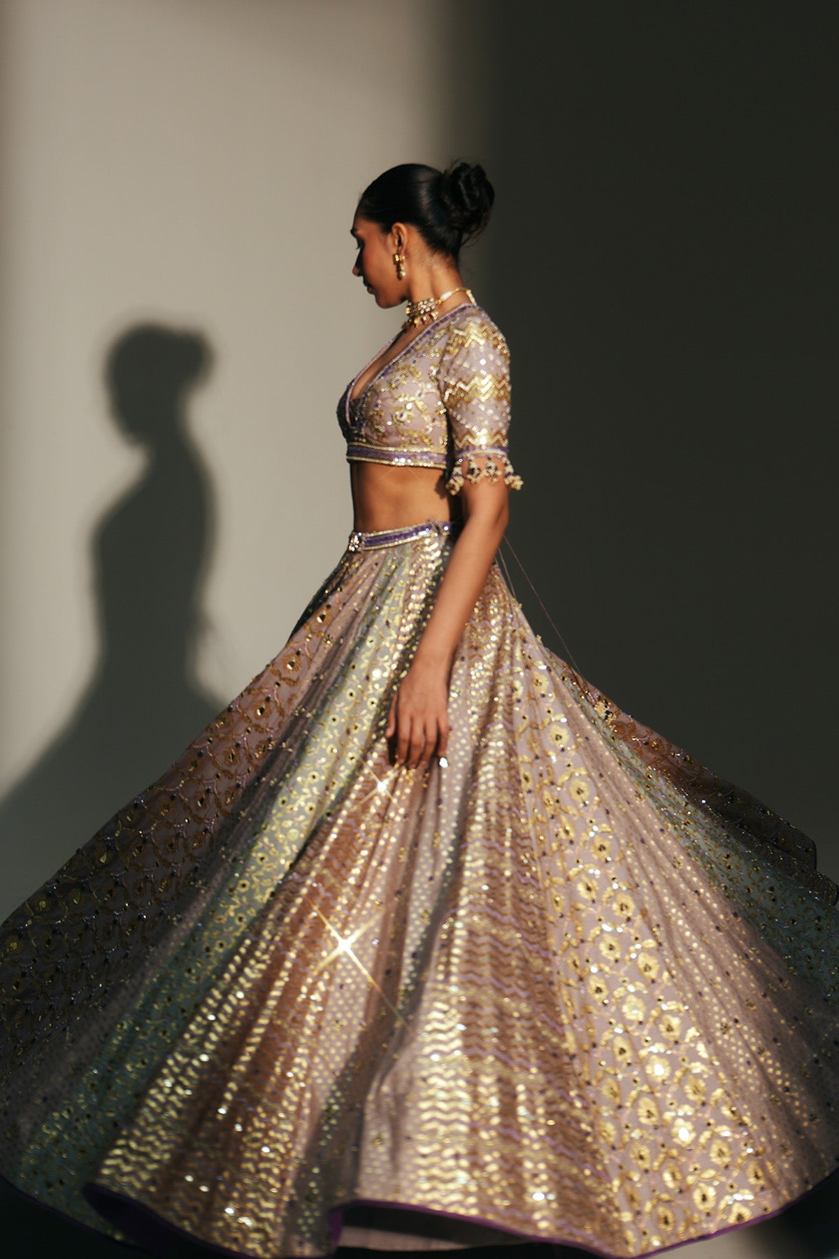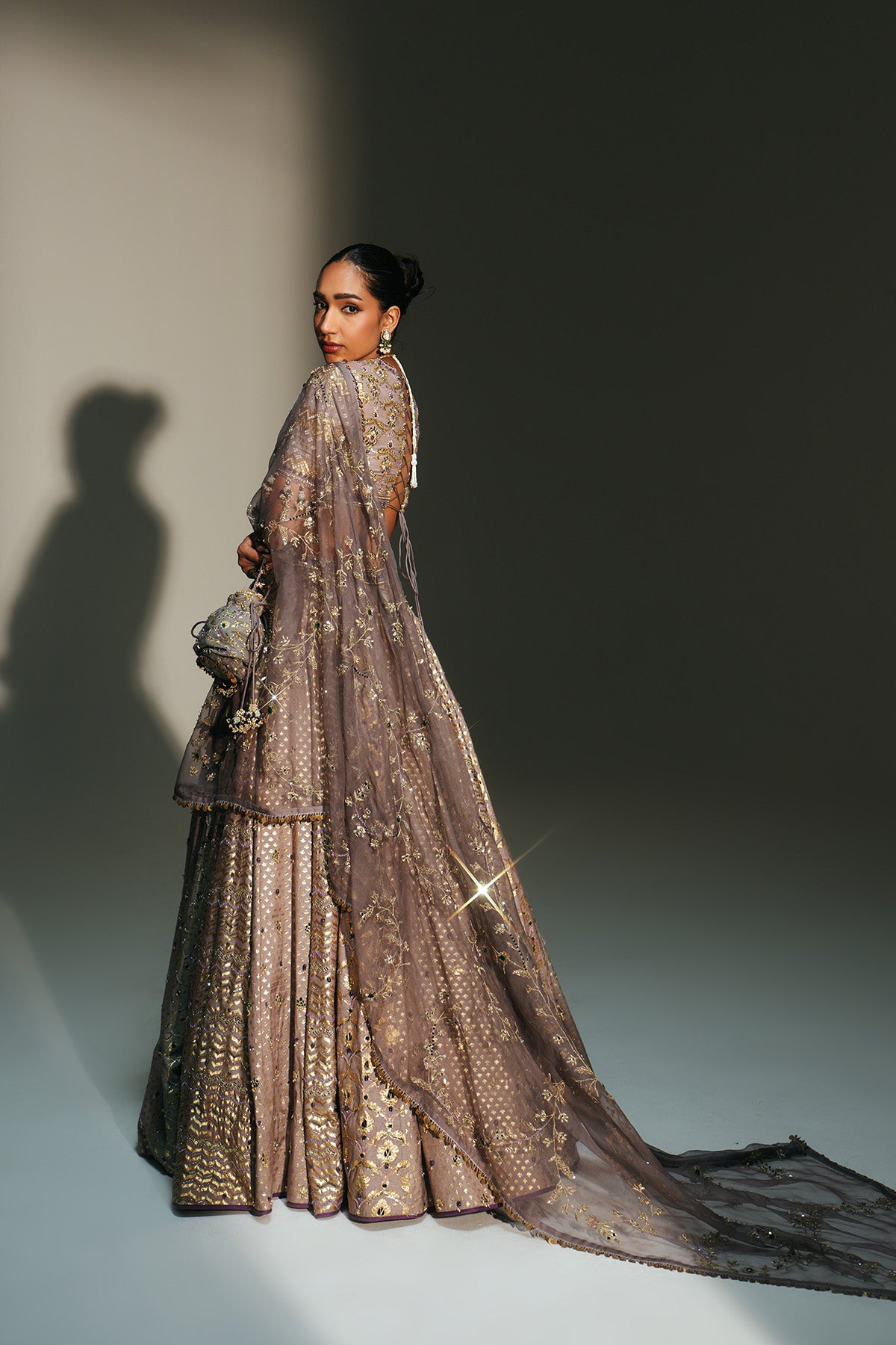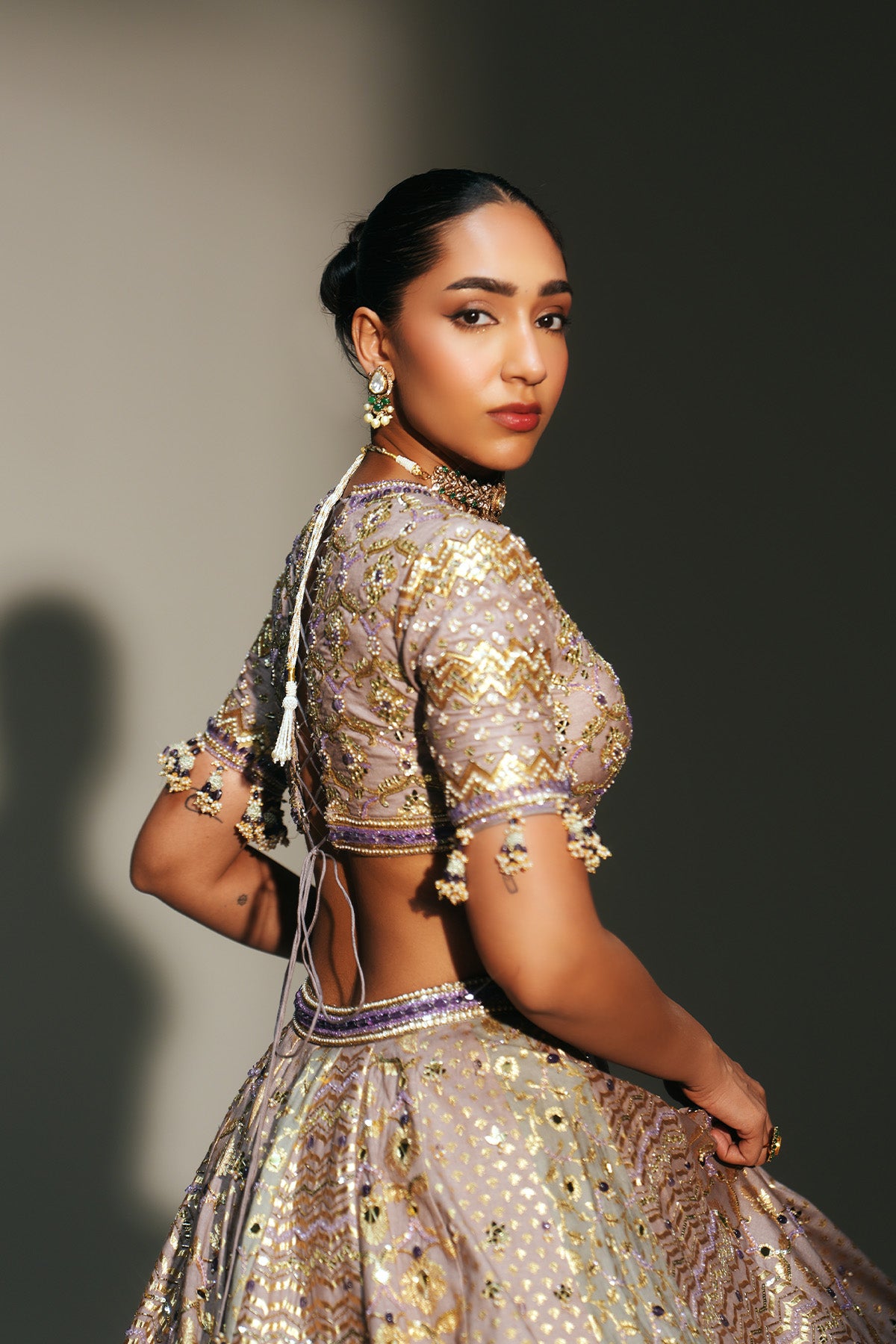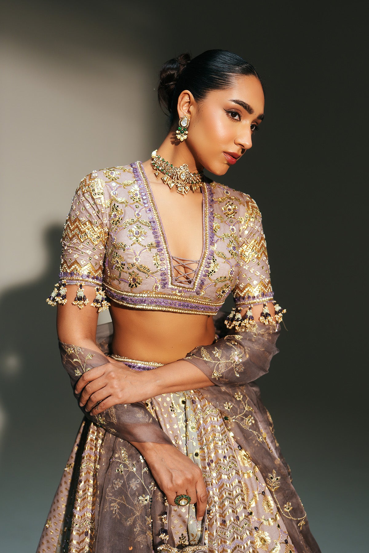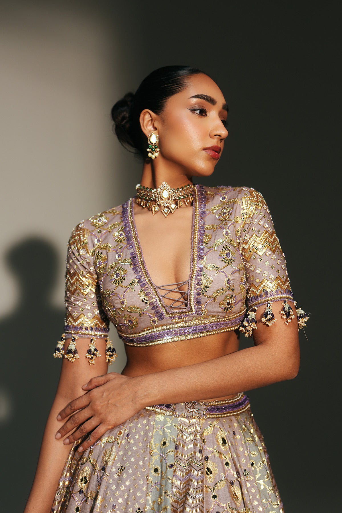 HAND EMBROIDERED LEHENGA FEATURING DRAGON FLY LOGO ON WAIST BELT PAIRED WITH MATCHING EMBROIDERE D BLOUSE AND DUPATTA