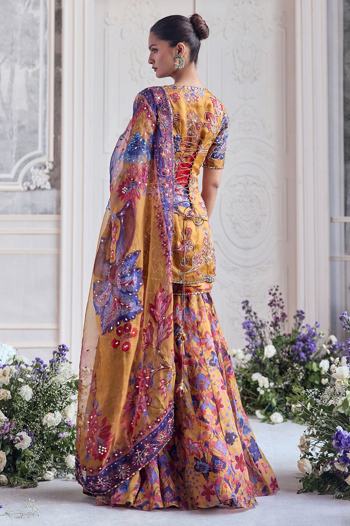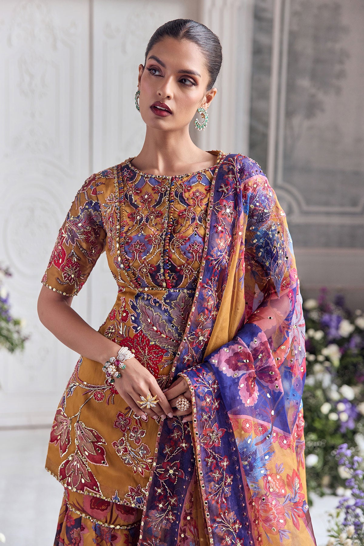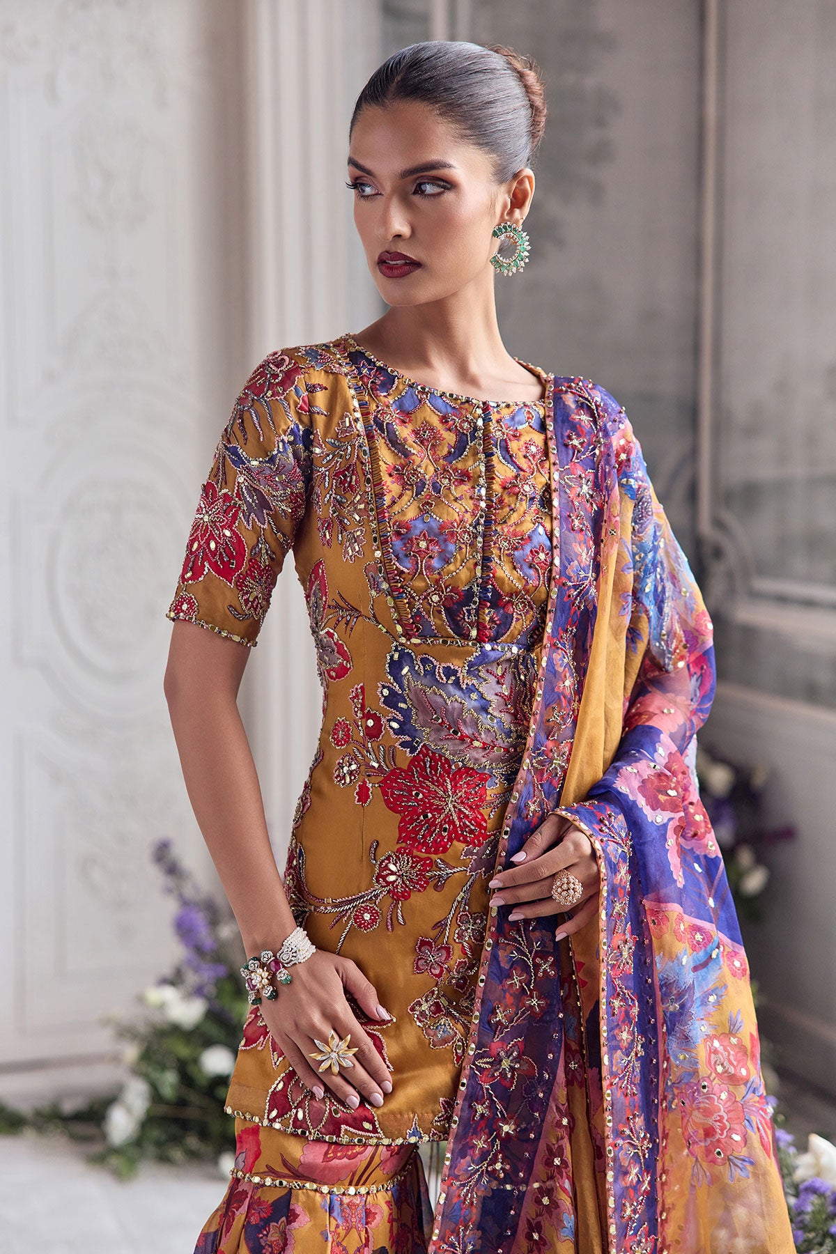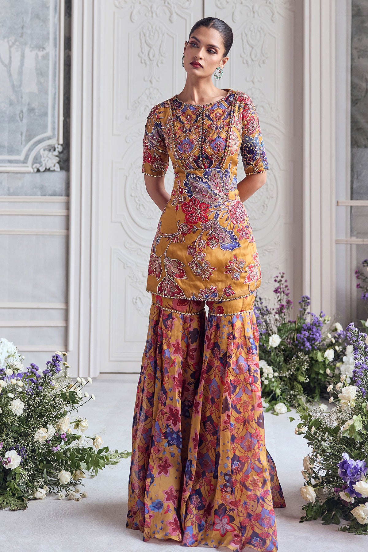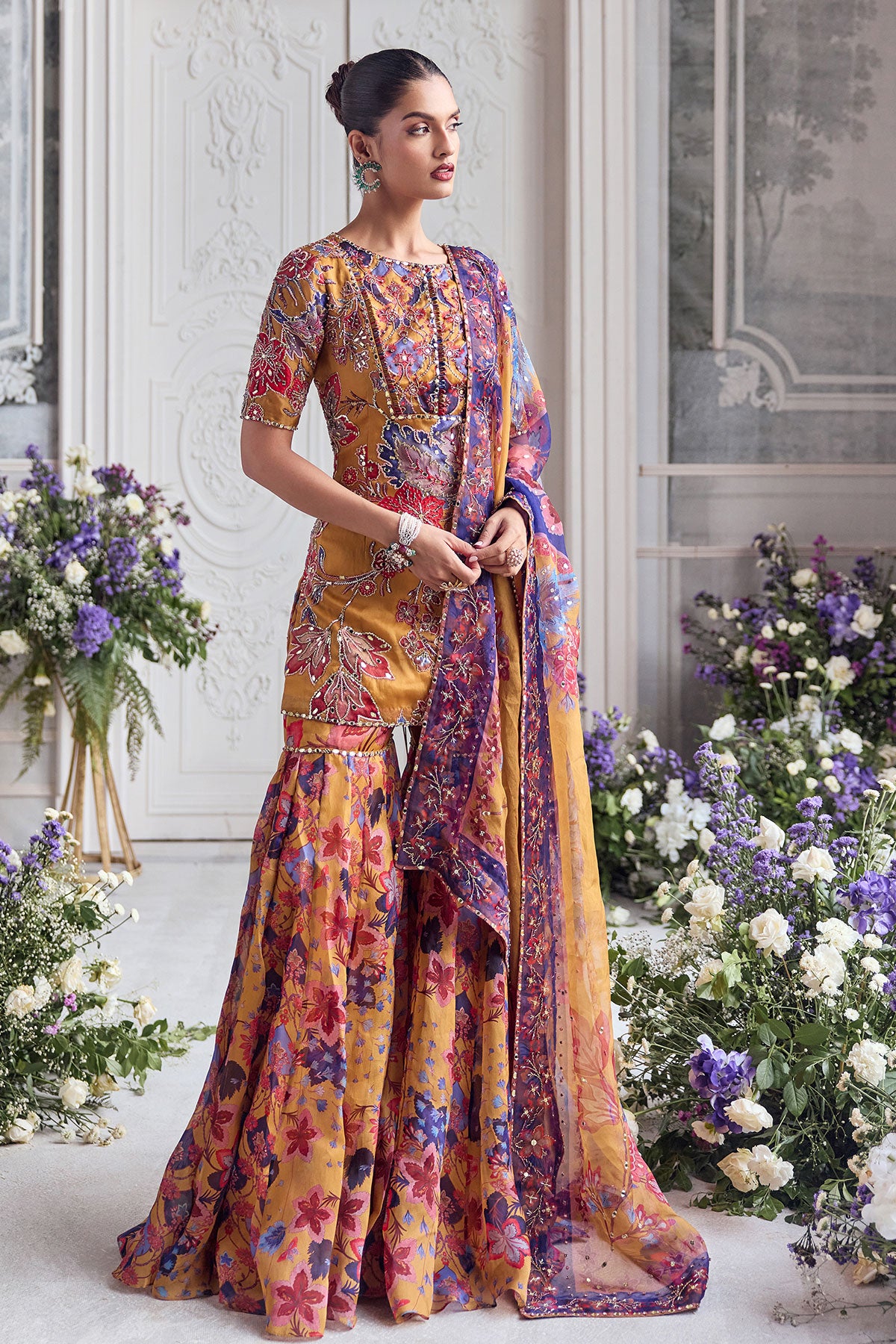 EMNROIDERED KURTA PAIRED WITH DUPATTA AND FLORAL SHARARA
