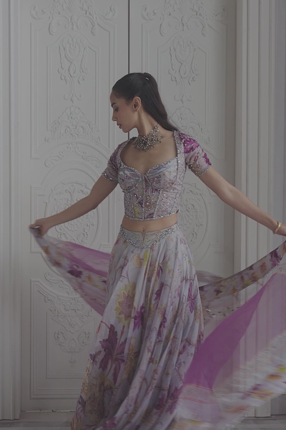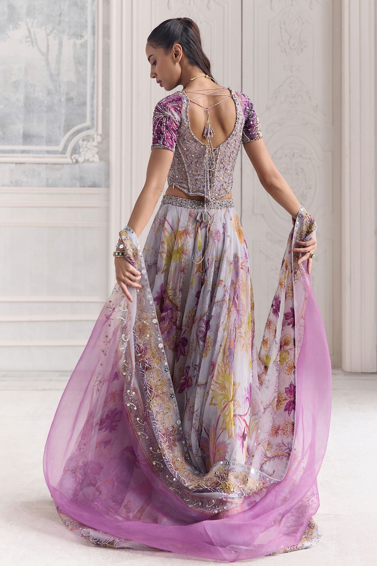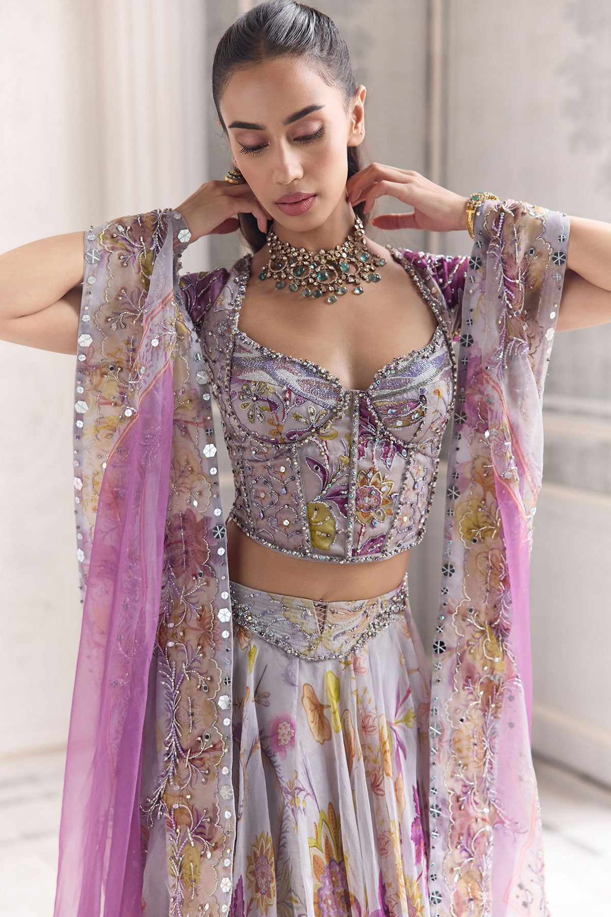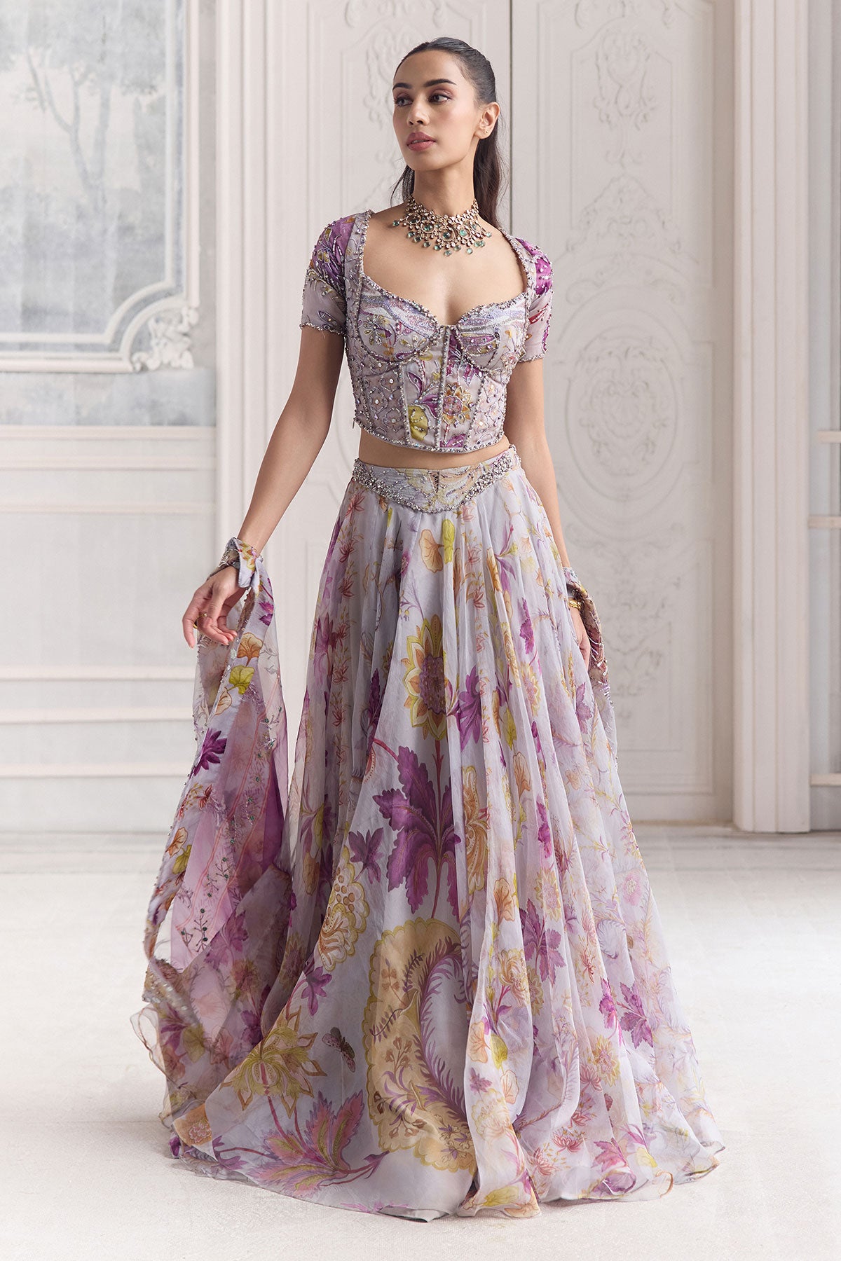 EMBRODIERED SLEEVED CORSET TOP PAIRED WITH EMBROIDERED DUPATTA AND FLORAL LEHENGA