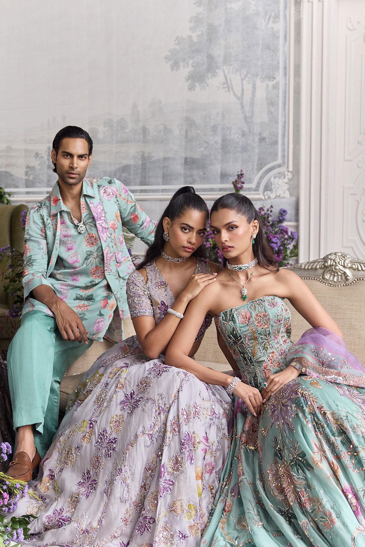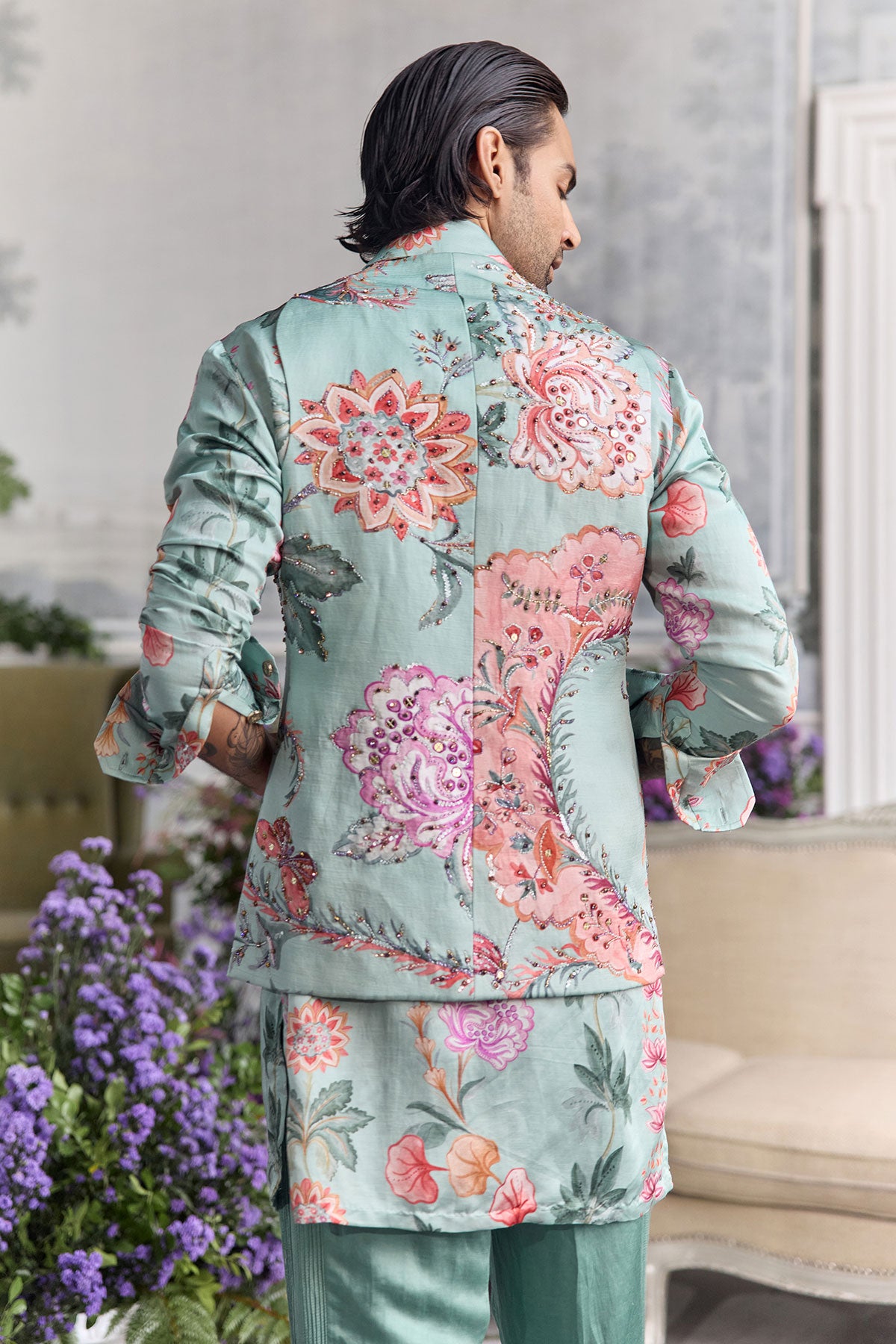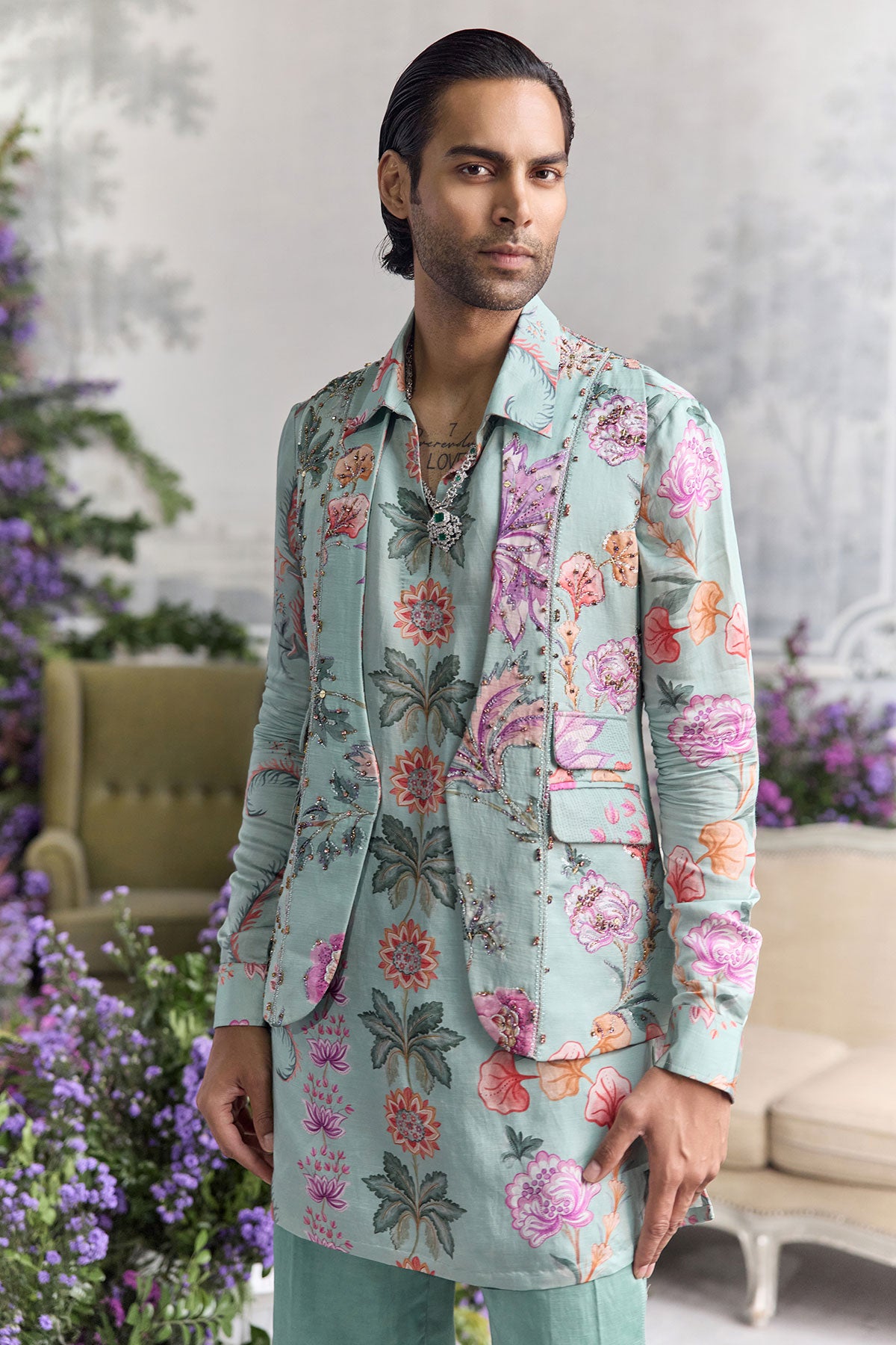 PANELLED HAND EMBRODIERED BUNDI WITH QUILTING DETAILS PAIRED WITH SHORT KURTA AND TROUSERS