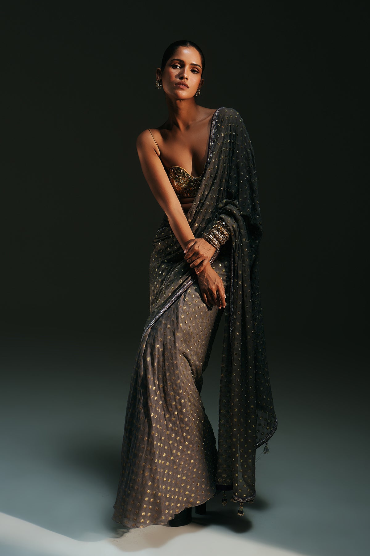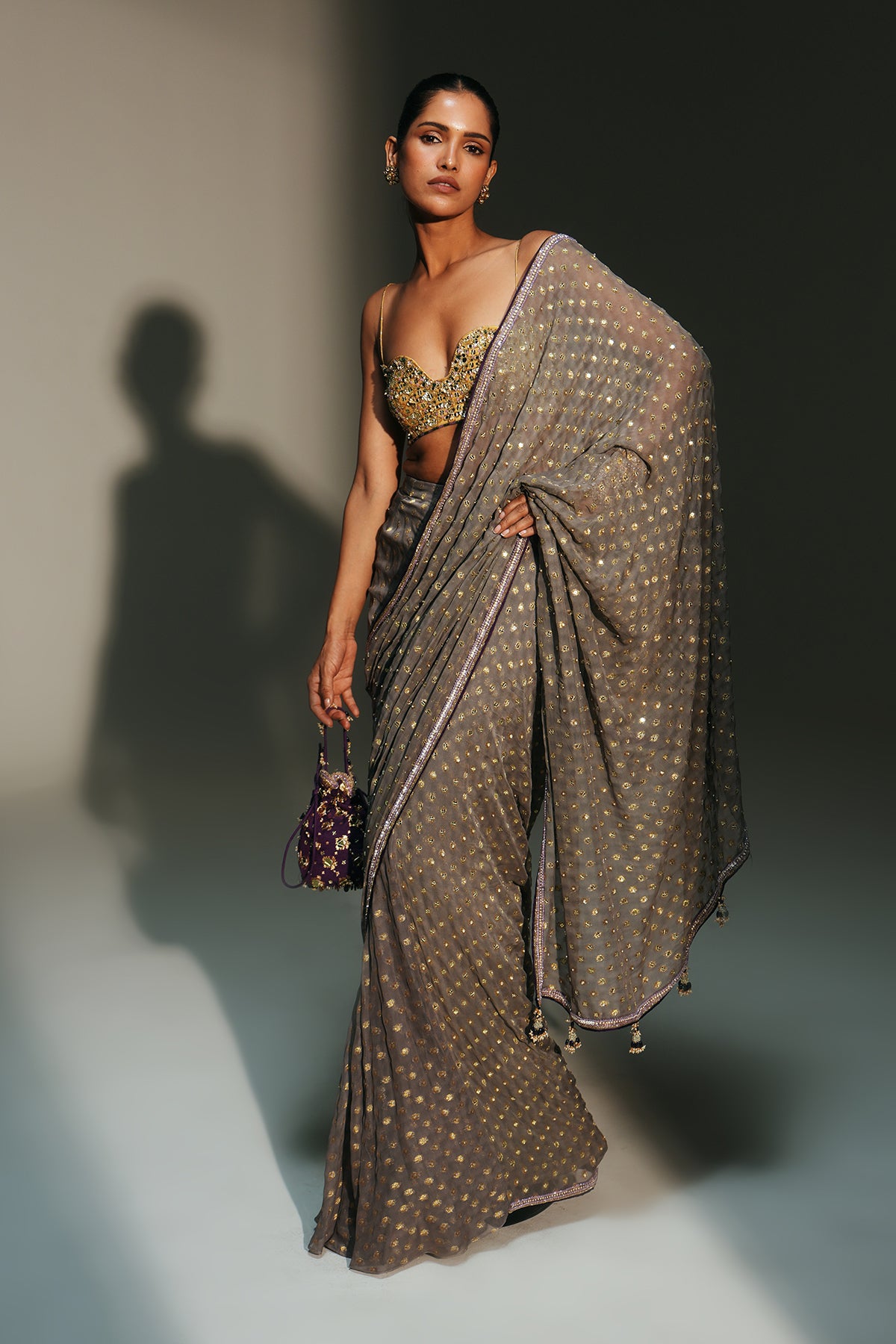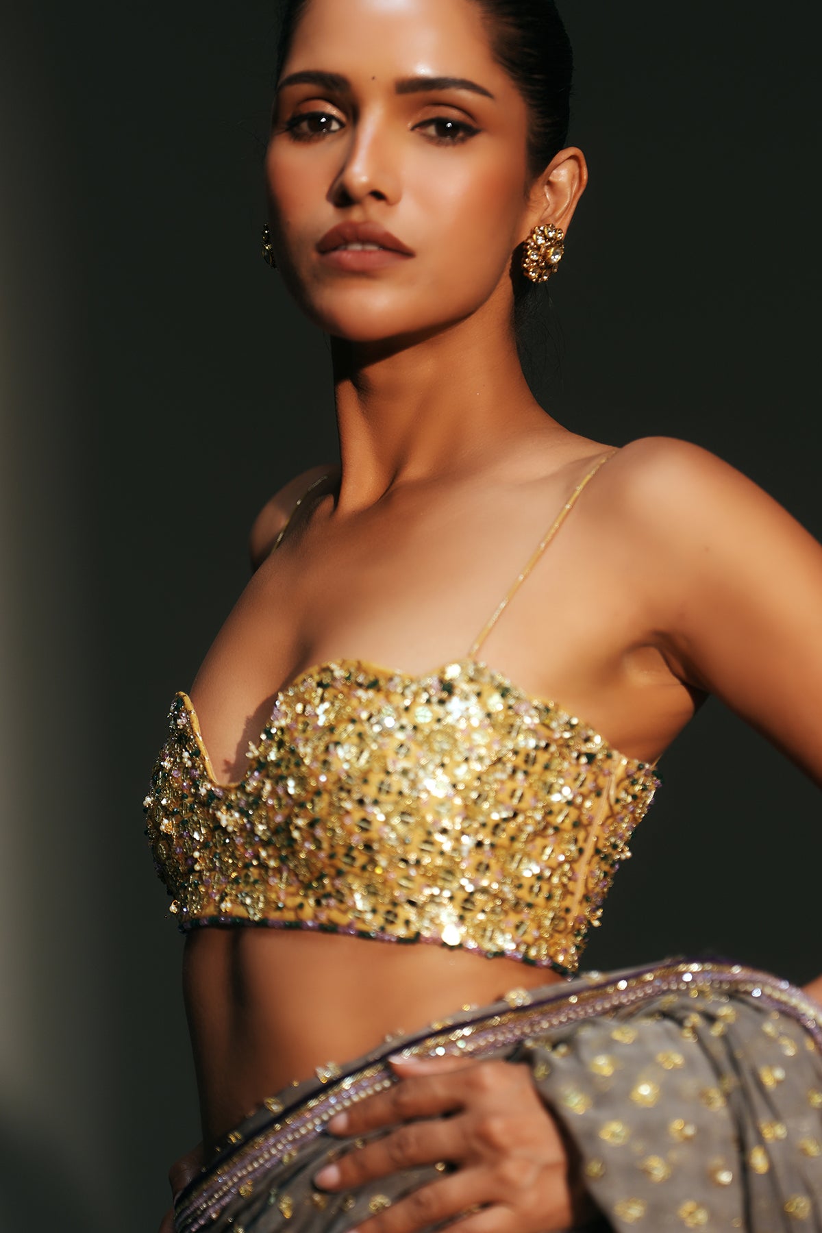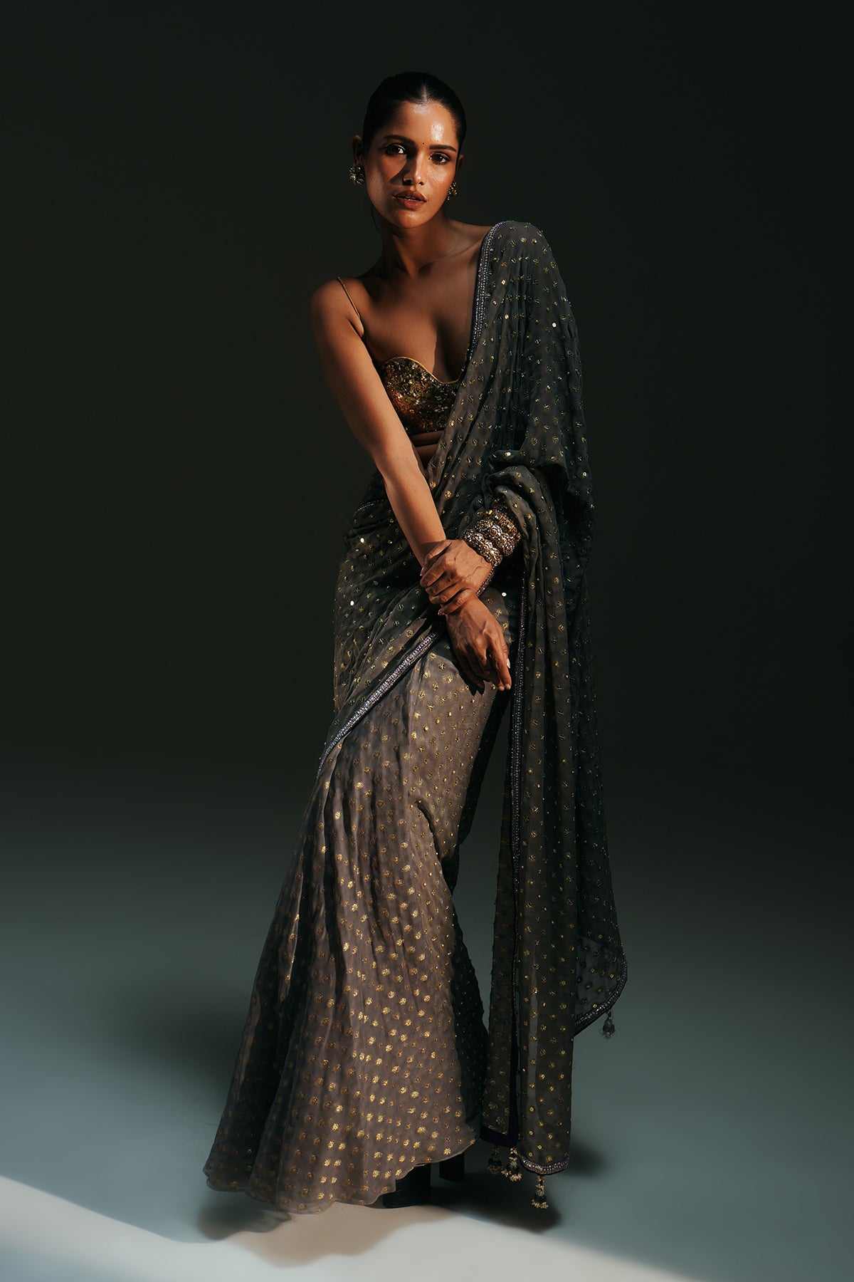 HAND EMBROIDERED PREDRAPED SAREE PAIRED WITH EMBROIDERED BRALETTE