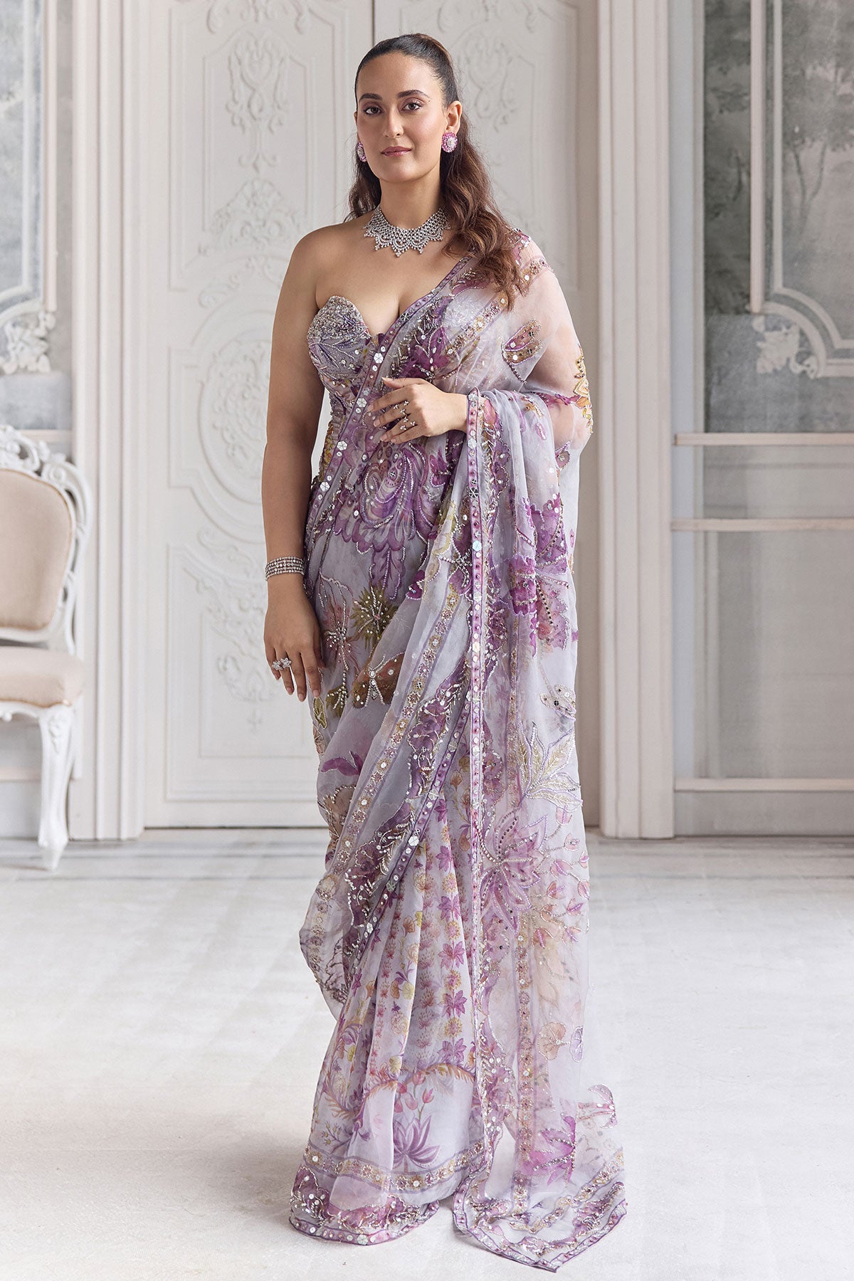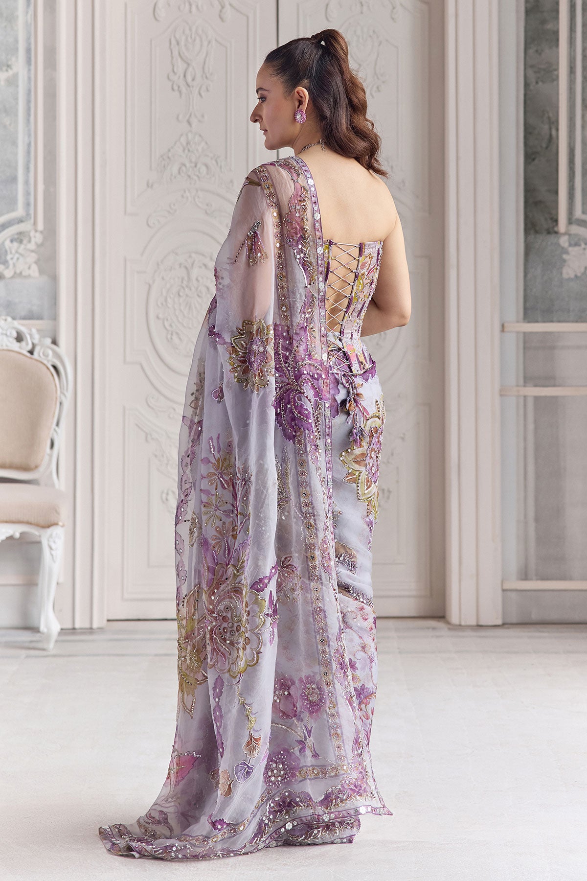 HEAVY EMBROIDERED CORSET TOP PAIRED WITH EMBROIDERED PREDRAPED SAREE