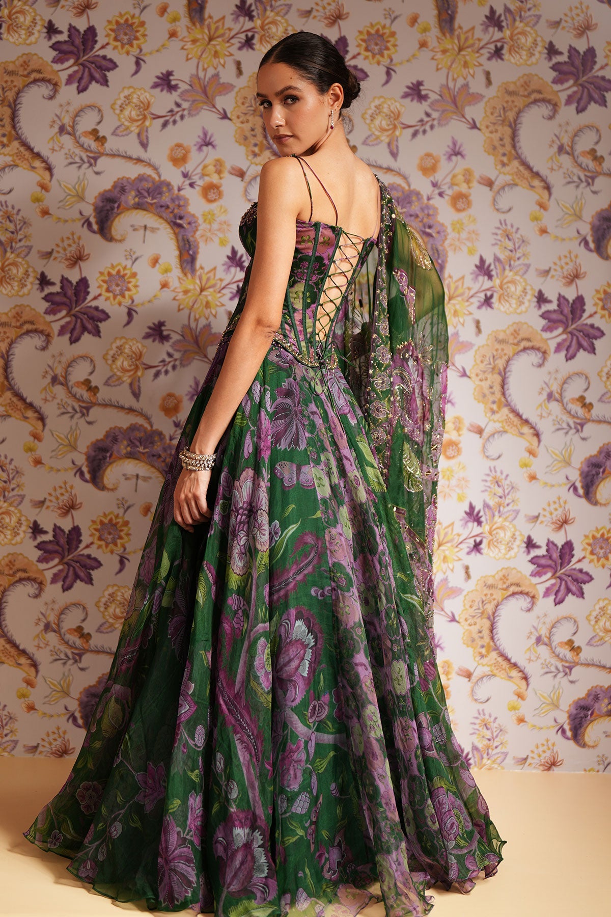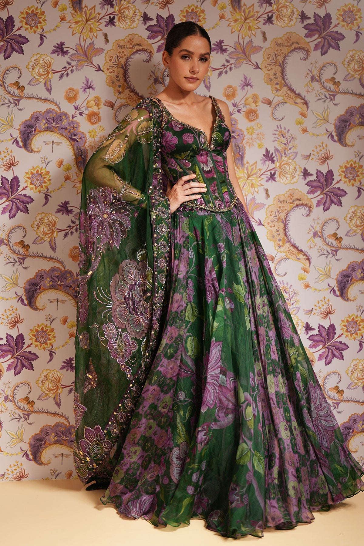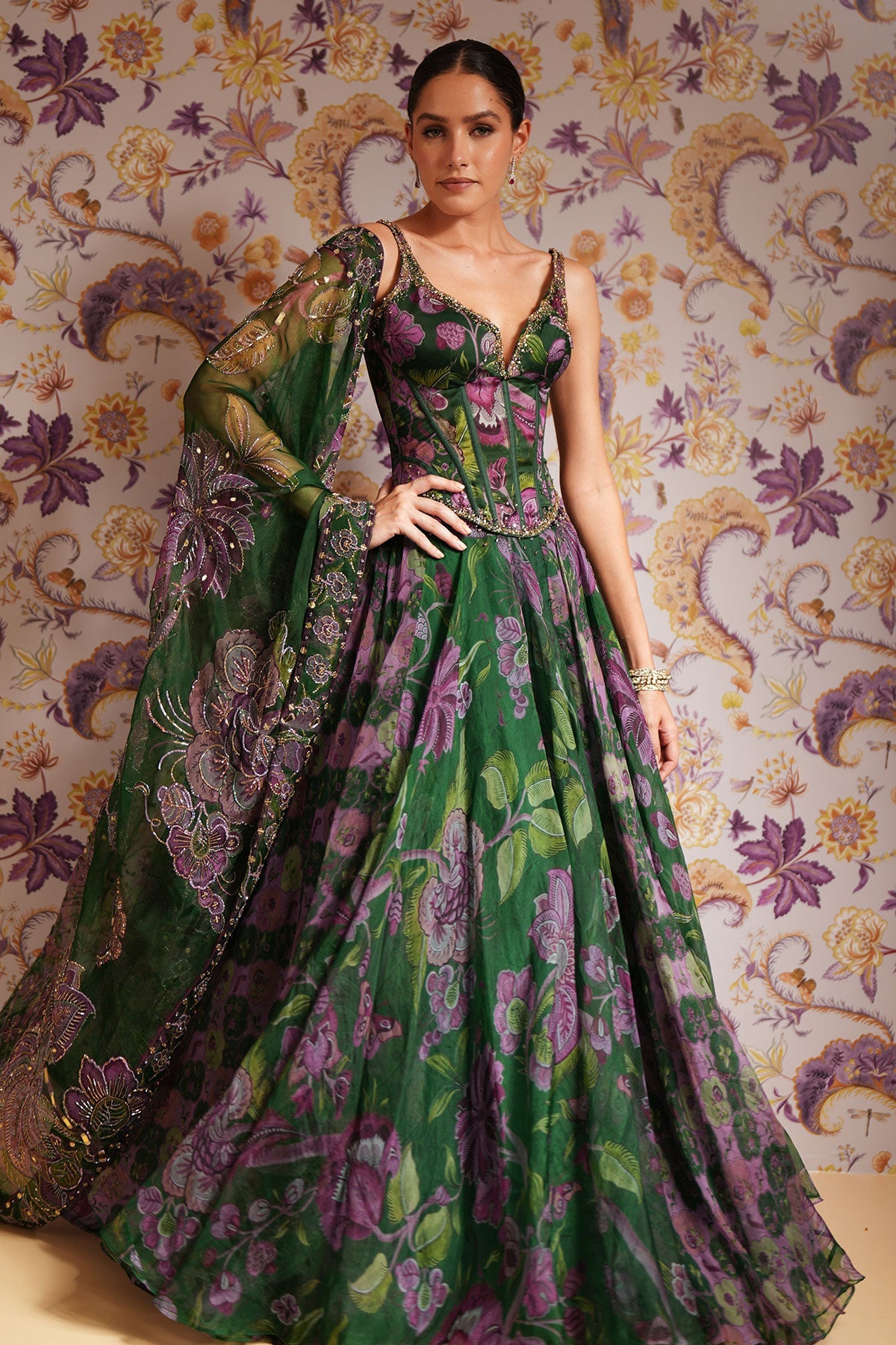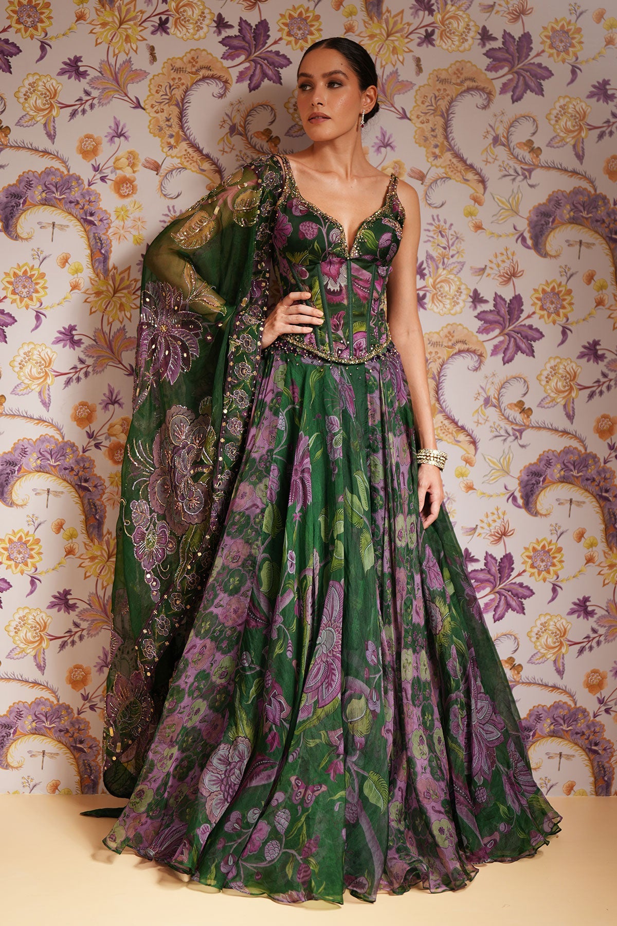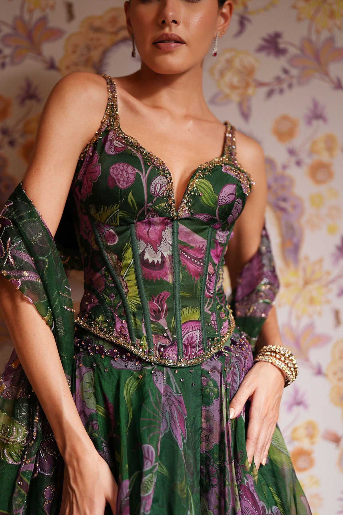 Embroidered Corset Paired With Floral Lehenga And Dupatta