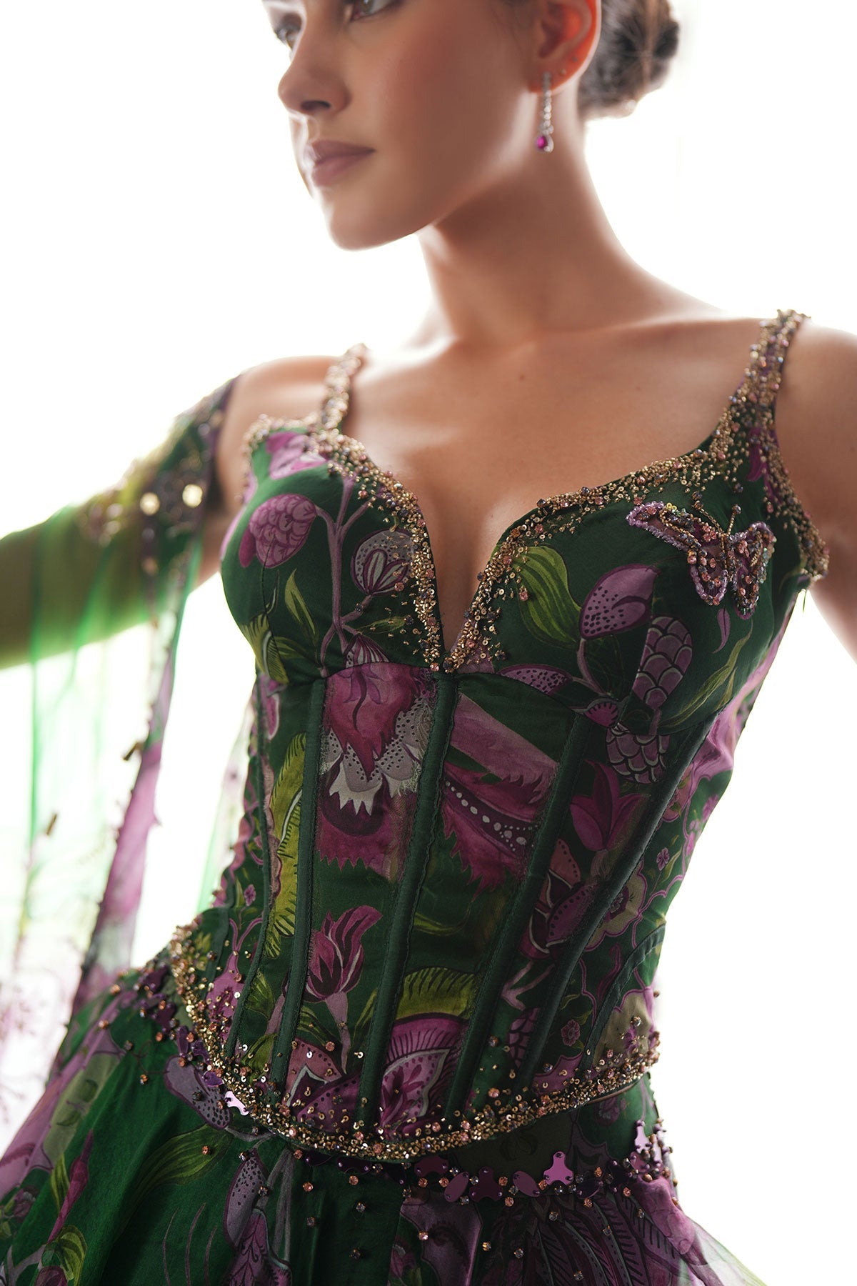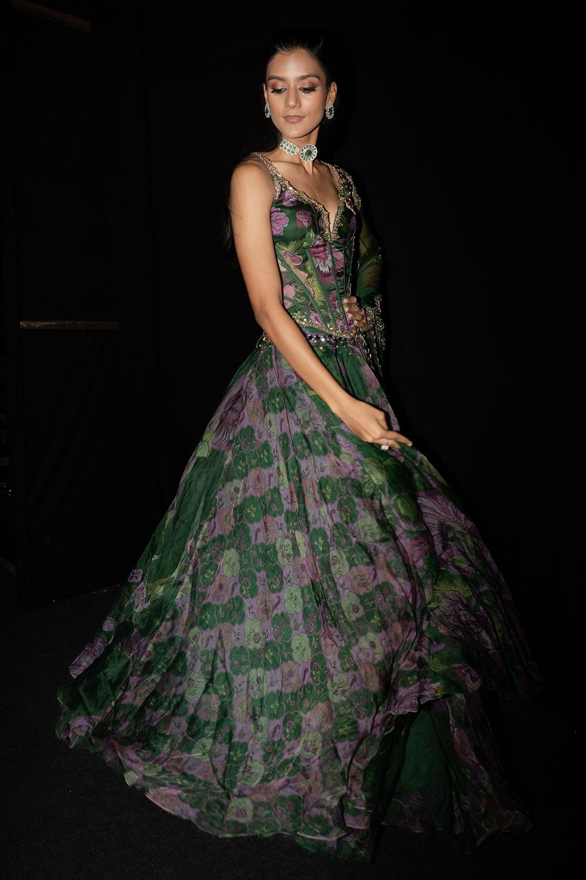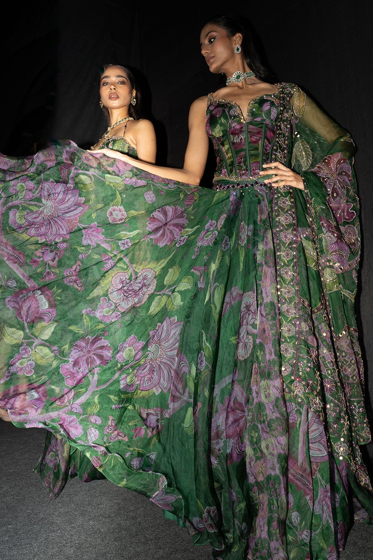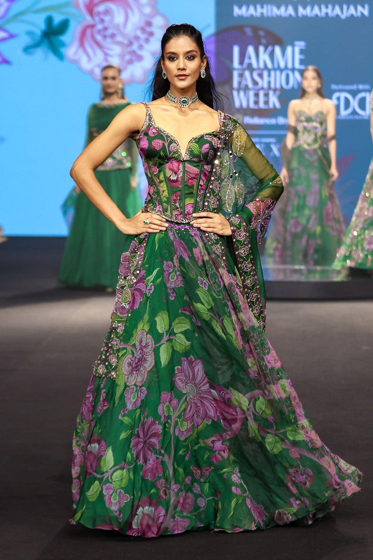 Embroidered Corset Paired With Floral Lehenga And Dupatta