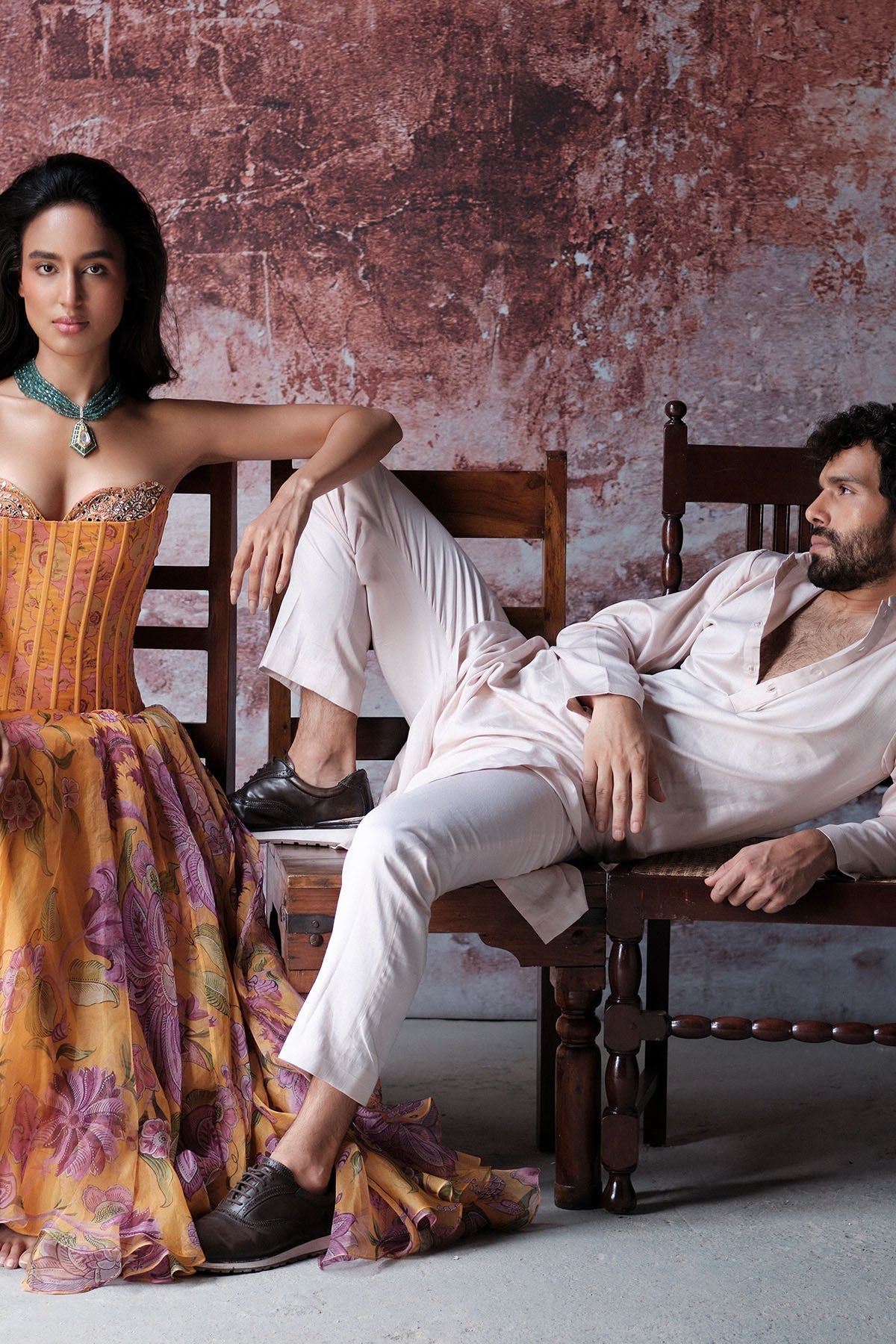 EMBROIDERED CORSET GOWN FEATURING A CINCHED BODICE WITH ADJUSTABLE TIE-UPS AT THE BACK