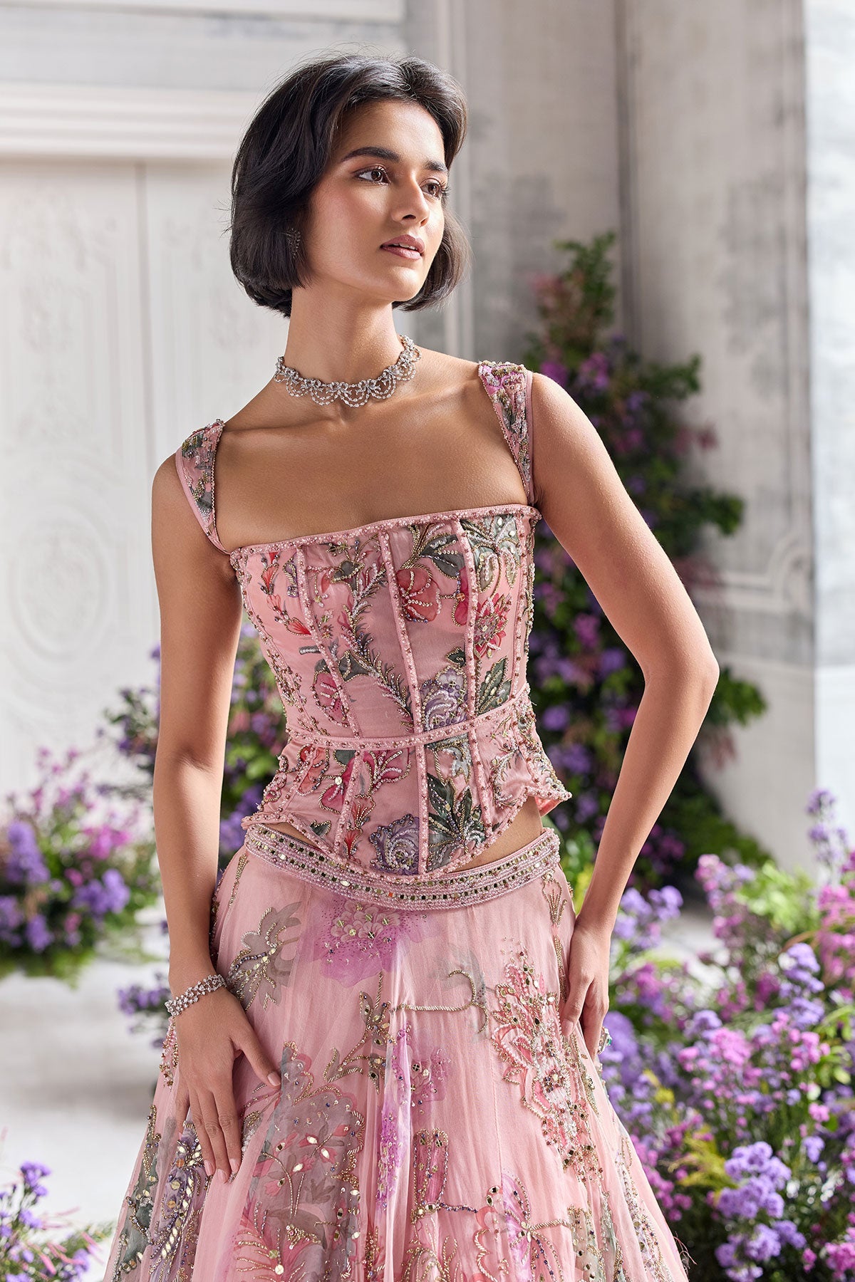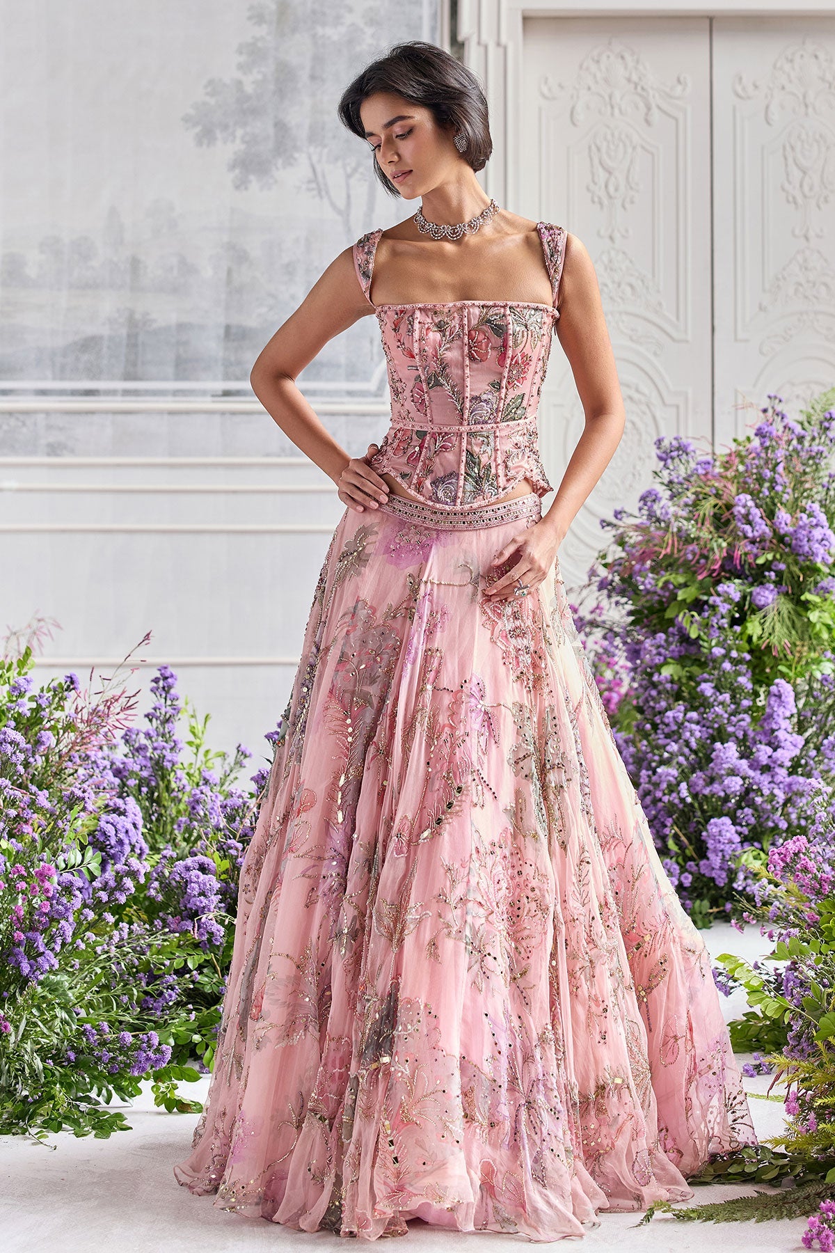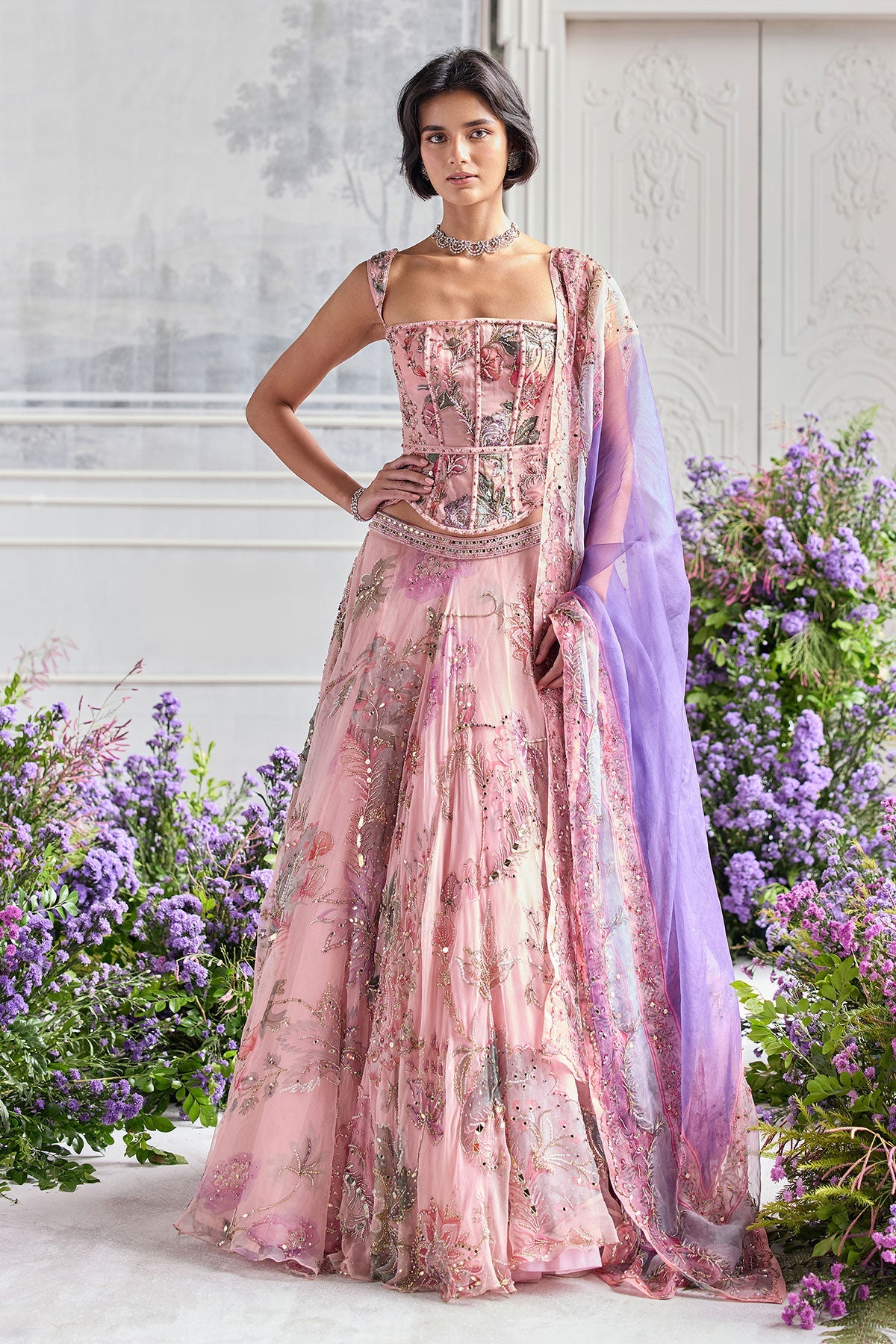 HAND EMBROIDERED CORSET FEATURING DETACHABLE STRAPS AND EMBROIDERED LEHENGA PAIRED WITH CONTRAST DUPATTA