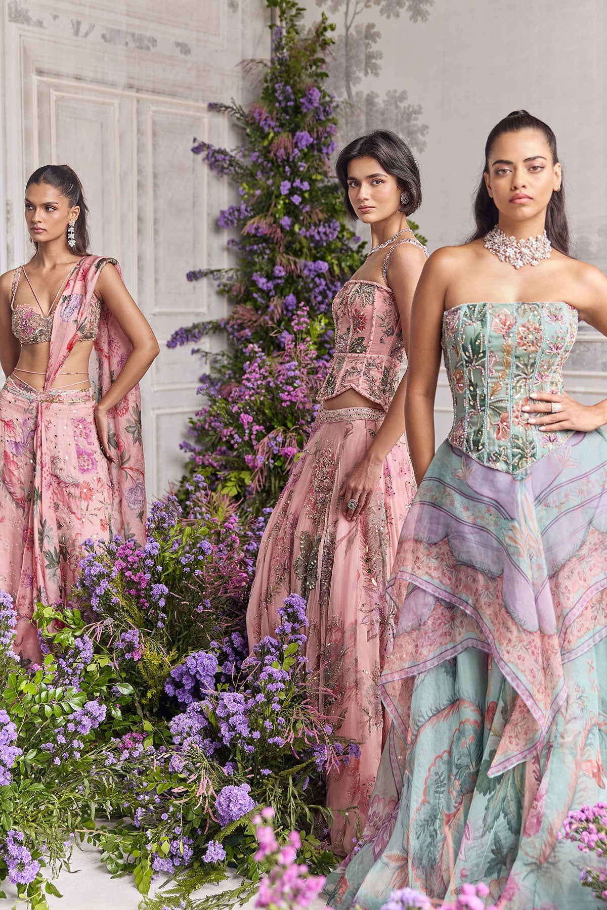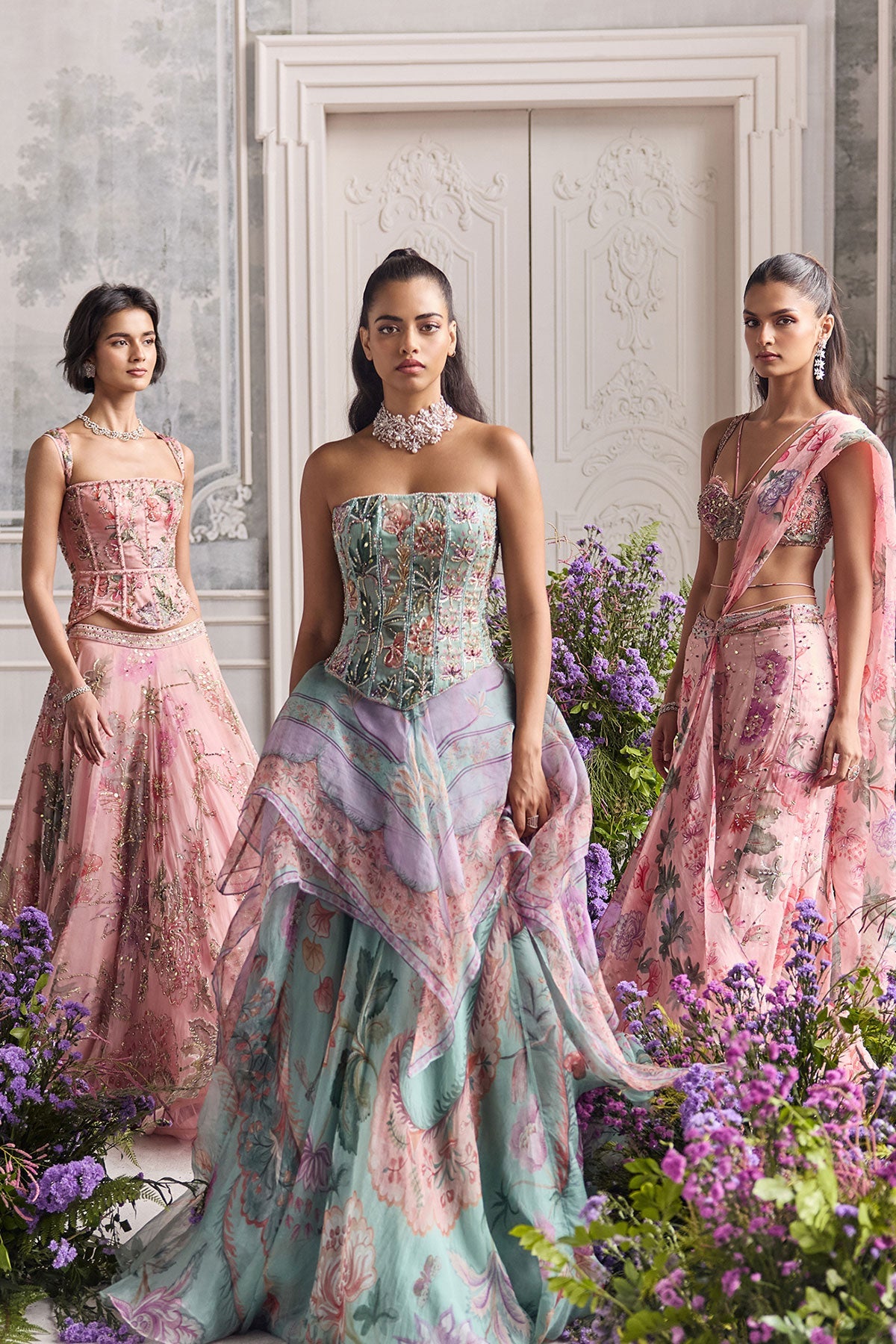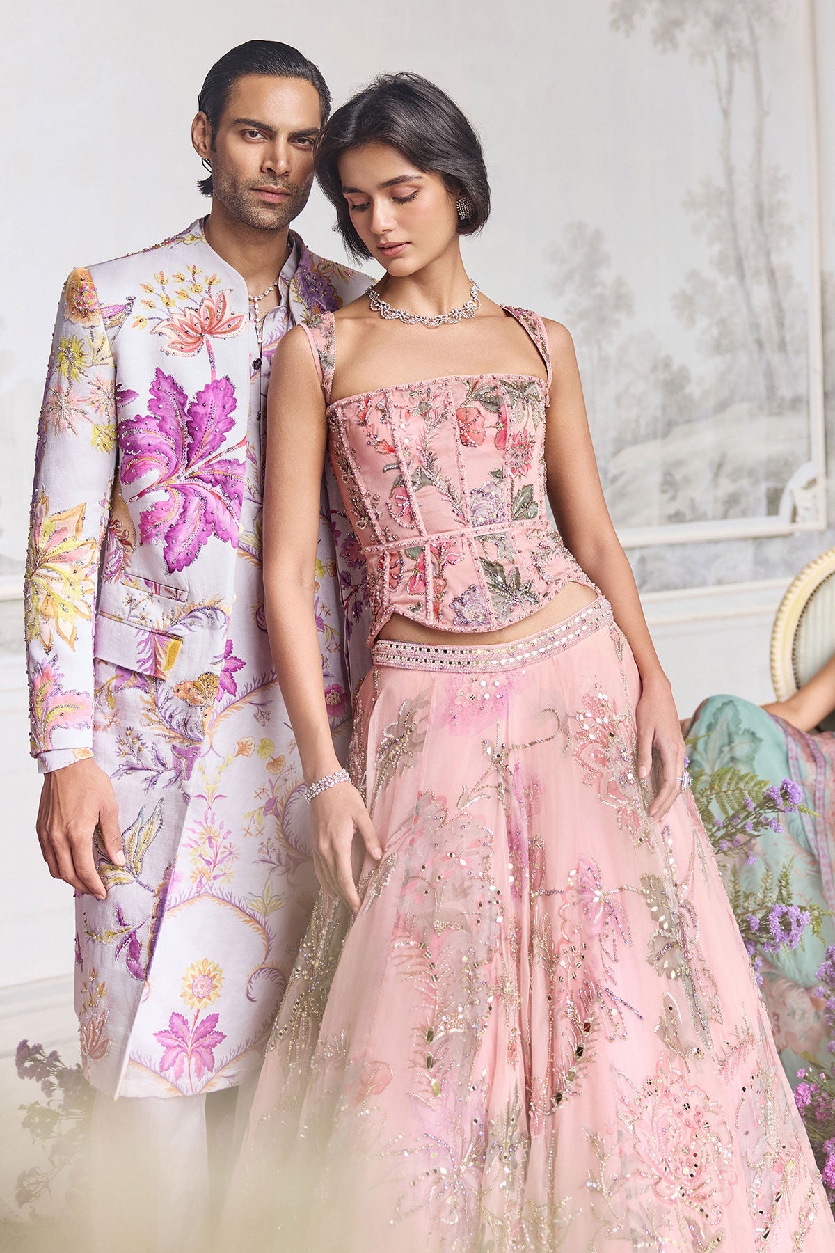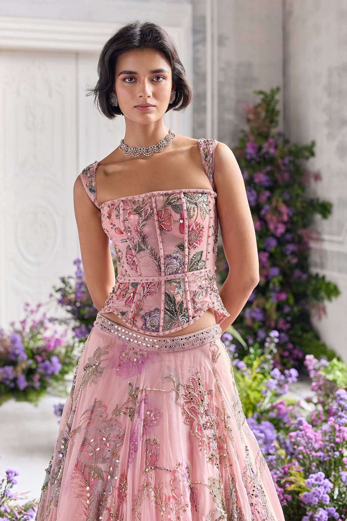 HAND EMBROIDERED CORSET FEATURING DETACHABLE STRAPS AND EMBROIDERED LEHENGA PAIRED WITH CONTRAST DUPATTA