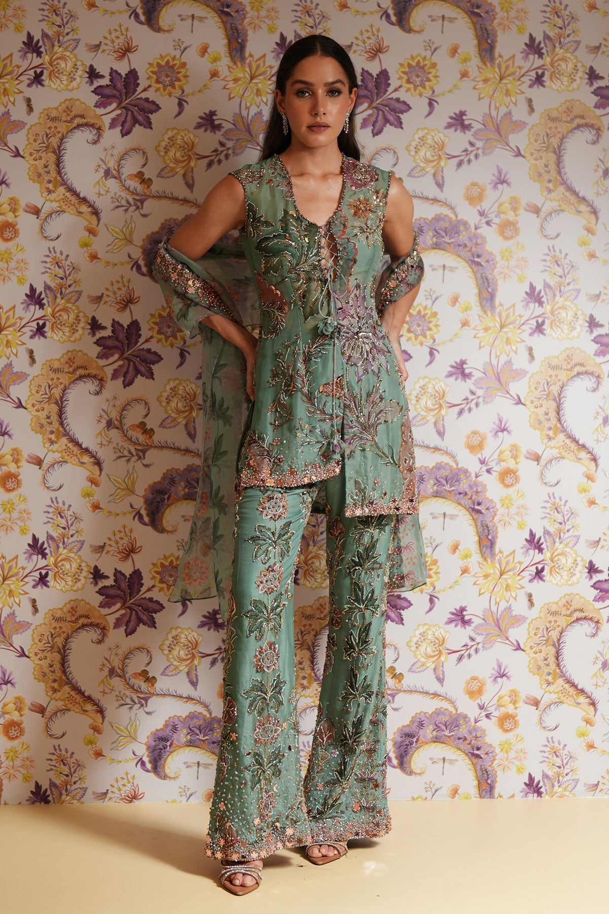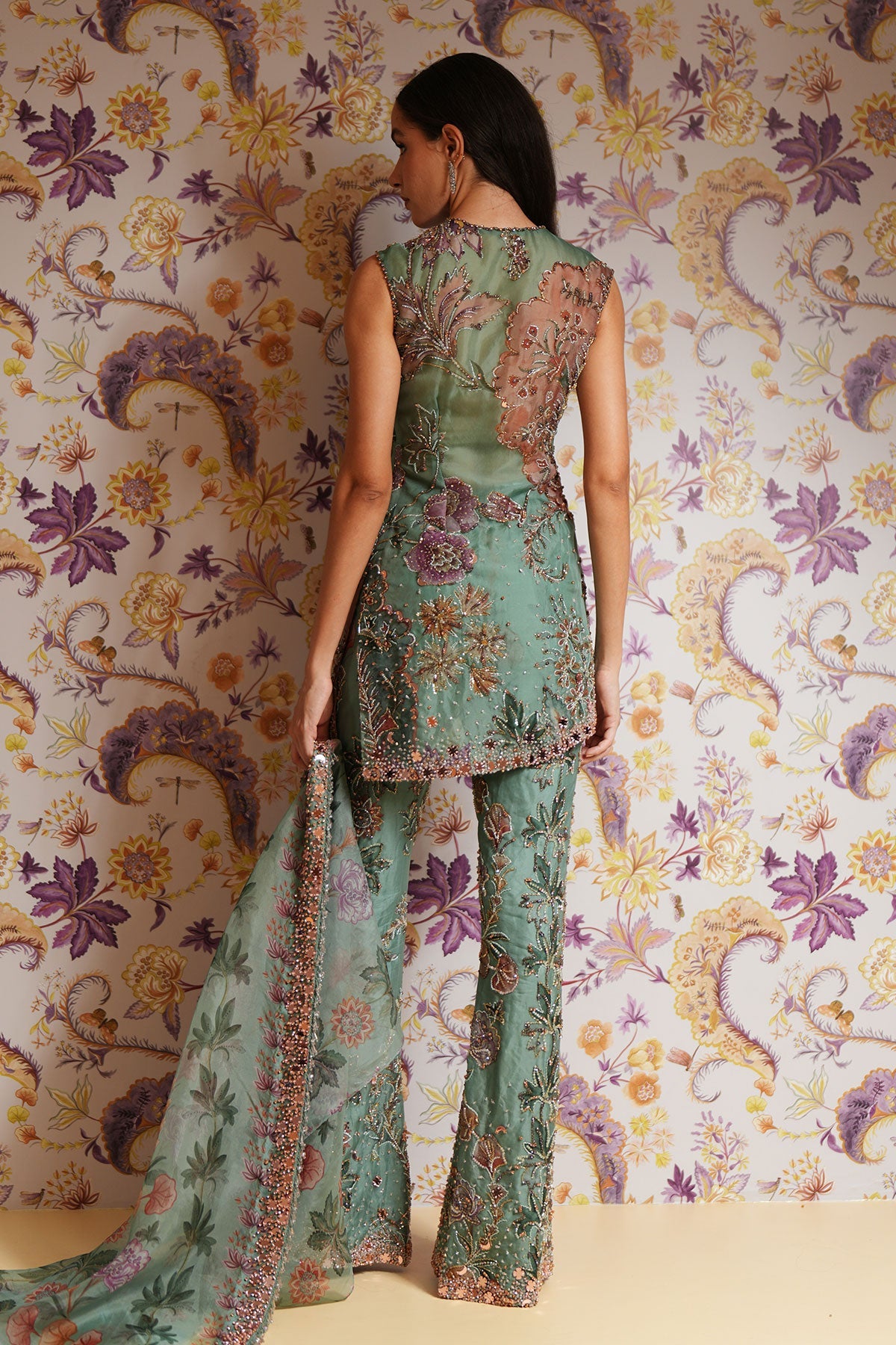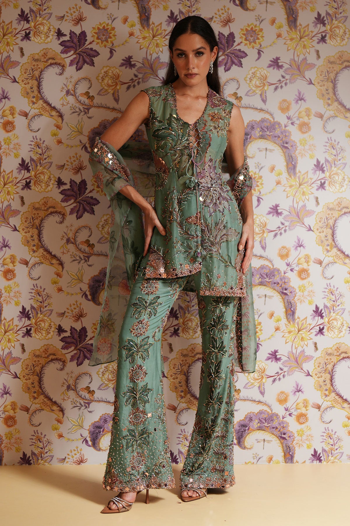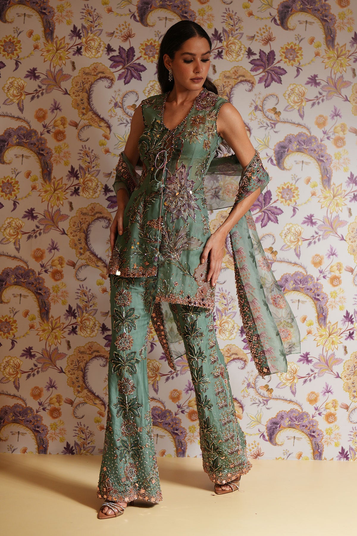 Hand Embroidered Short Kurta Paired With Embroidered Straight Pants And Dupatta
