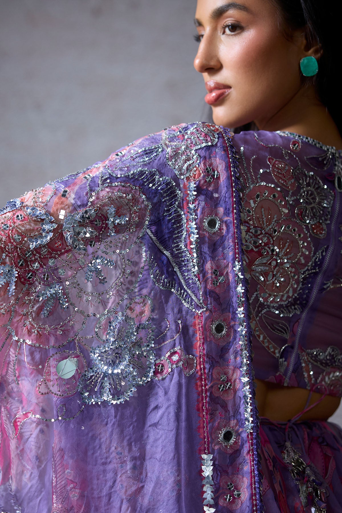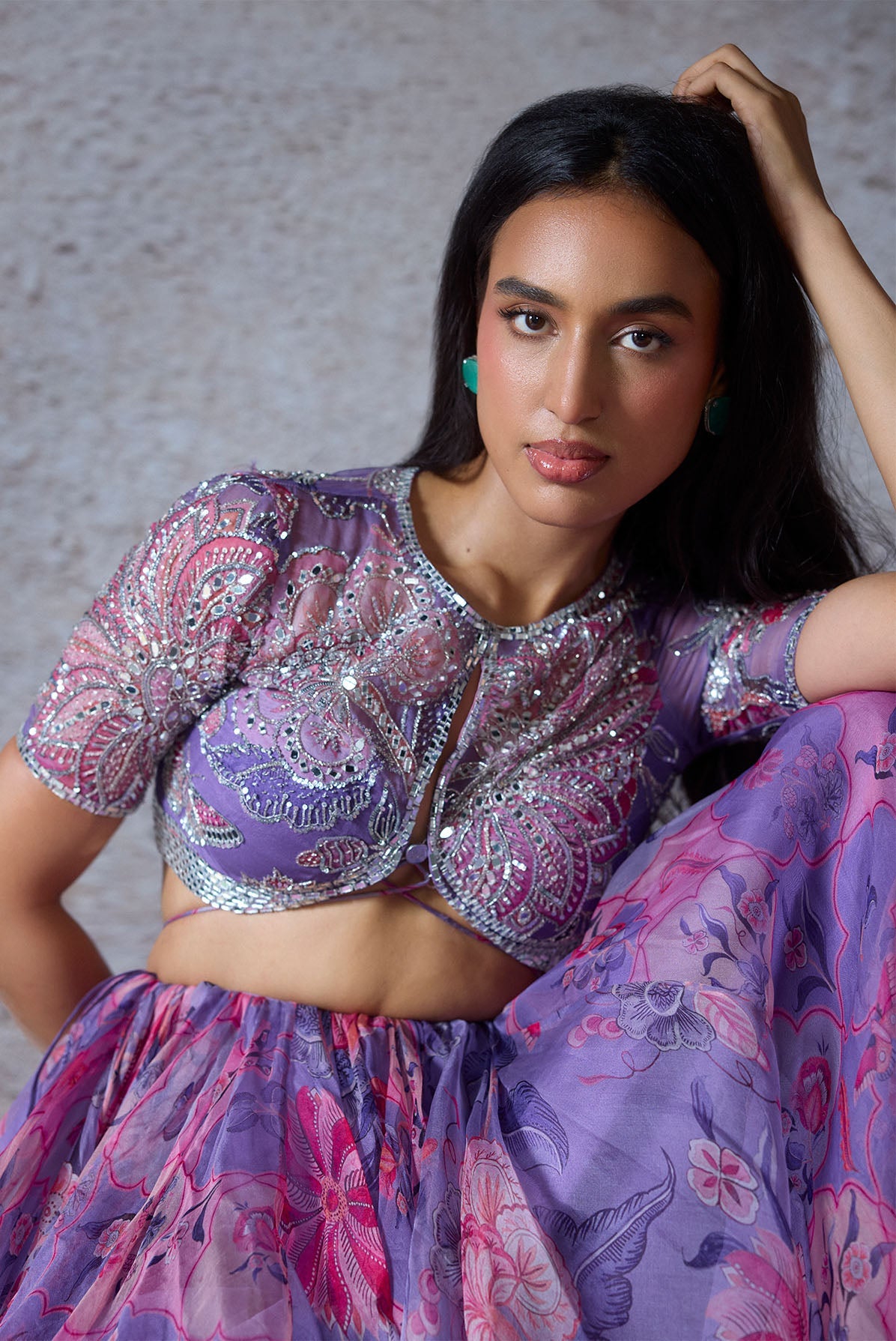 EMBROIDERED BLOUSE WITH OUR SIGNATURE STRINGS PAIRED WITH A PRINTED LEHENGA AND EMBROIDERED DUPATTA