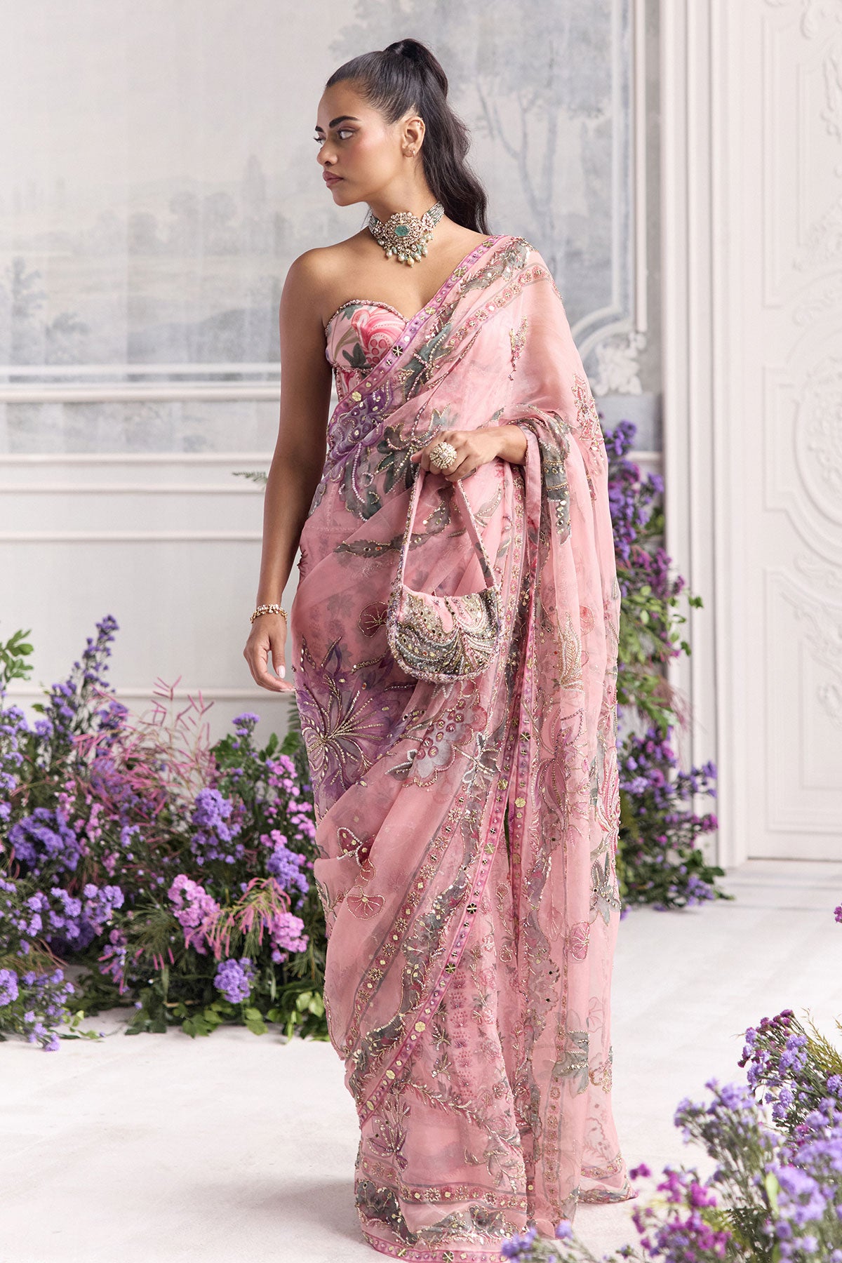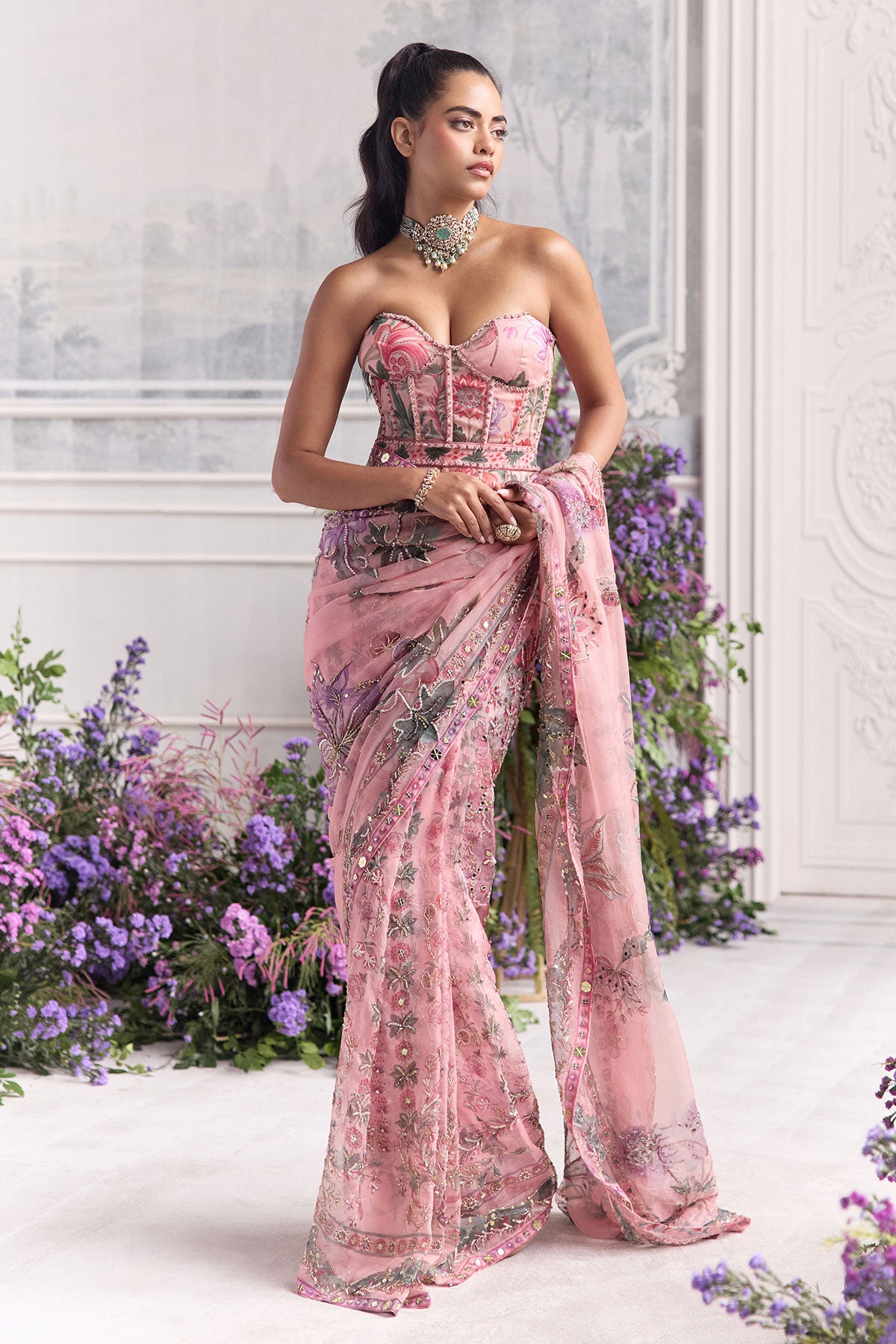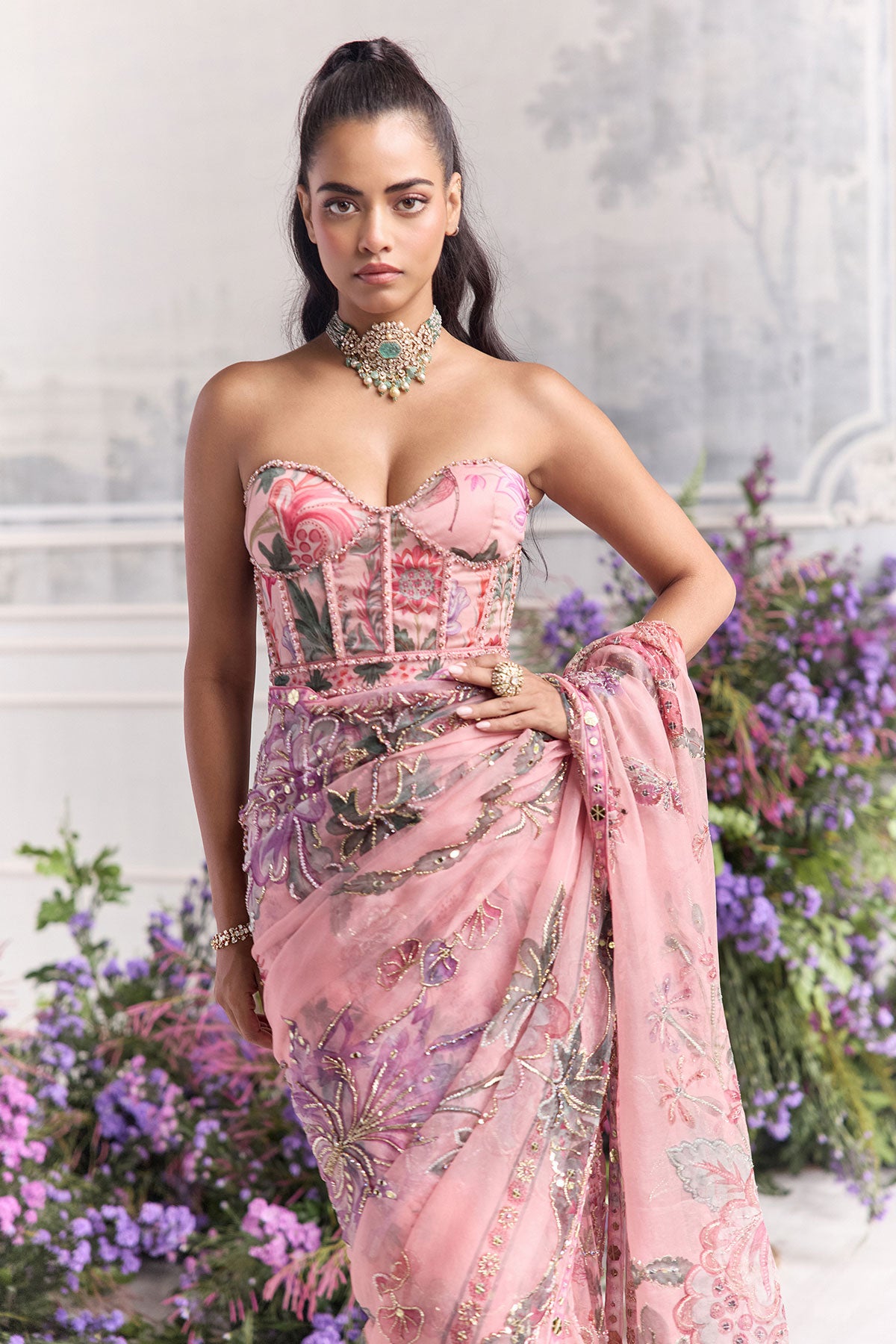 HAND EMBROIDERED CORSET PAIRED WITH HEAVY EMBRODEIRED PREDRAPED SAREE