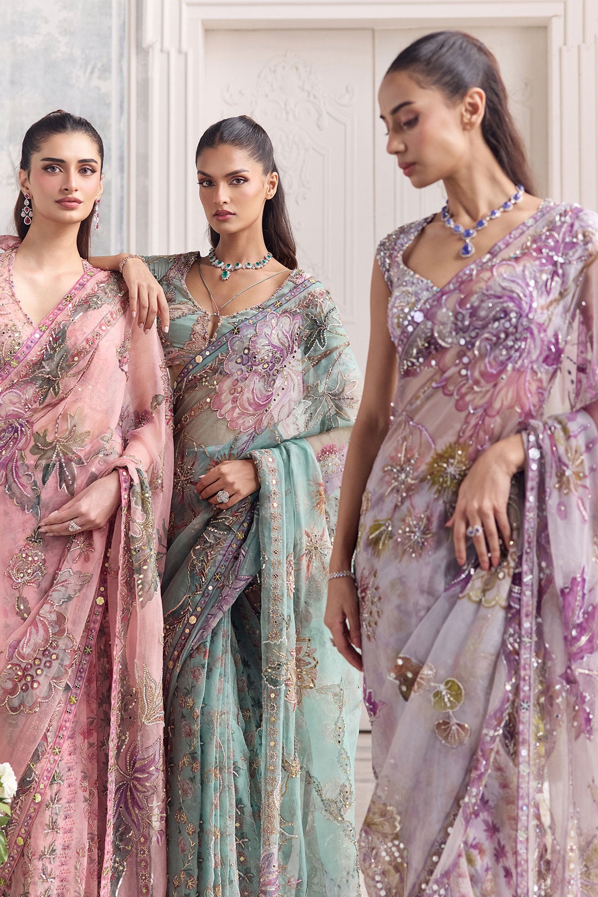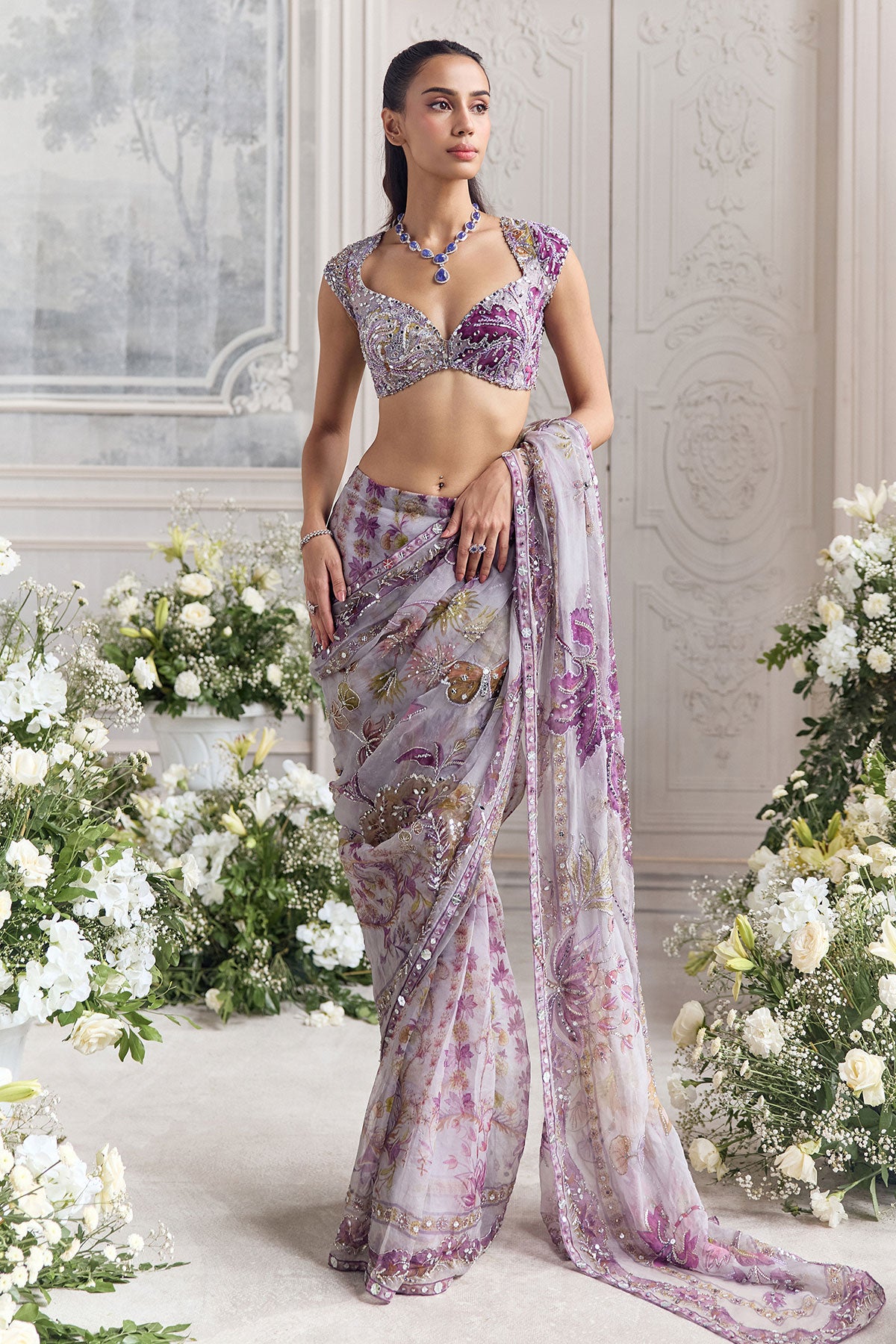 CAP SLEEVES EMBROIDERED BLOUSE PAIRED WITH EMBROIDERED PREDRAPED SAREE
