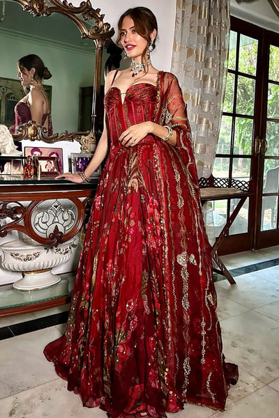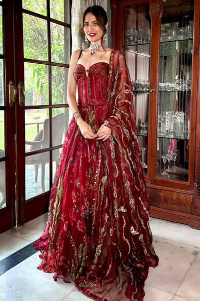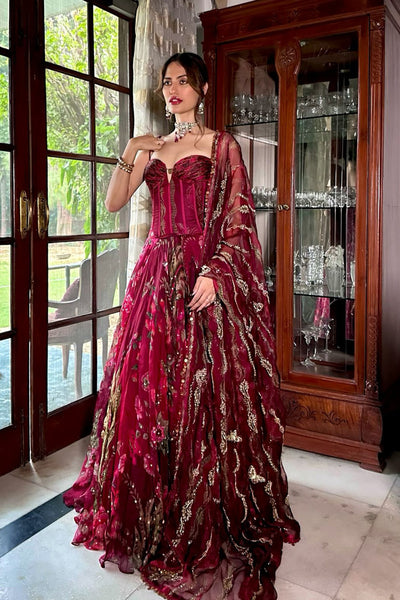 Pleated Signature Mm Corset Paired with An Embellished Lehenga and Duppata