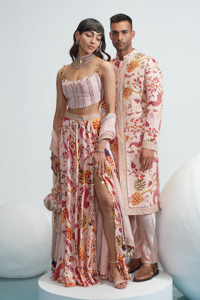 Nude embroidered lehenga, embroidered blouse and organza embroidered dupatta with hem tassel detaling set
