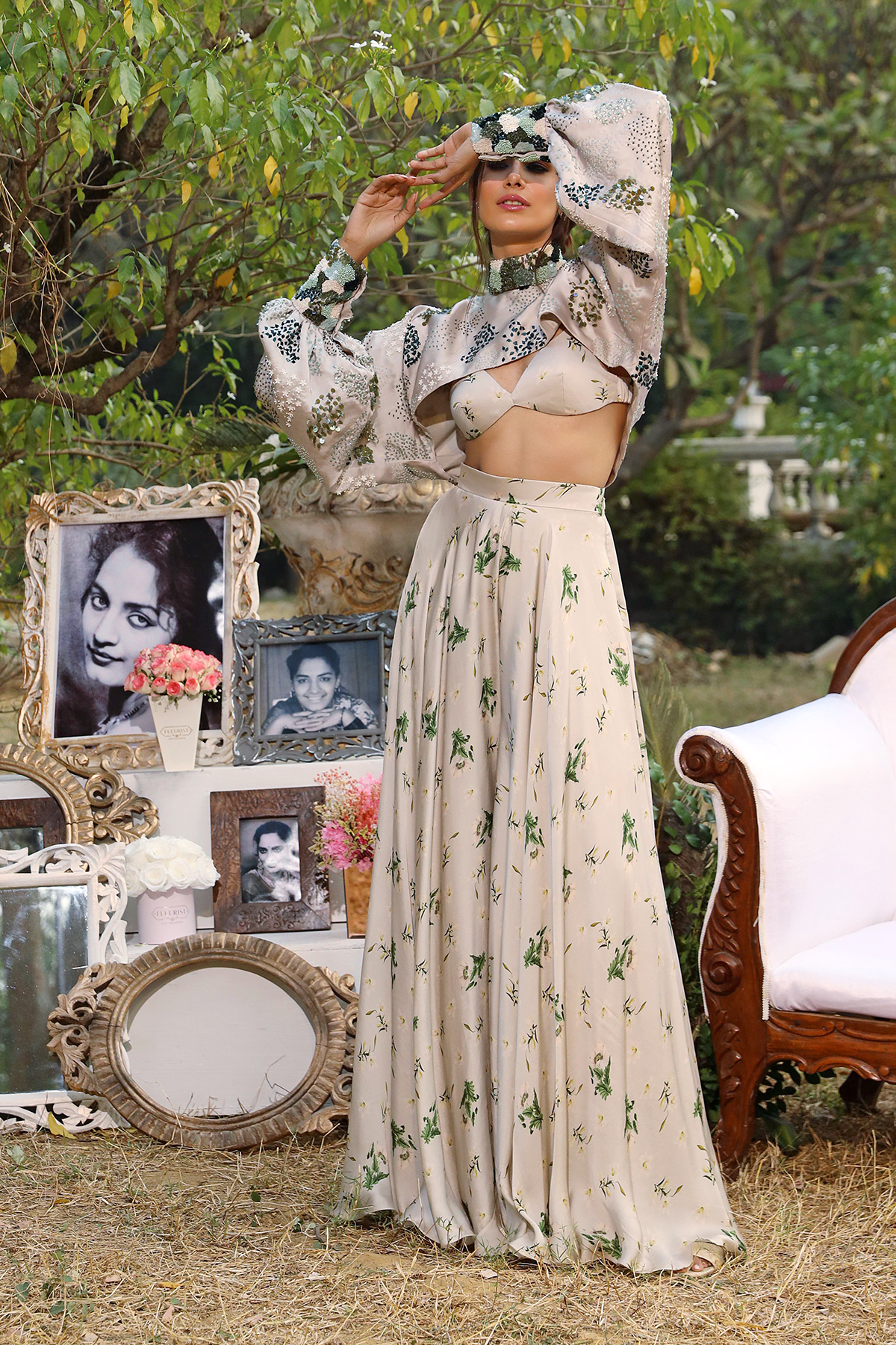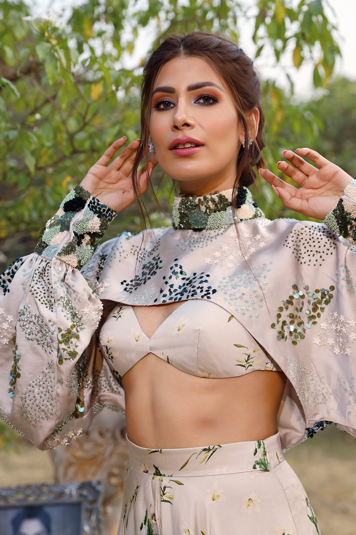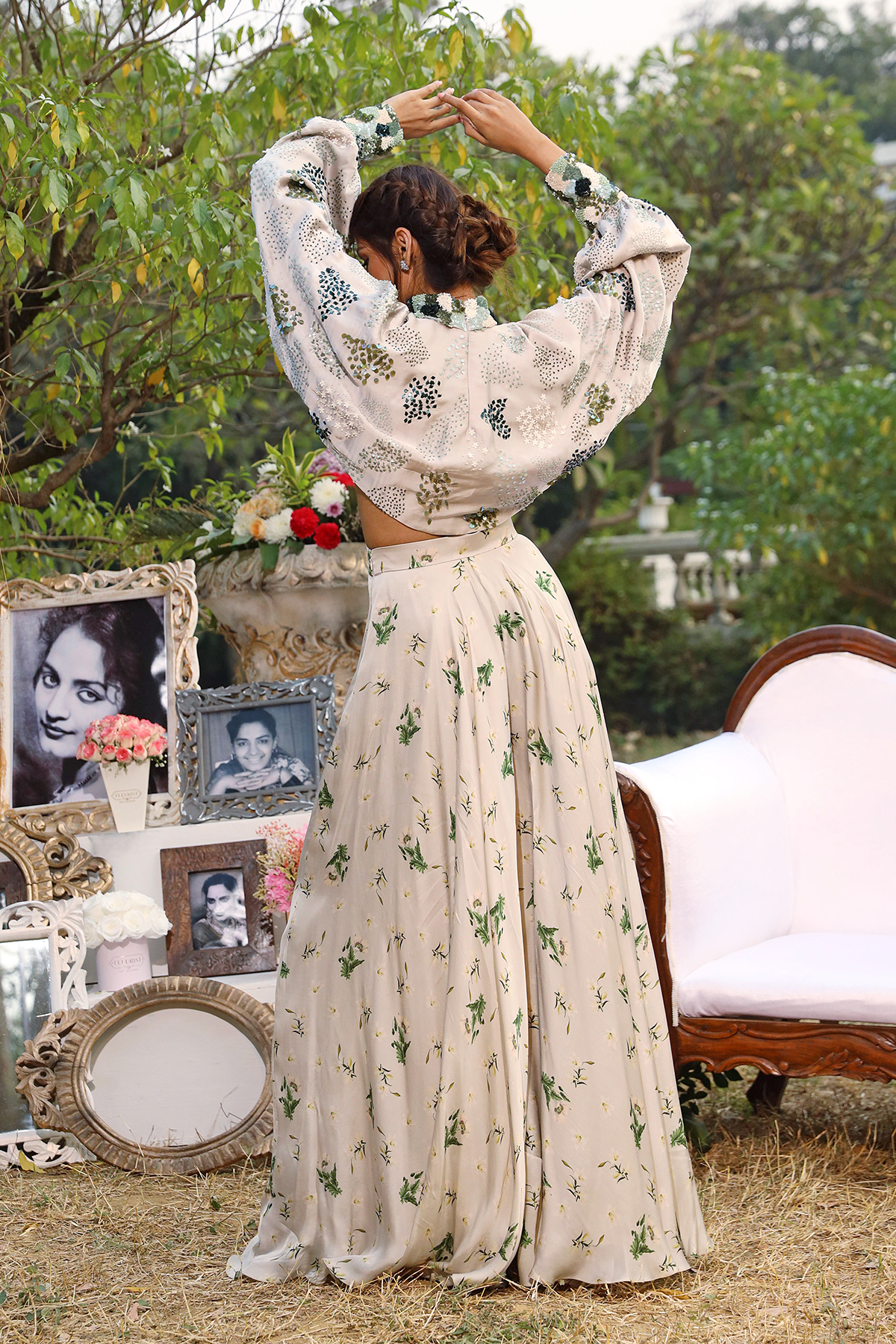 Jade printed chinoon palazoo and bikini blouse with modal satin embroidered pullover