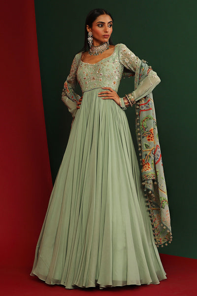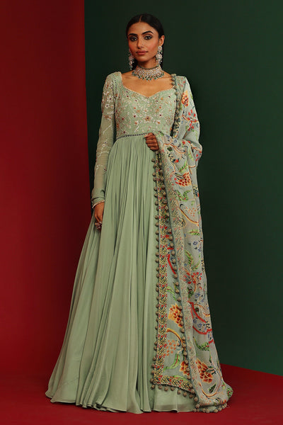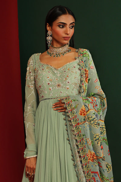 Jade embroidered anarkali in georgette and printed dupatta with hand made tassels